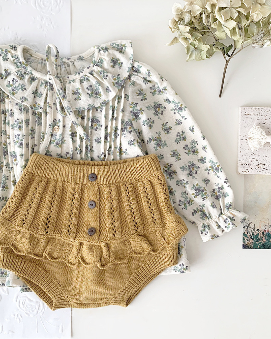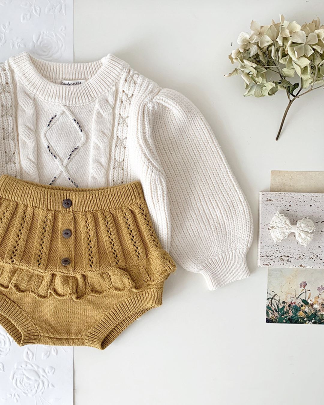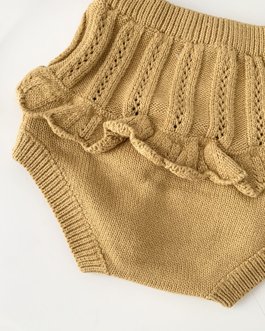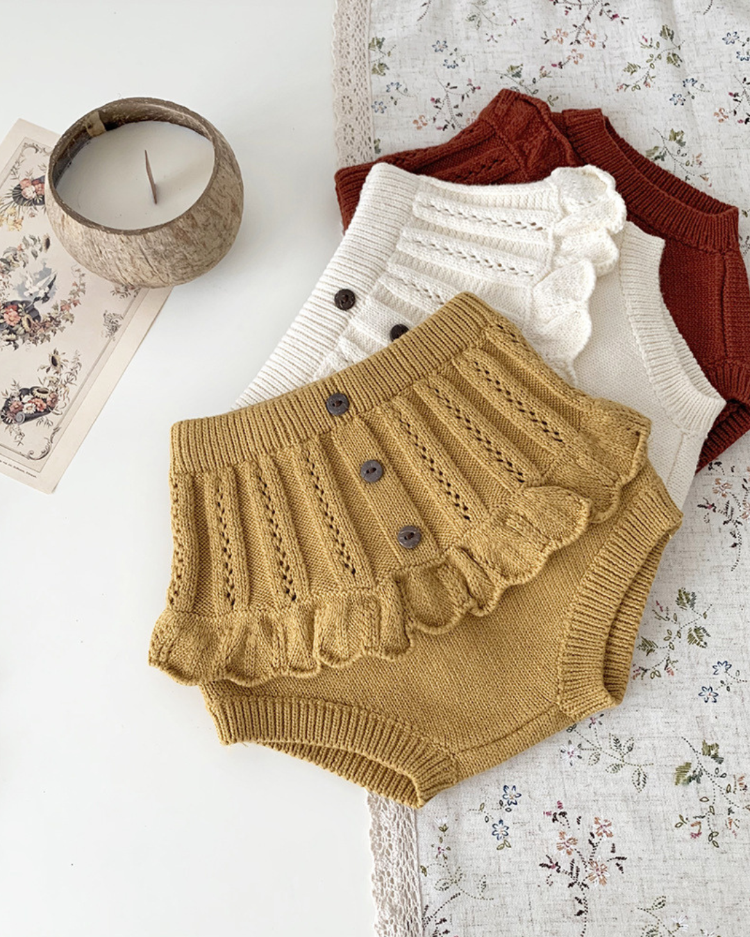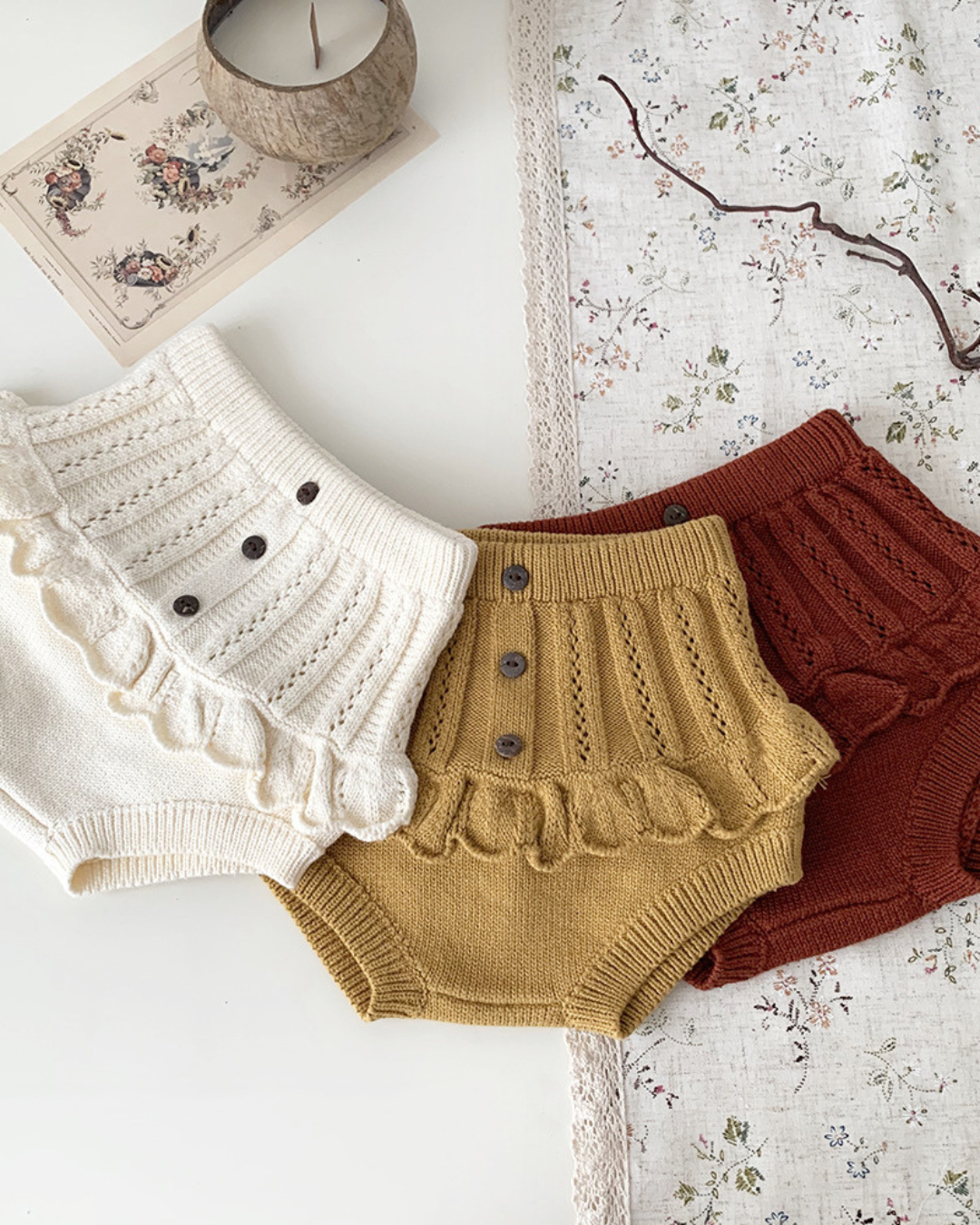 柔らかなニット素材で仕立てた可愛いブルマパンツ。フロントのボタンと裾のフリルデザインが上品で、シンプルなトップスやワンピースとも相性抜群です。伸縮性のあるウエストで動きやすく、普段使いからお出かけコーデまで大活躍。オールシーズン使える万能アイテムです♡