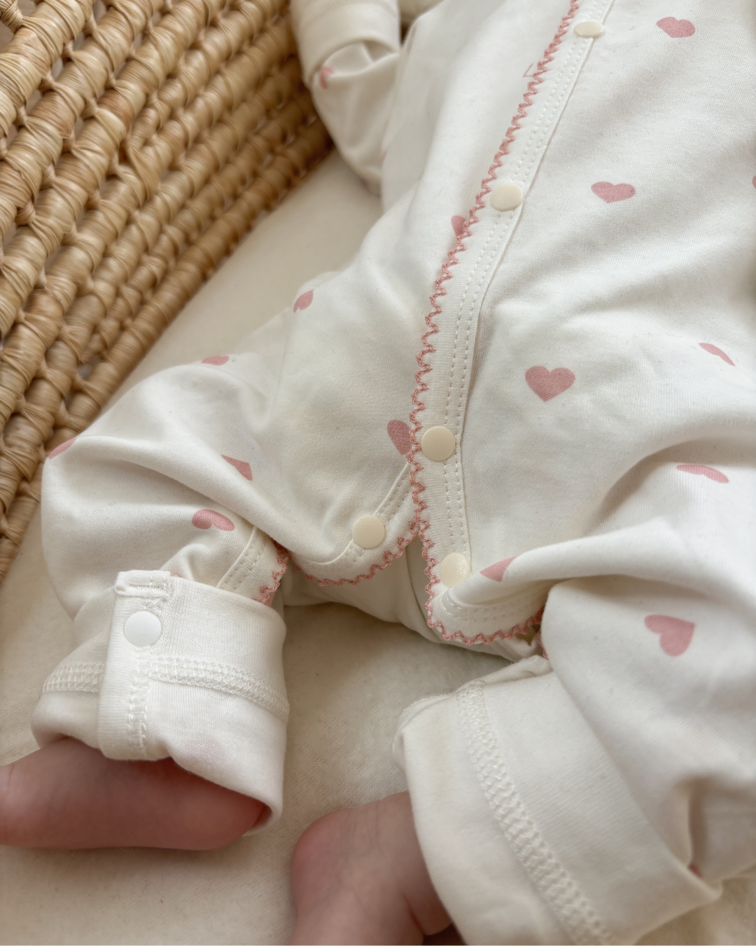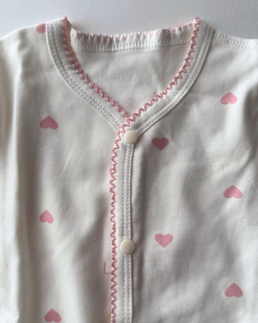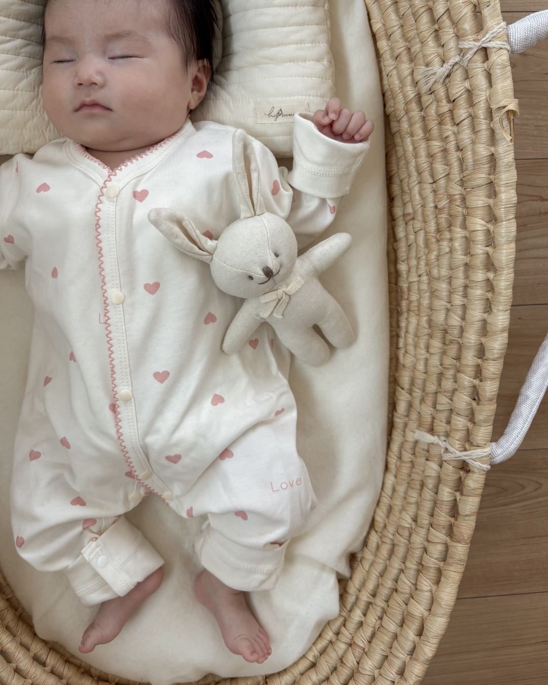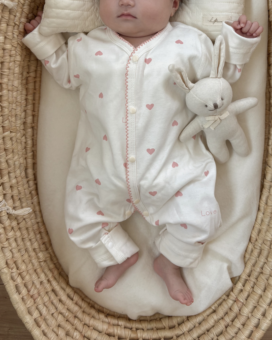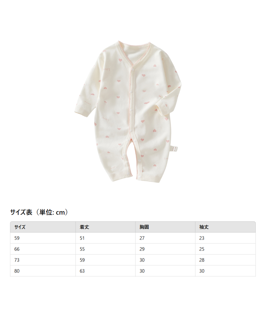 小さなハート柄が全体に散りばめられた、ラブリーなベビーカバーオール。前開きタイプでお着替えやオムツ替えもラクラク。柔らかいコットン素材で赤ちゃんの肌にやさしく、安心してデイリーに使える一枚です。ギフトにもおすすめのアイテムです♡