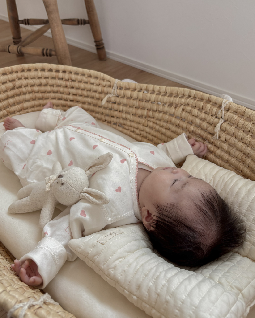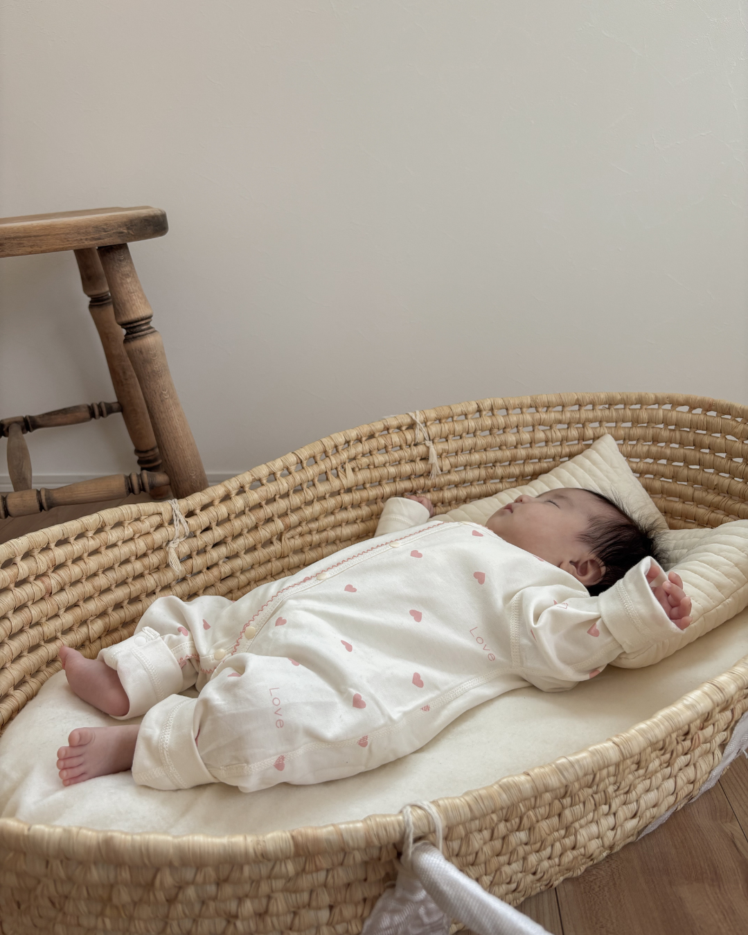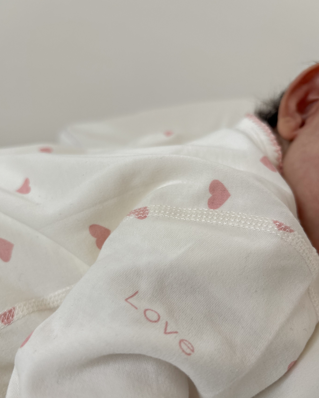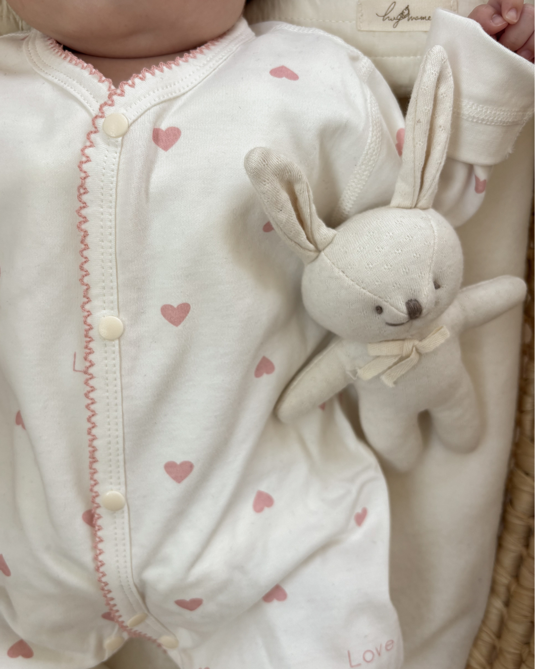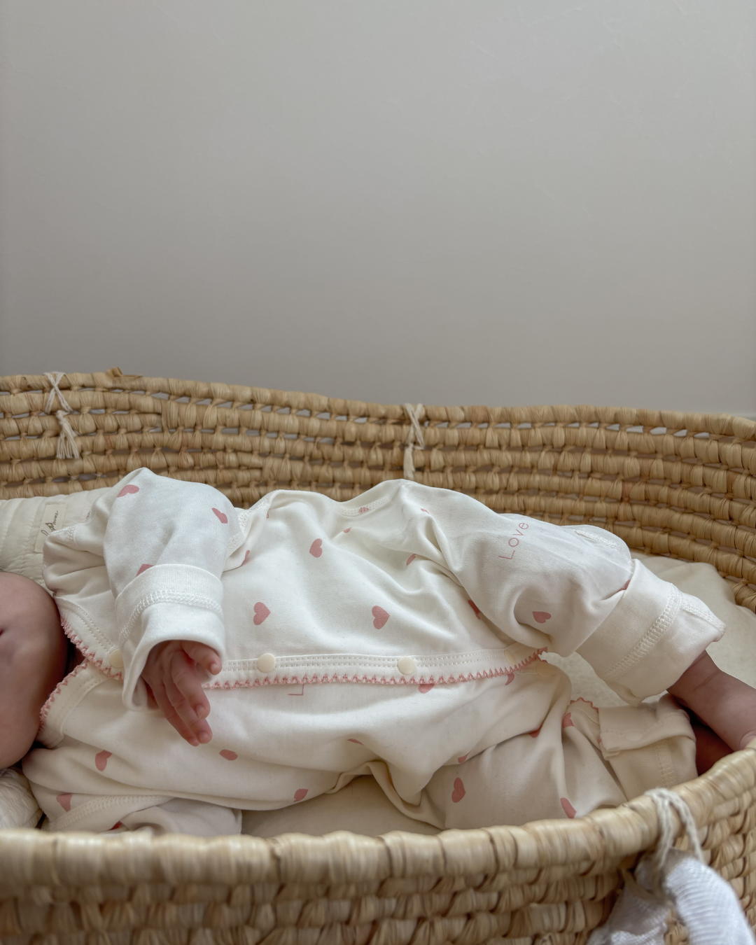 小さなハート柄が全体に散りばめられた、ラブリーなベビーカバーオール。前開きタイプでお着替えやオムツ替えもラクラク。柔らかいコットン素材で赤ちゃんの肌にやさしく、安心してデイリーに使える一枚です。ギフトにもおすすめのアイテムです♡