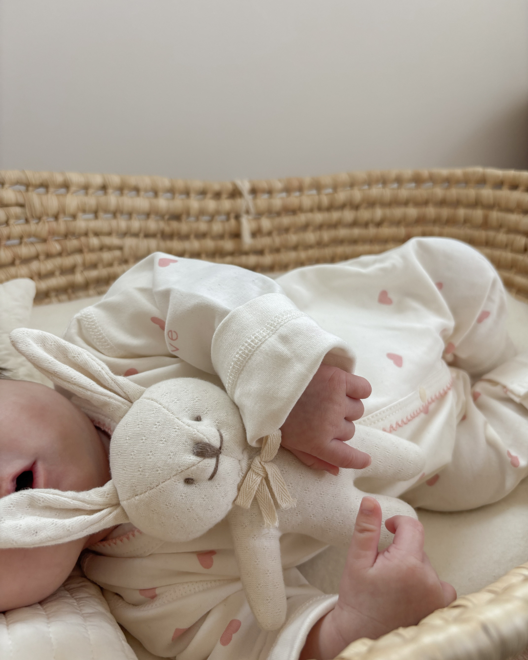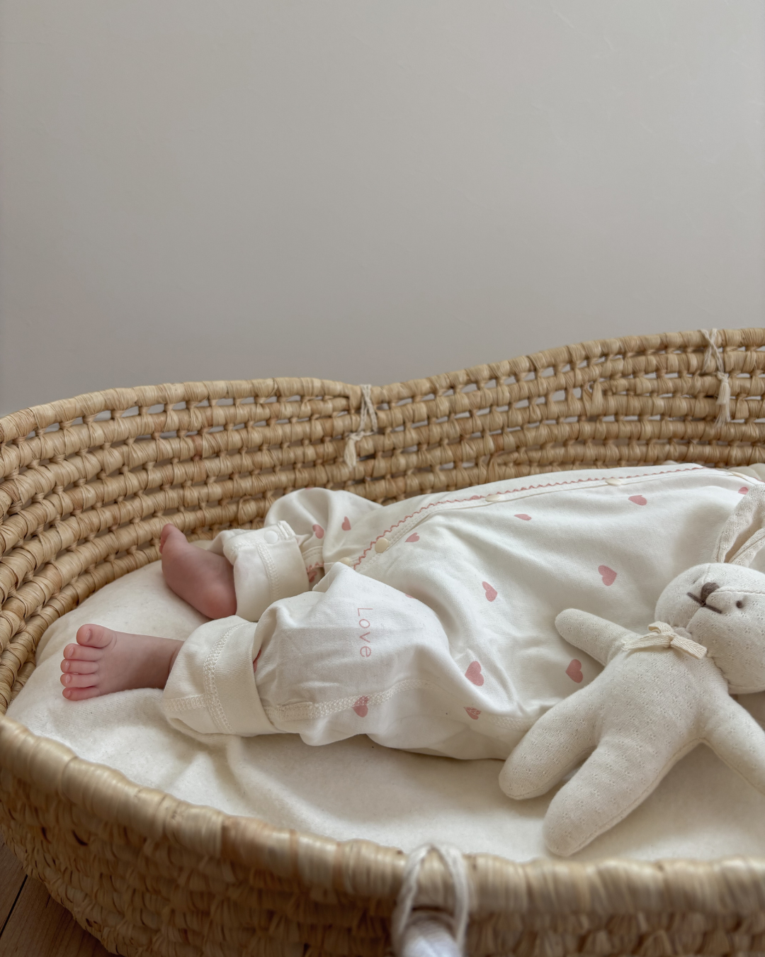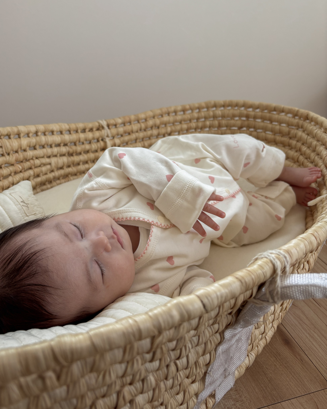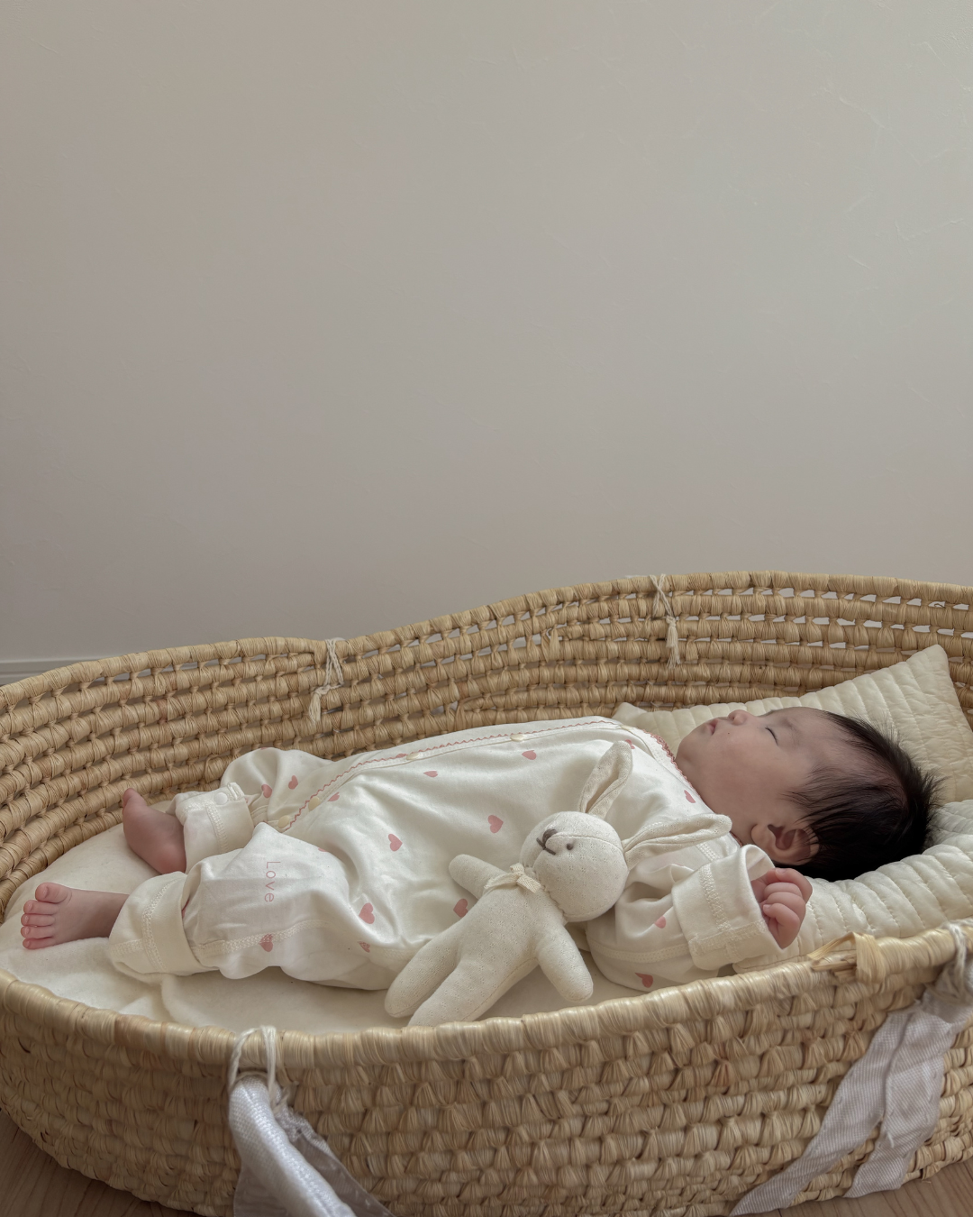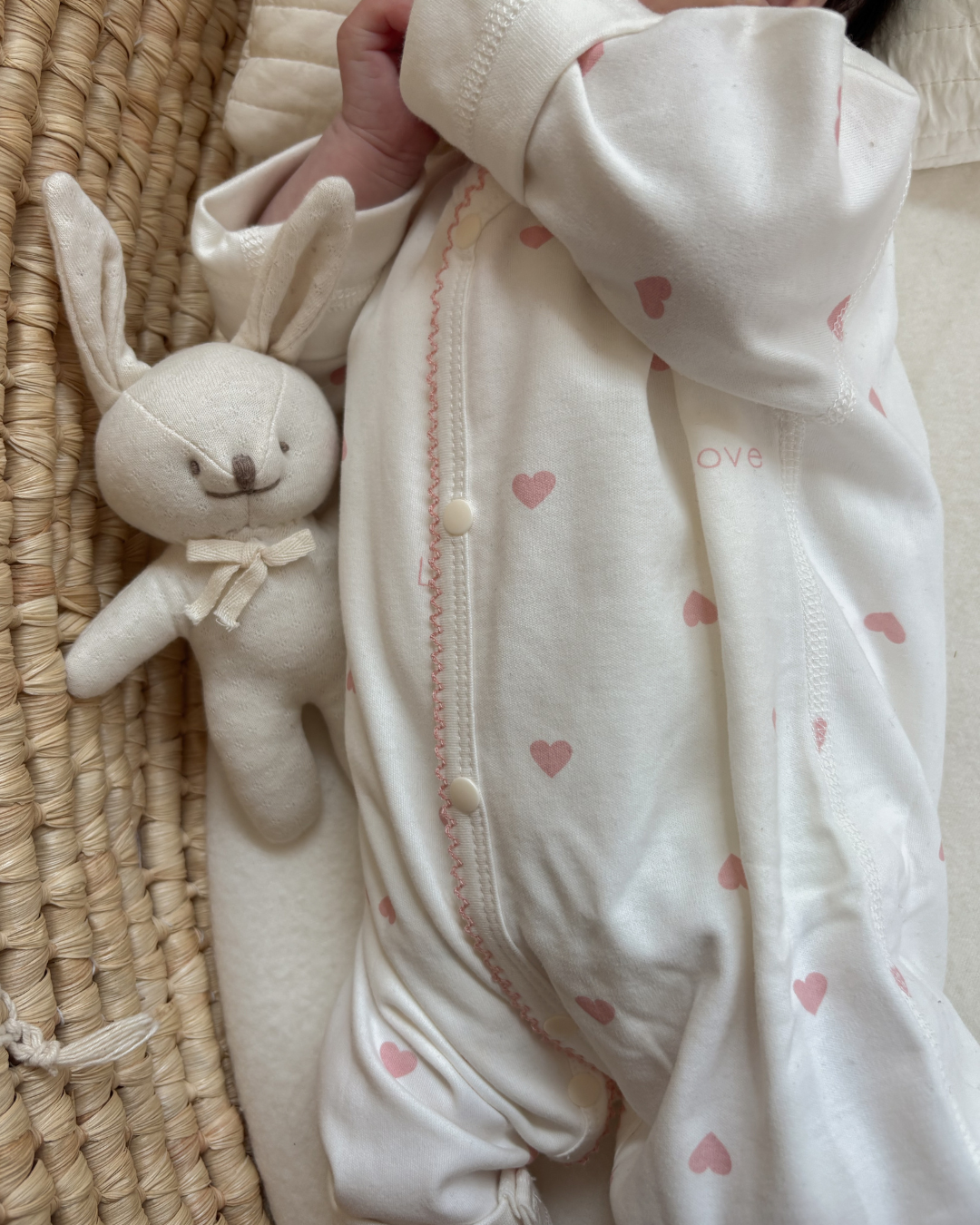 小さなハート柄が全体に散りばめられた、ラブリーなベビーカバーオール。前開きタイプでお着替えやオムツ替えもラクラク。柔らかいコットン素材で赤ちゃんの肌にやさしく、安心してデイリーに使える一枚です。ギフトにもおすすめのアイテムです♡