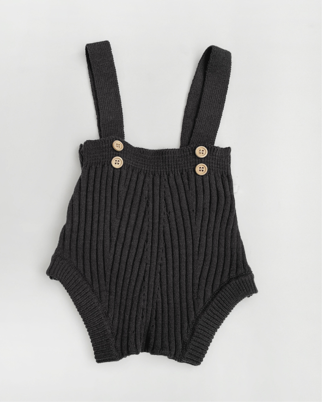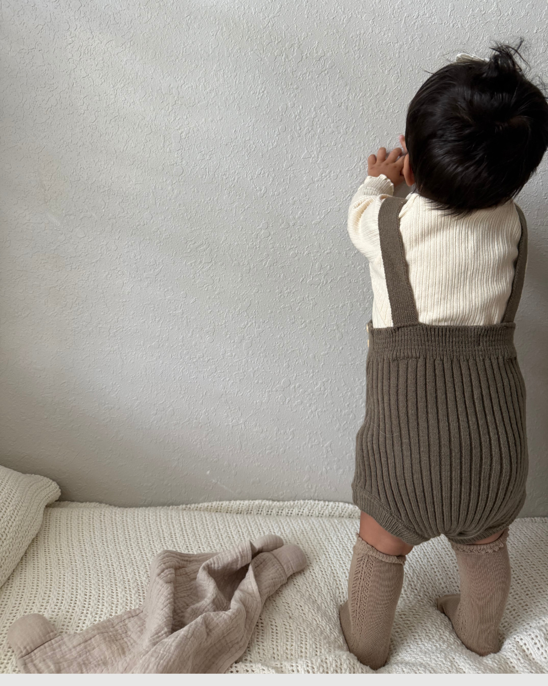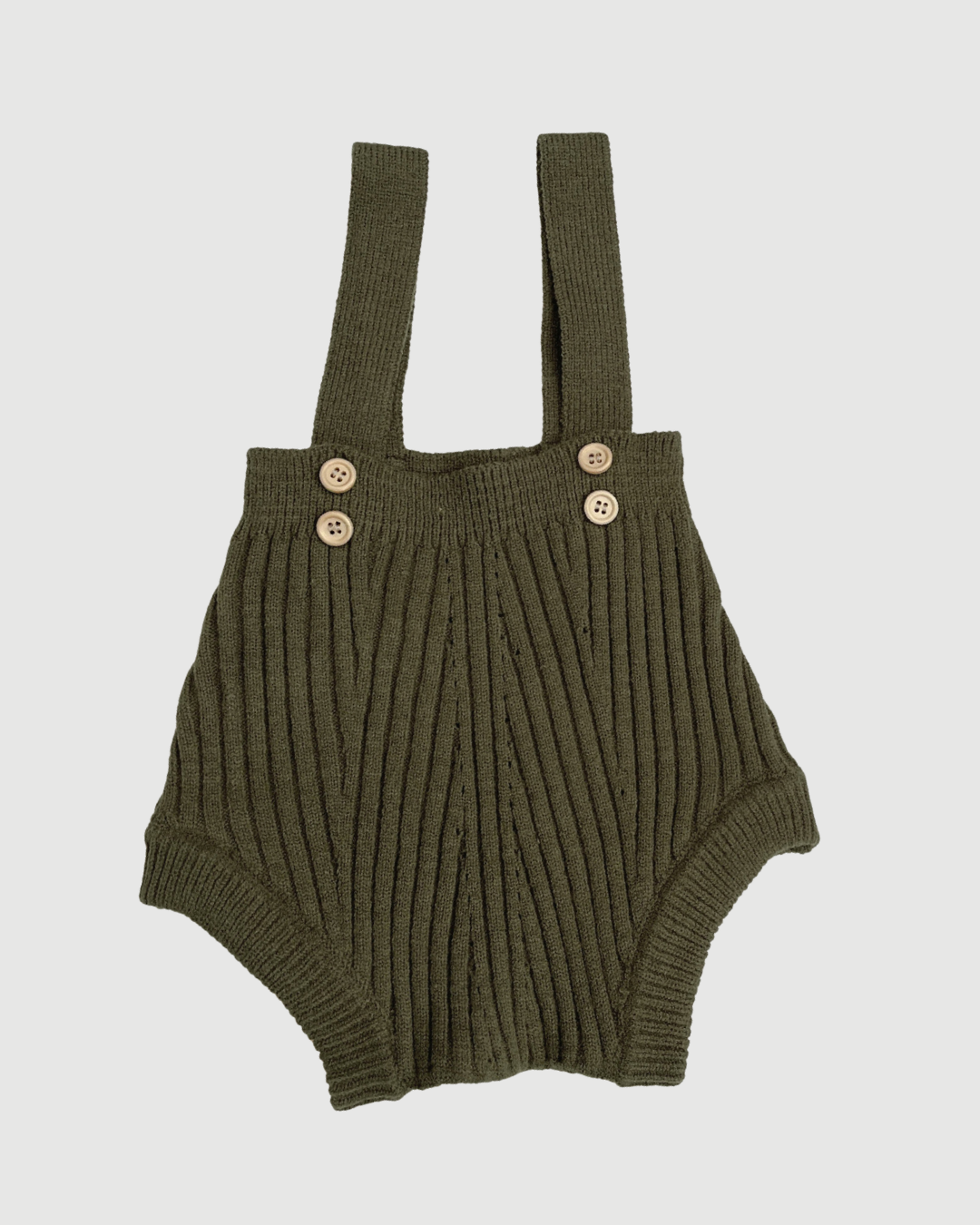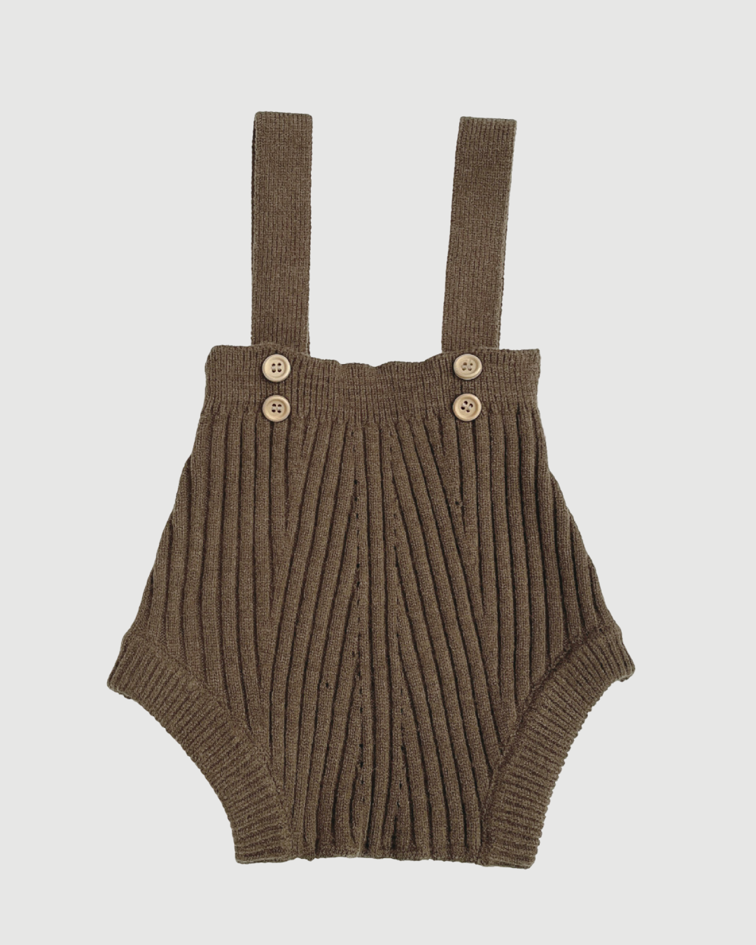 ふんわり柔らかなリブ編みニットで仕立てたサスペンダーブルマ。
