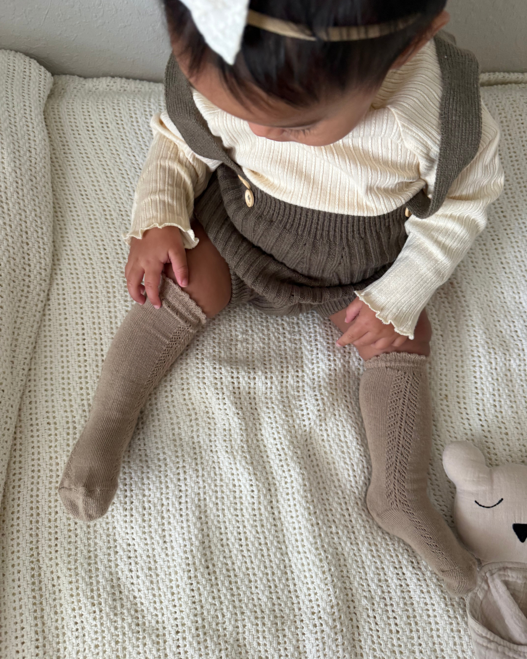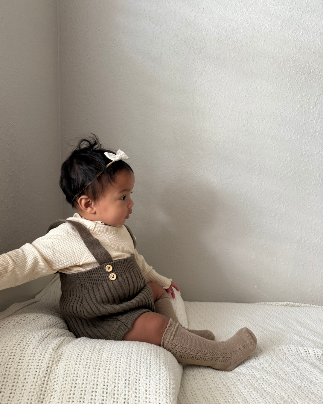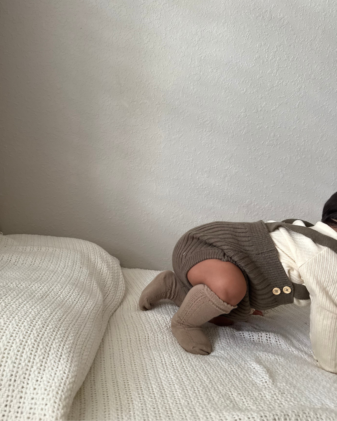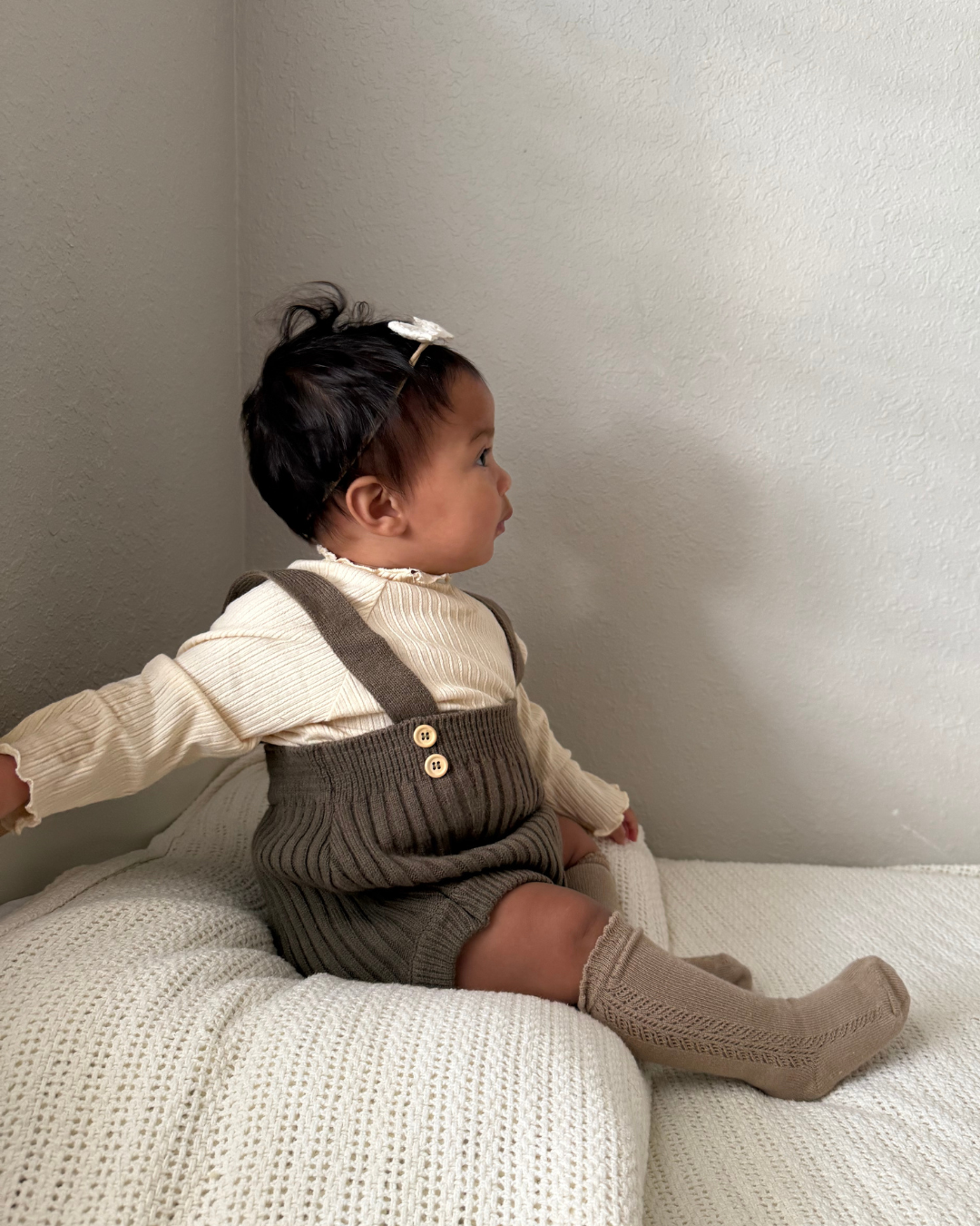 ふんわり柔らかなリブ編みニットで仕立てたサスペンダーブルマ。