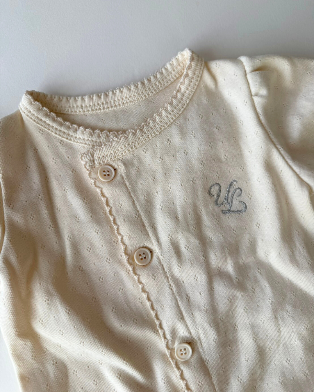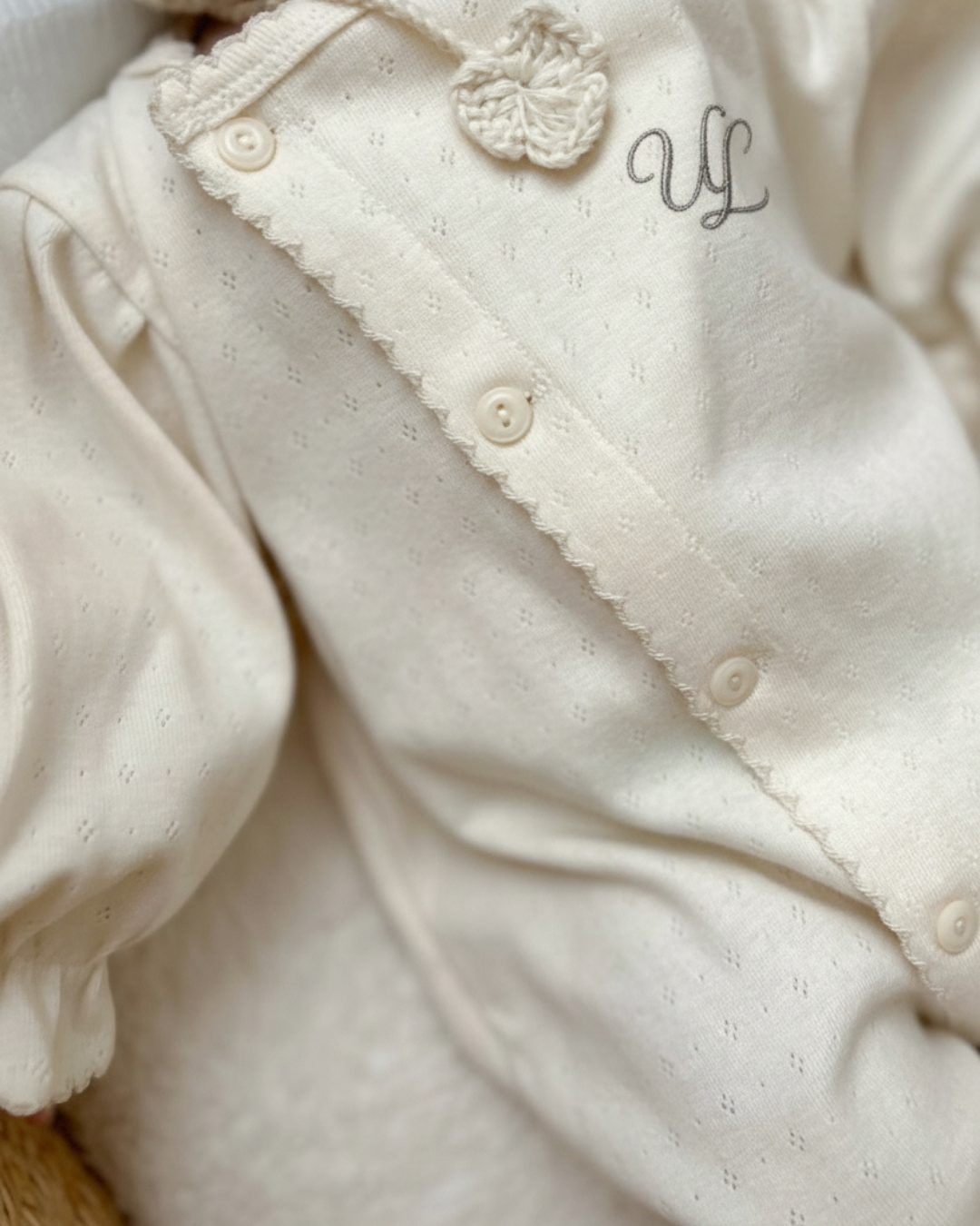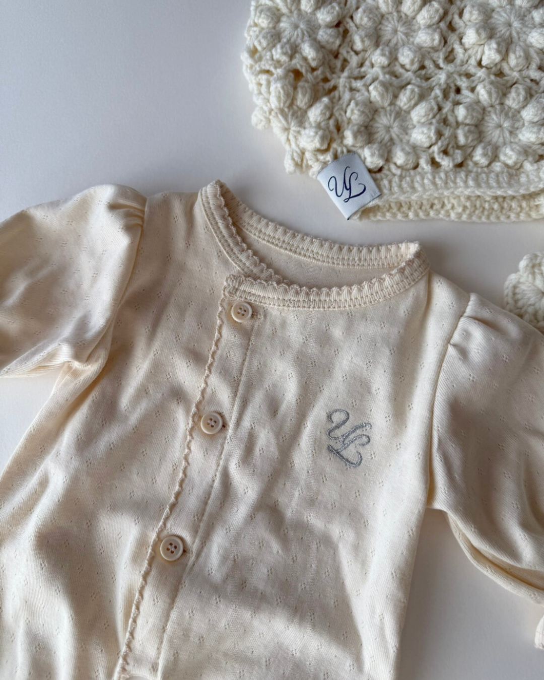 前開き仕様でお着替えやおむつ替えもしやすく、毎日のケアをスムーズにサポートします。 シンプルながらも上品なデザインは、退院着やお披露目、ニューボーンフォトにもぴったり。 ULらしい「静かな可愛さ」を大切にした、特別な一枚です。