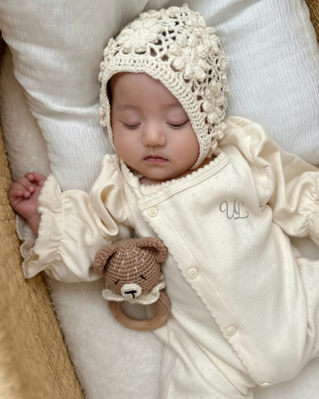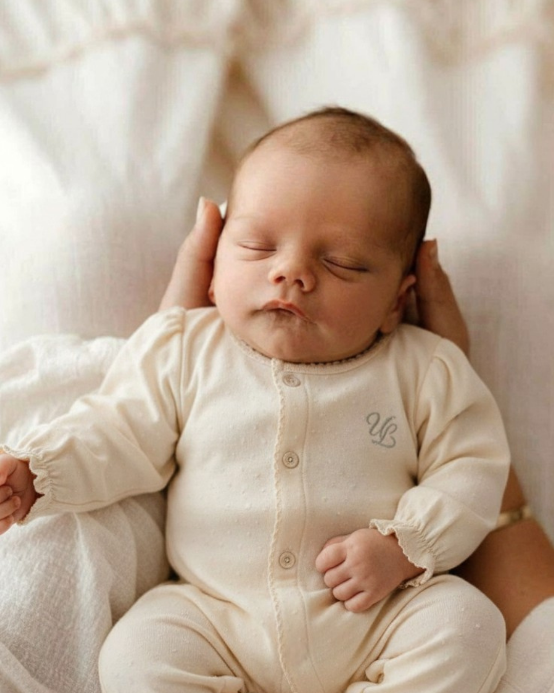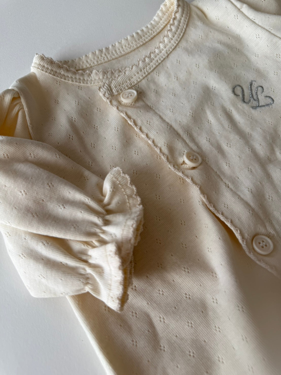前開き仕様でお着替えやおむつ替えもしやすく、毎日のケアをスムーズにサポートします。 シンプルながらも上品なデザインは、退院着やお披露目、ニューボーンフォトにもぴったり。 ULらしい「静かな可愛さ」を大切にした、特別な一枚です。