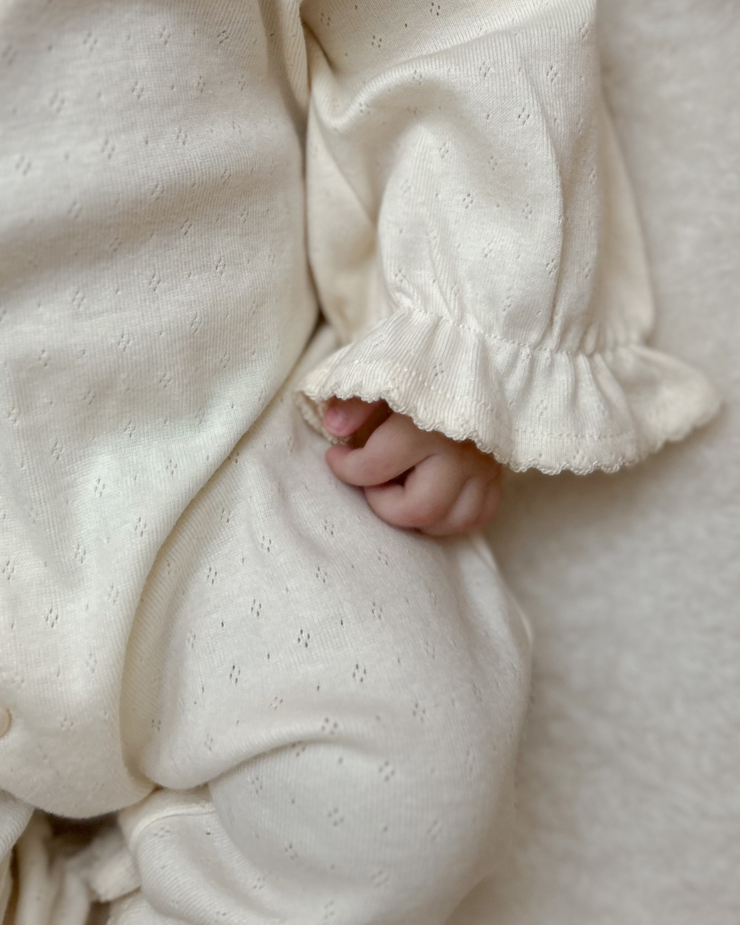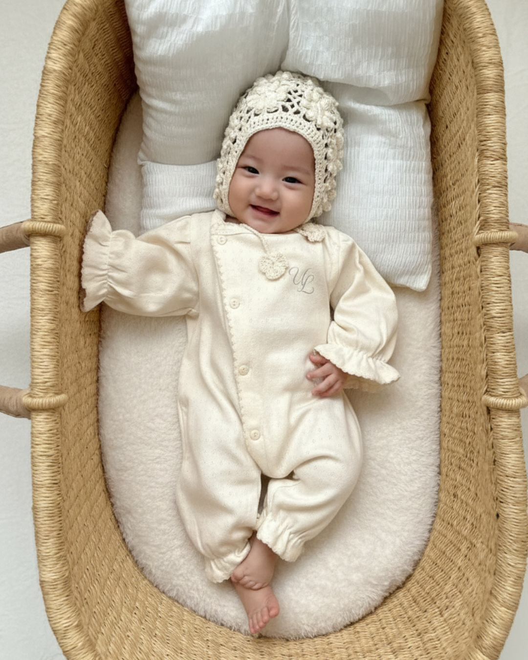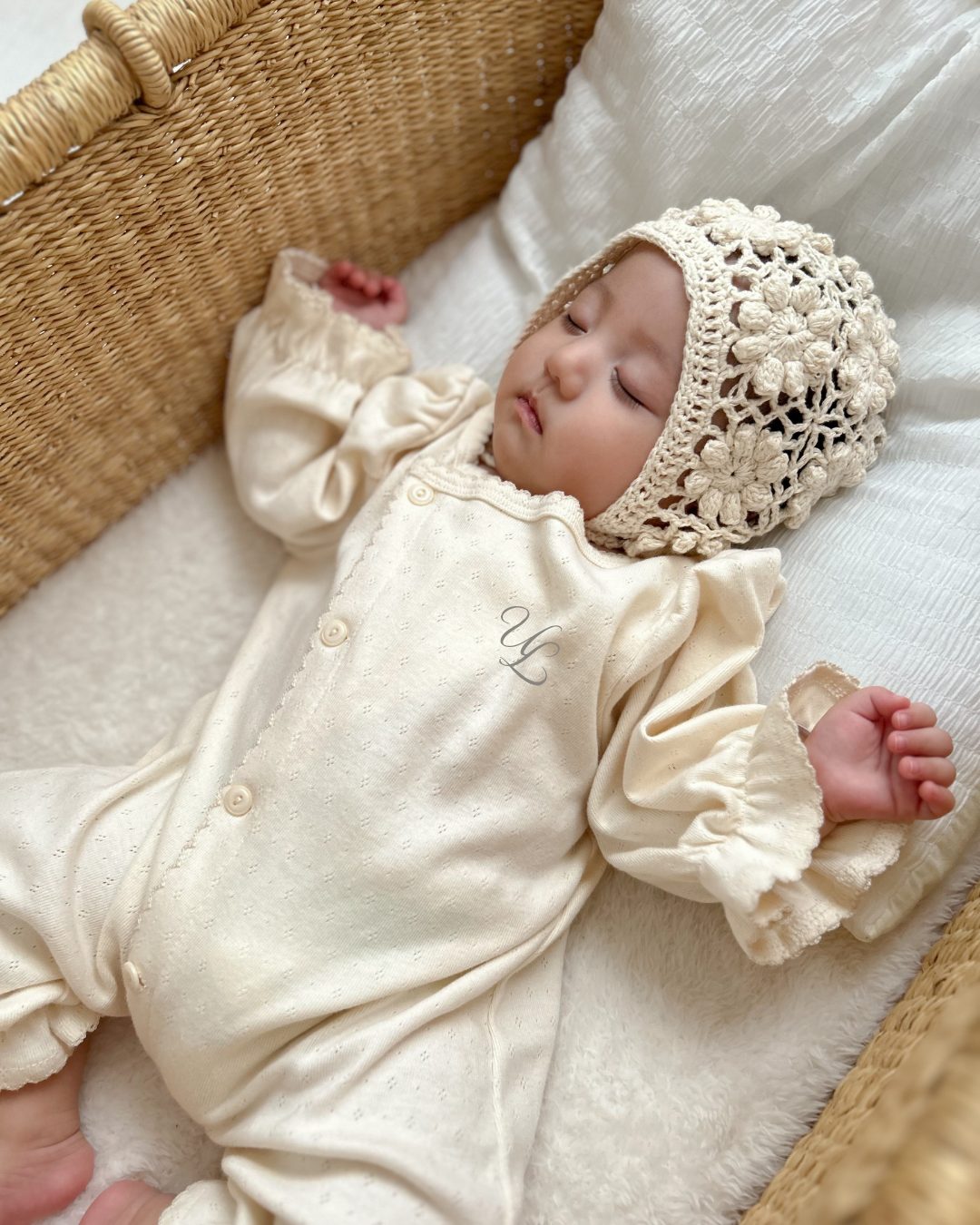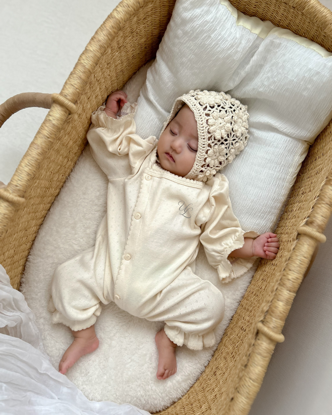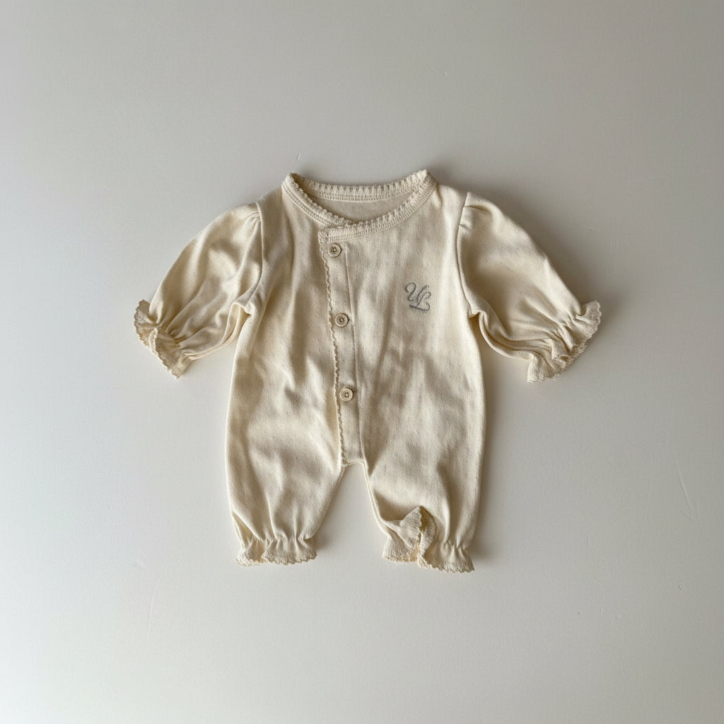 生まれたてのやわらかな時間に寄り添う、ULオリジナルのニューボーンカバーオール。 ナチュラルな生成りカラーと、袖口にあしらった繊細なフリルが、赤ちゃんの愛らしさをそっと引き立てます。