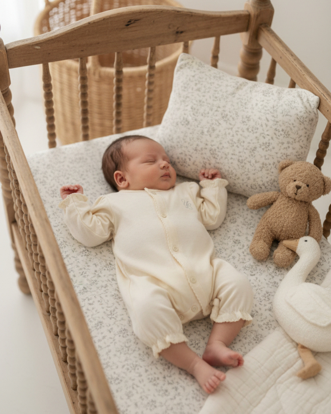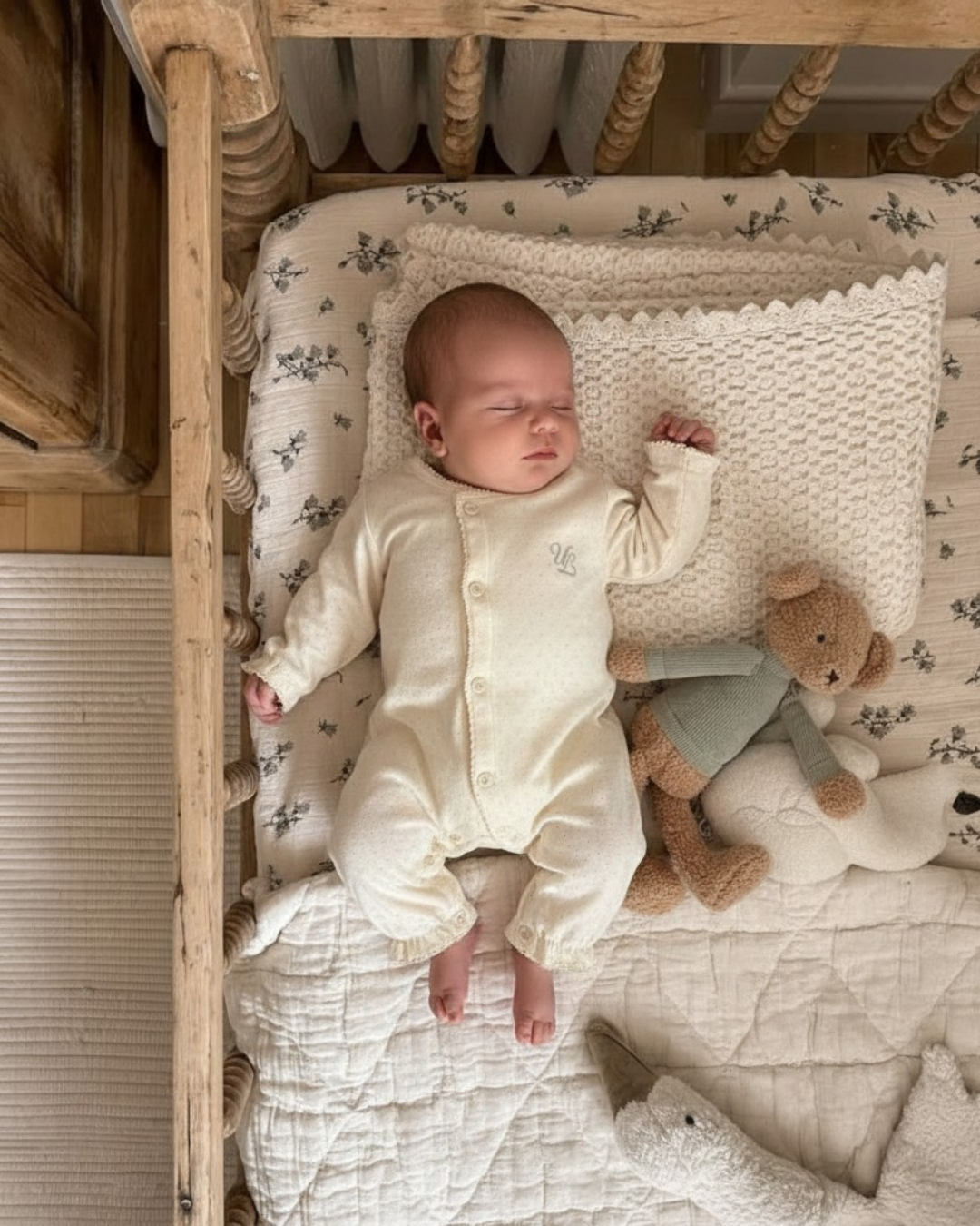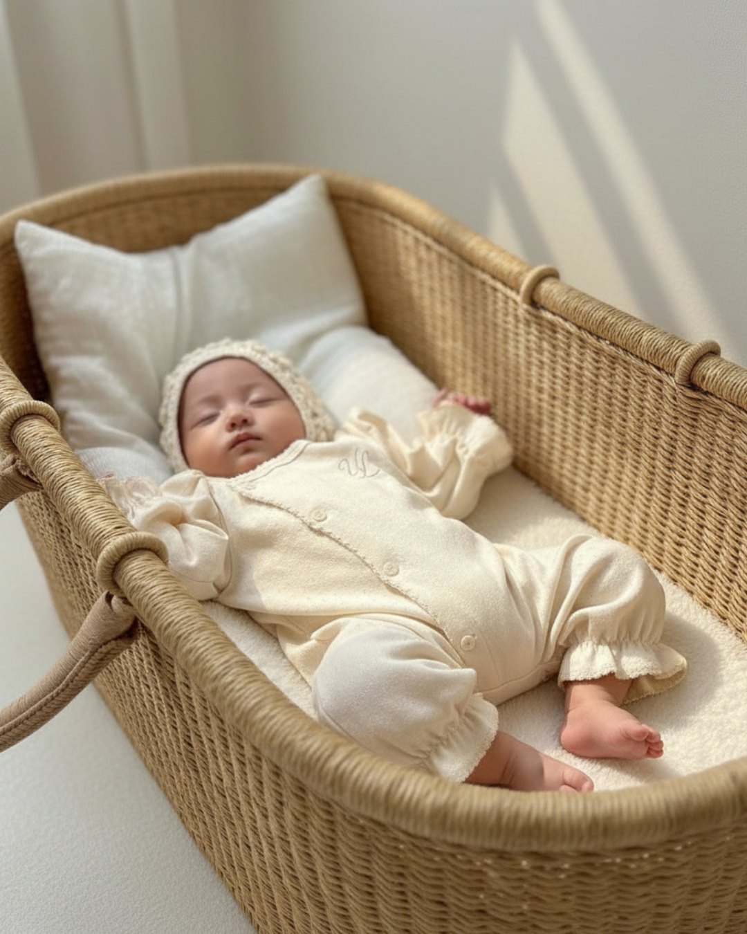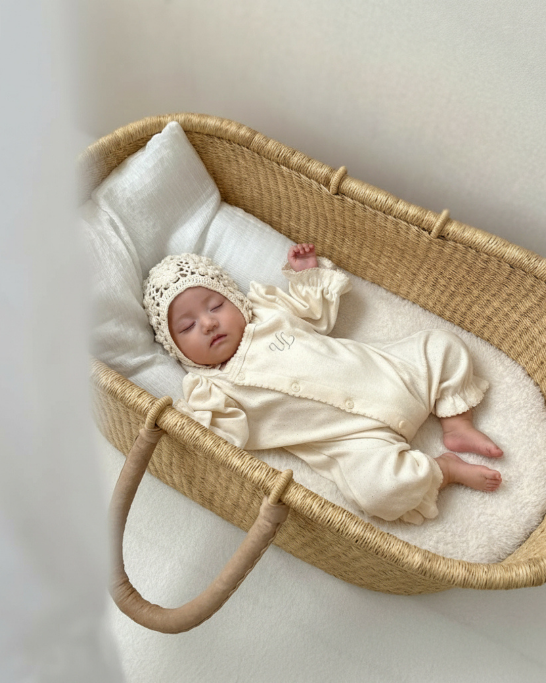 生まれたてのやわらかな時間に寄り添う、ULオリジナルのニューボーンカバーオール。 ナチュラルな生成りカラーと、袖口にあしらった繊細なフリルが、赤ちゃんの愛らしさをそっと引き立てます。