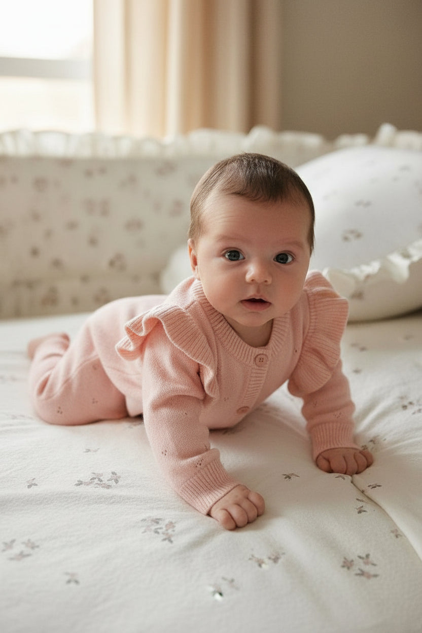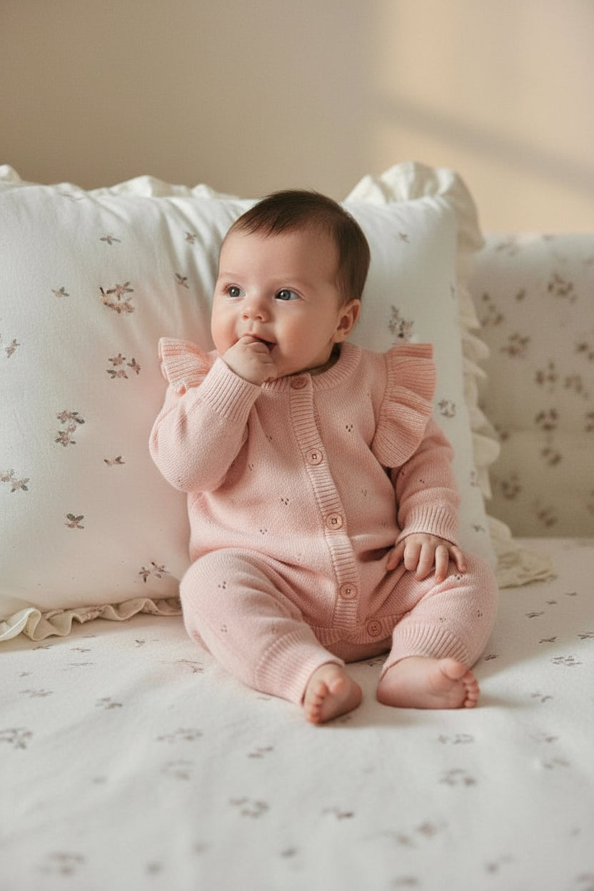 やさしい淡ピンクが赤ちゃんの可愛さを引き立てる、フリルスリーブのニットロンパース。