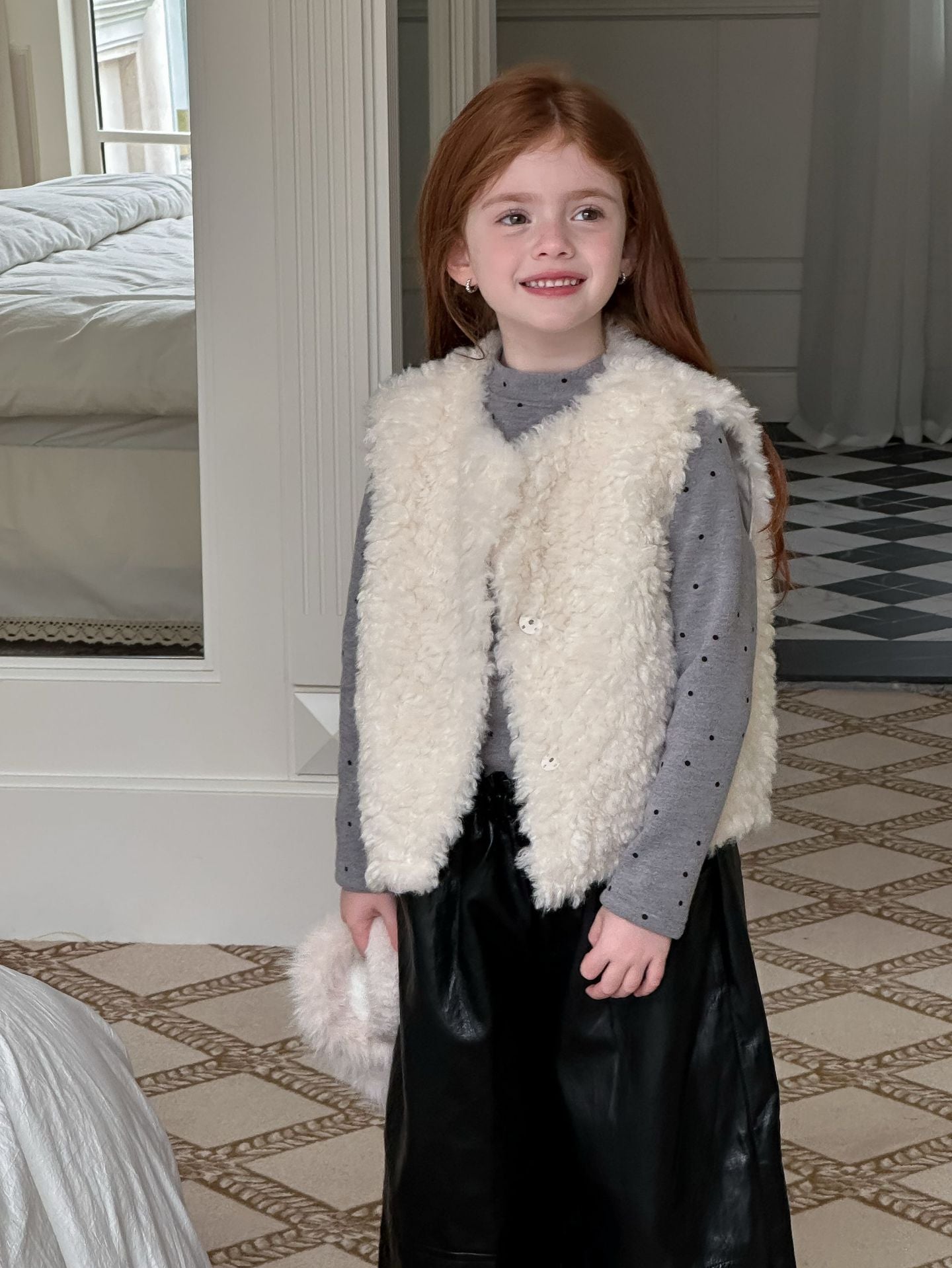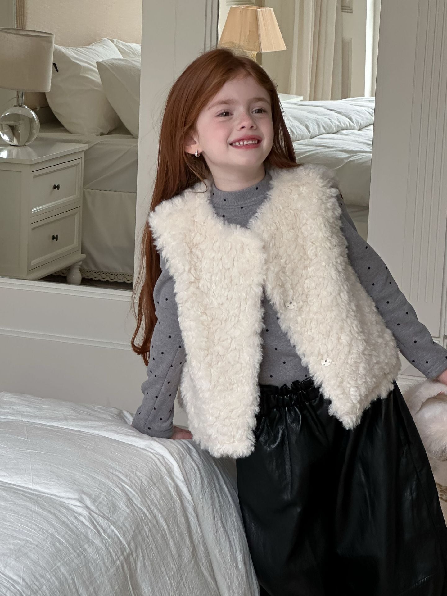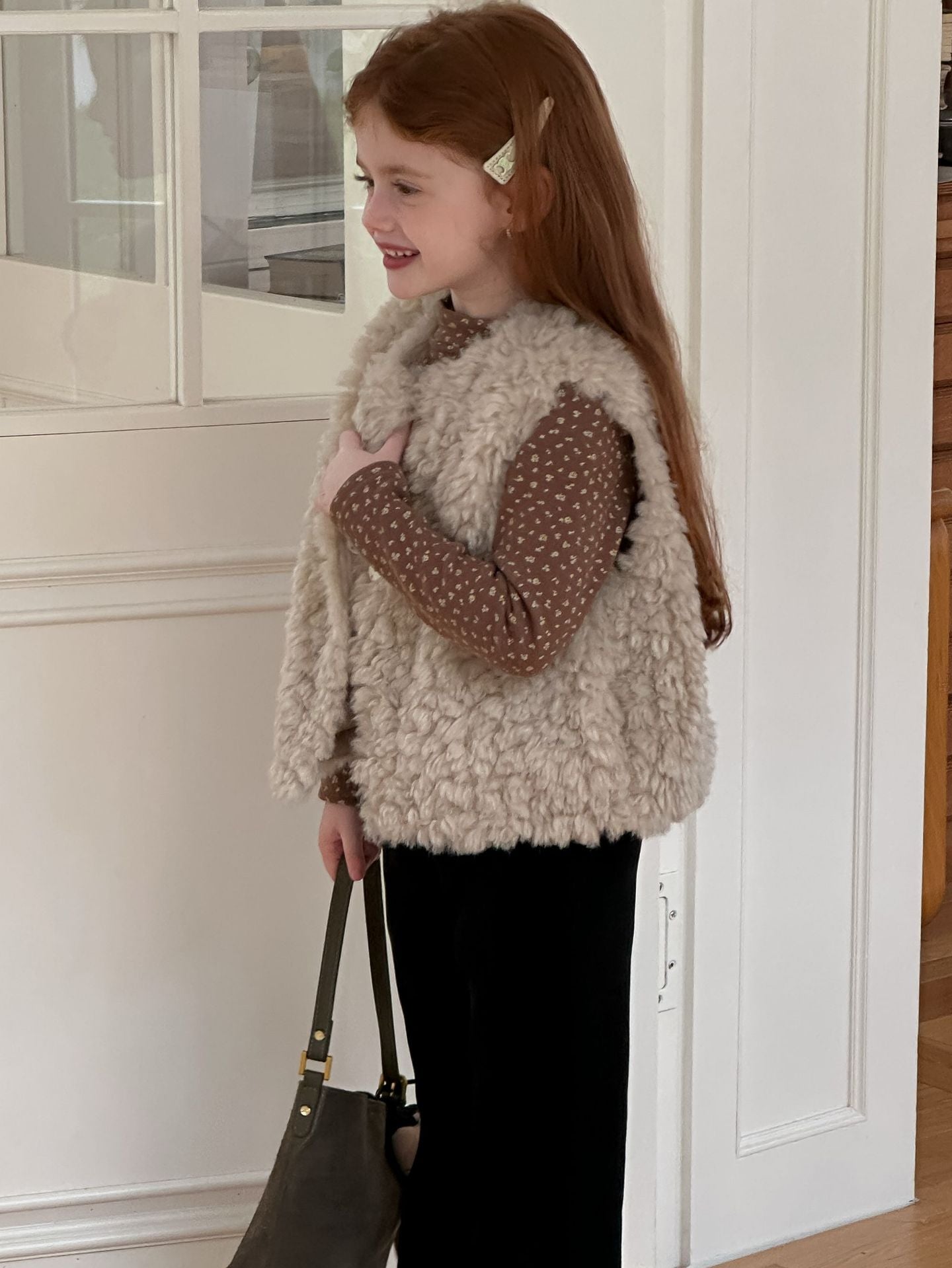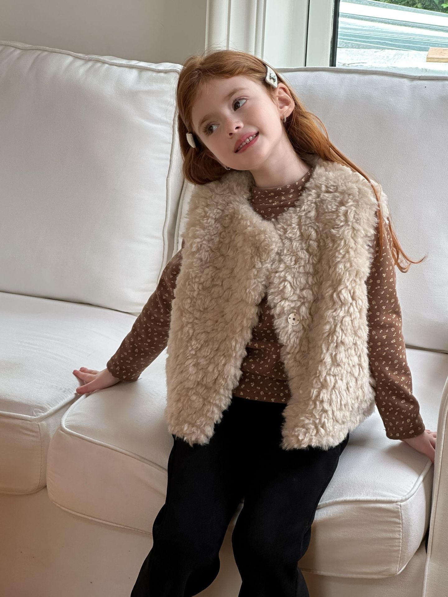 ふんわりとしたボアフリース素材を使用した、軽やかで暖かいベビーベスト。