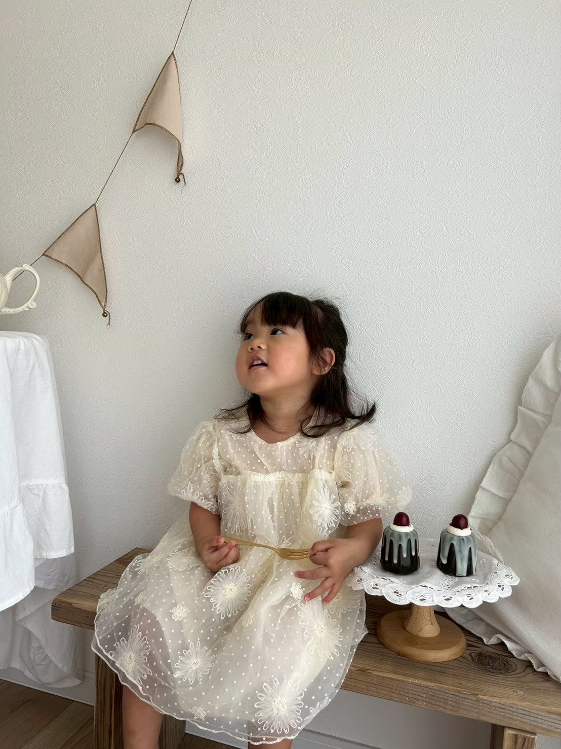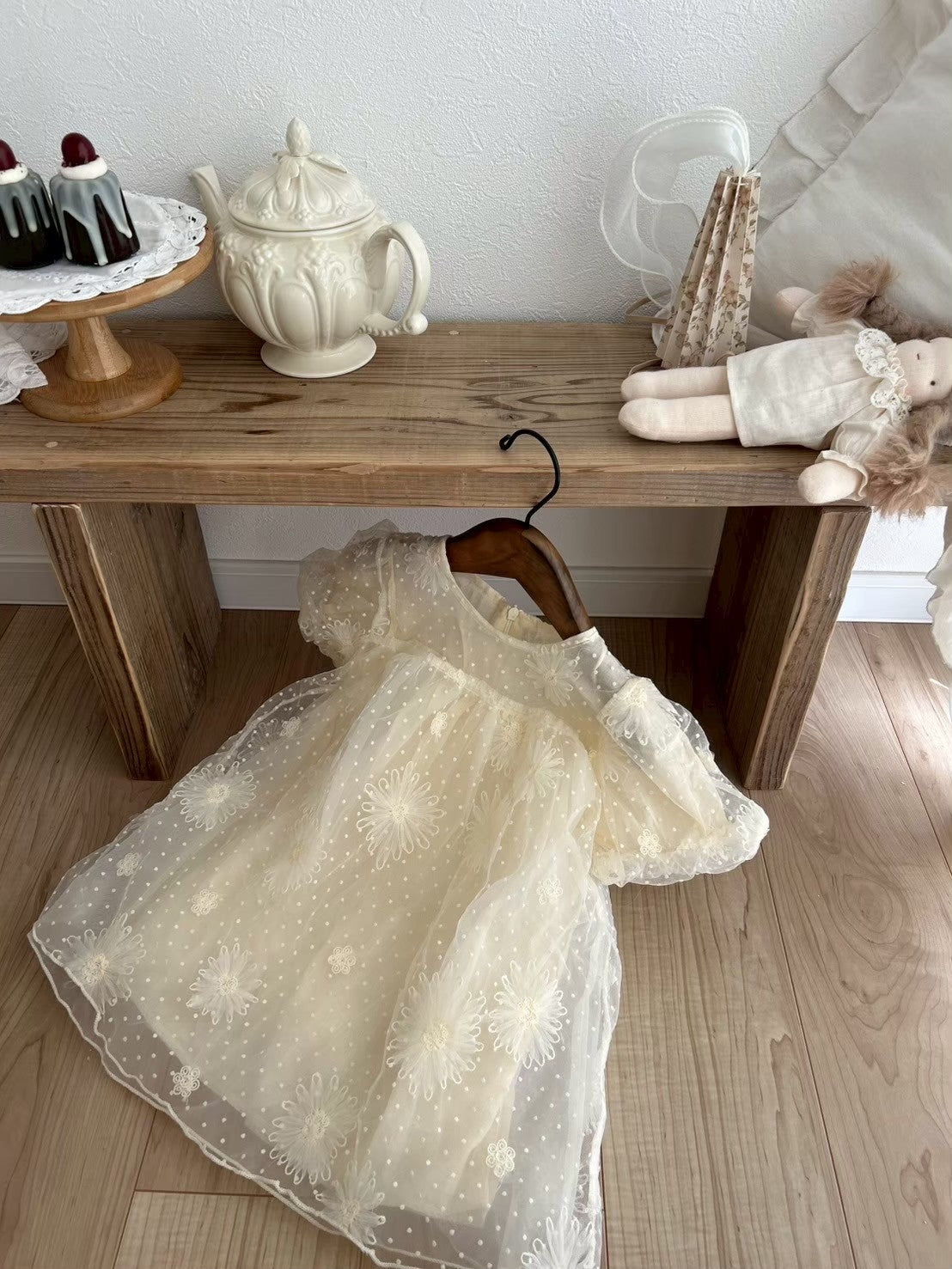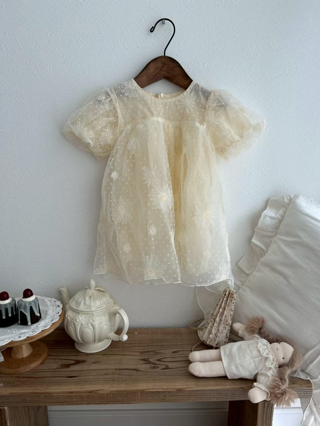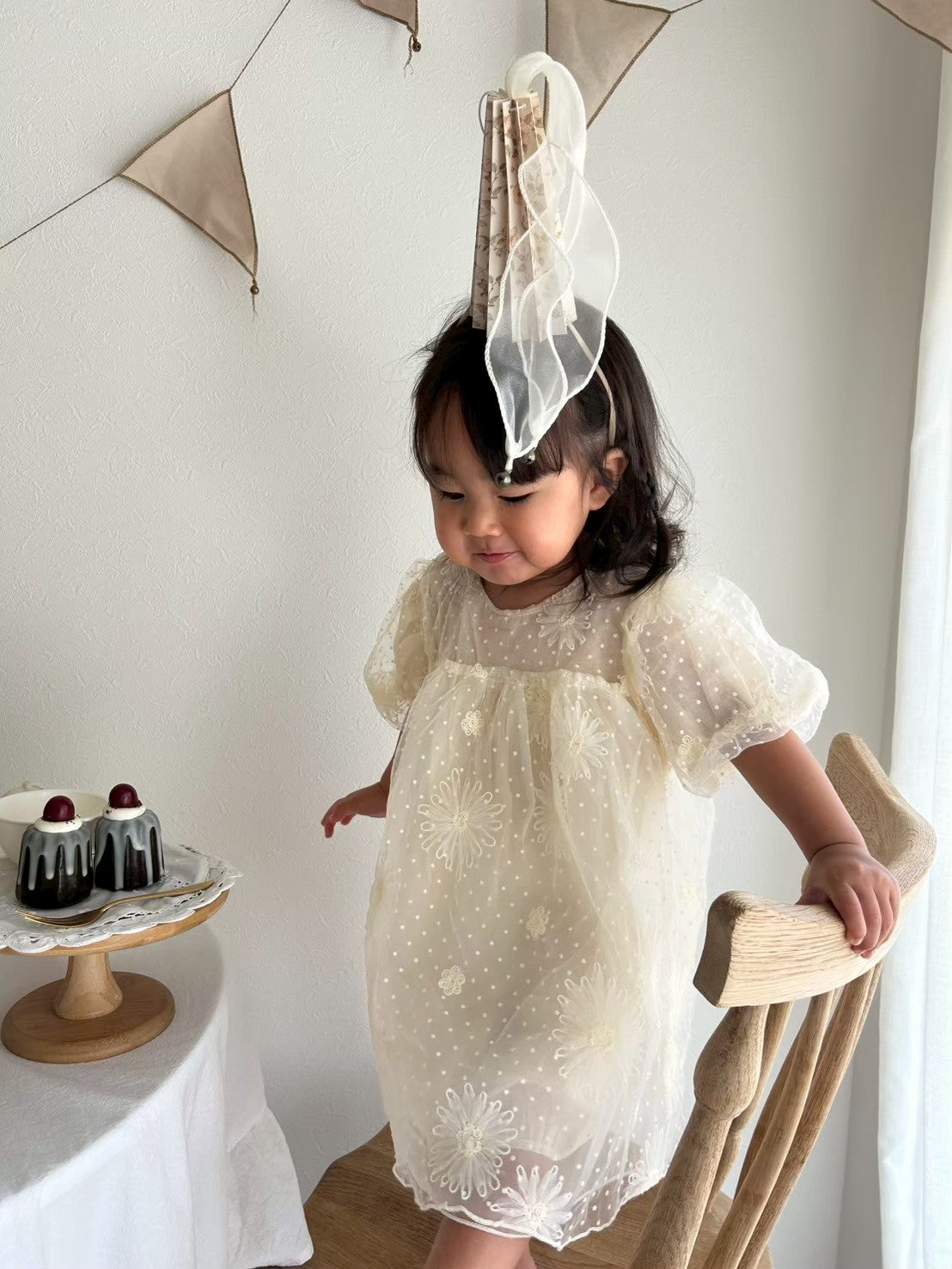 繊細な花柄刺繍があしらわれたチュール素材のワンピース。ふんわりと広がるシルエットと、ドット柄が重なった透明感のあるデザインが、特別な日にもぴったりの一着です。袖部分も柔らかいチュールで仕立てられ、軽やかな着心地。記念撮影やお呼ばれ、お誕生日などにもおすすめです◎