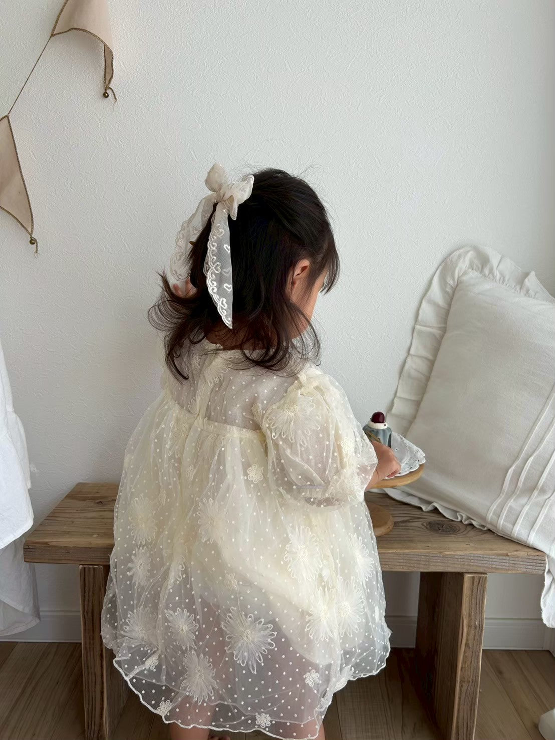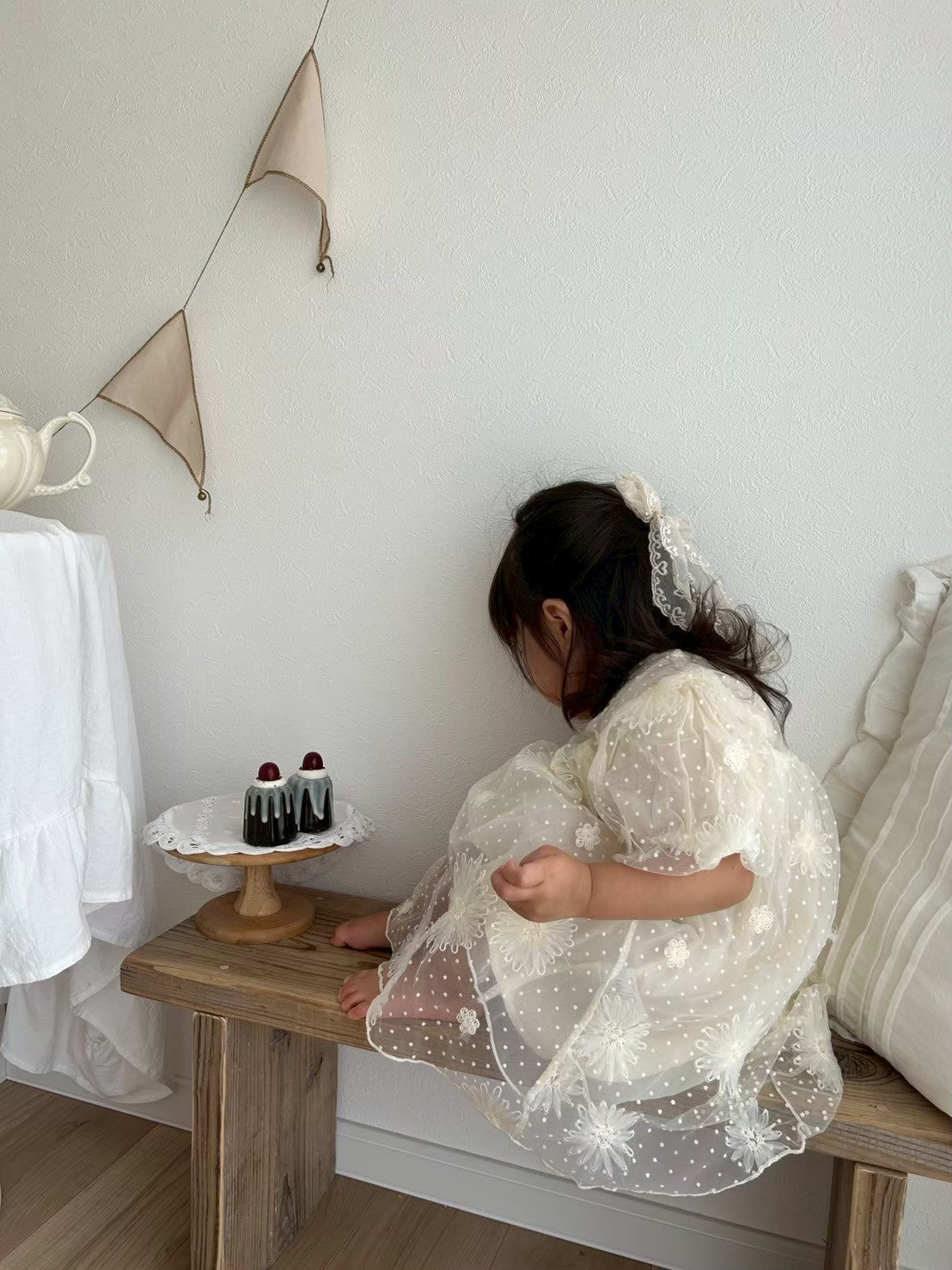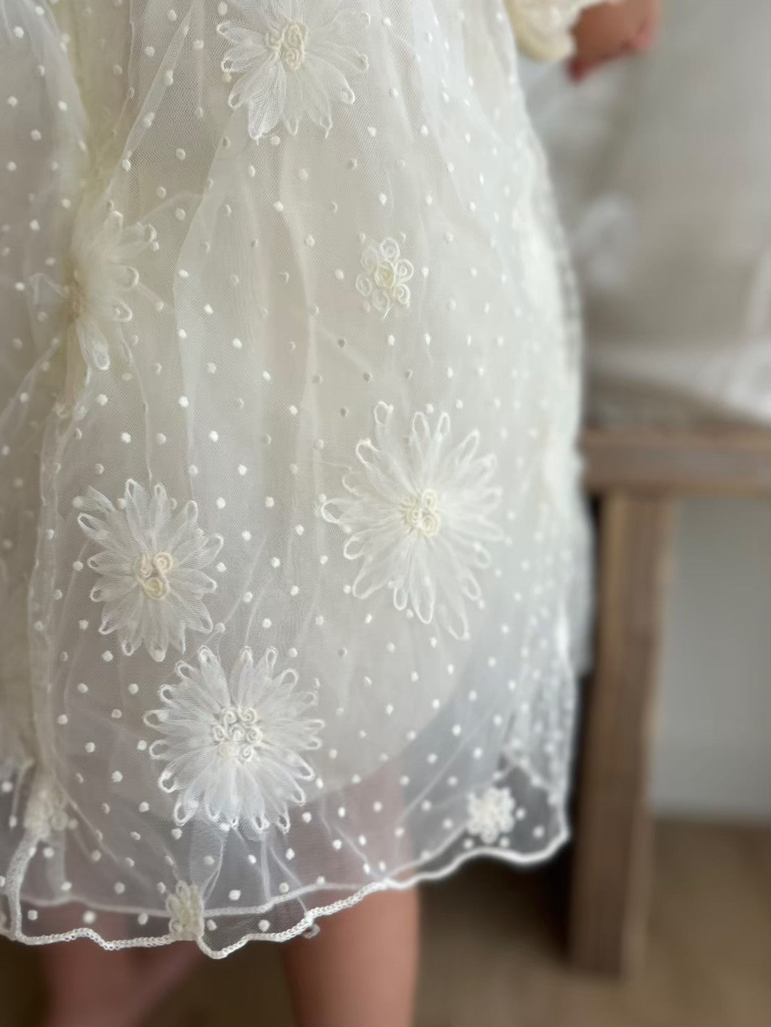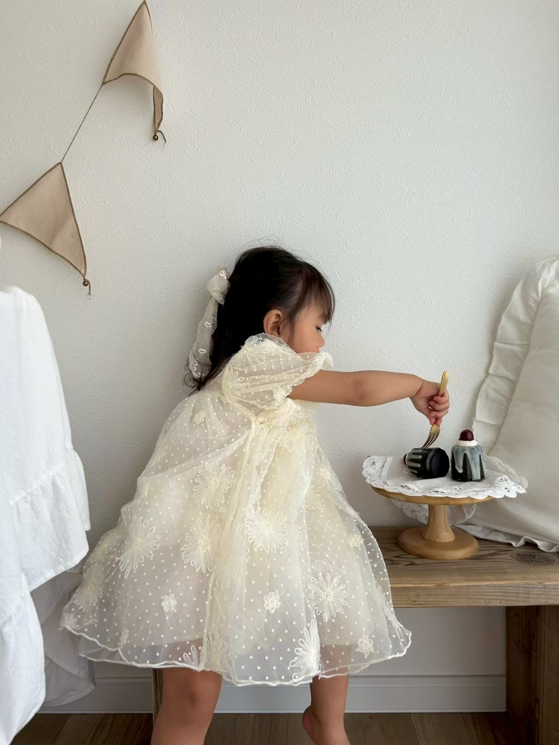 繊細な花柄刺繍があしらわれたチュール素材のワンピース。ふんわりと広がるシルエットと、ドット柄が重なった透明感のあるデザインが、特別な日にもぴったりの一着です。袖部分も柔らかいチュールで仕立てられ、軽やかな着心地。記念撮影やお呼ばれ、お誕生日などにもおすすめです◎