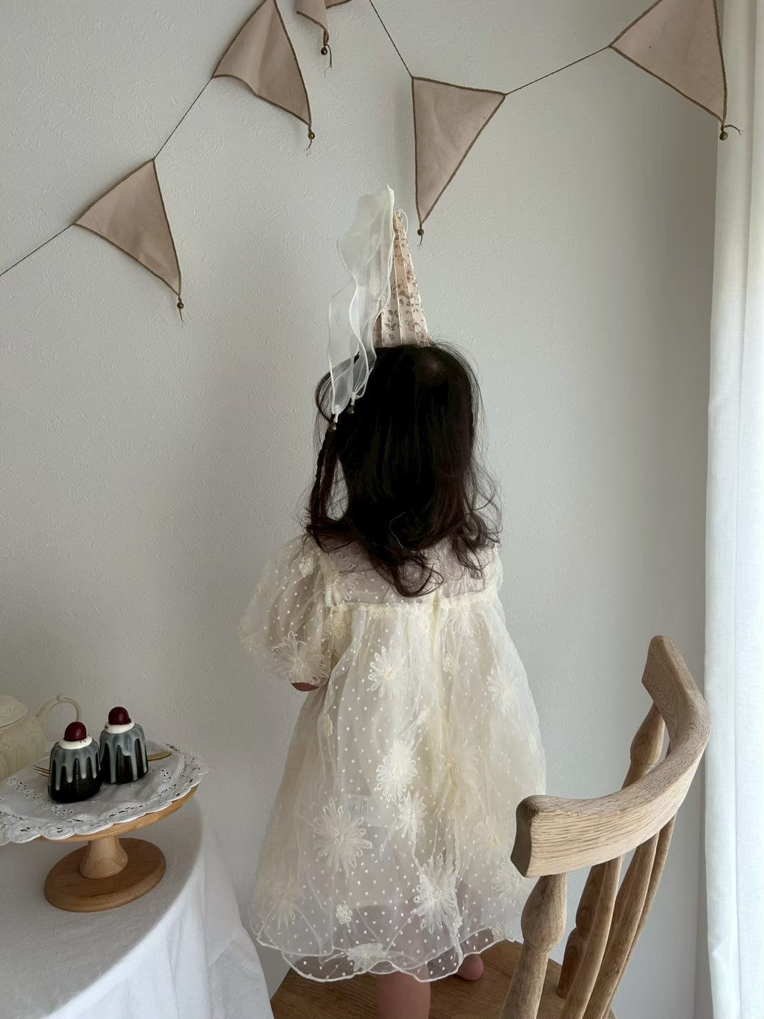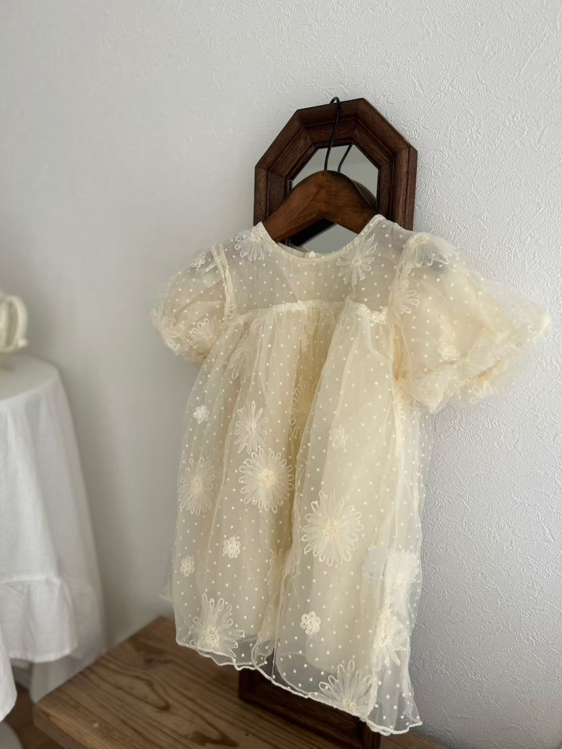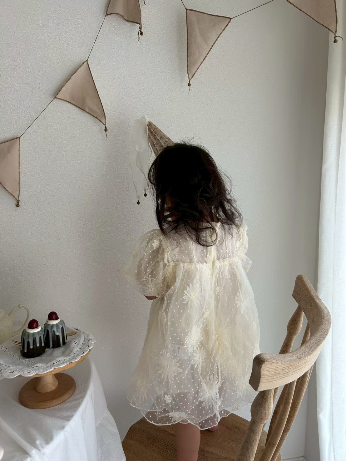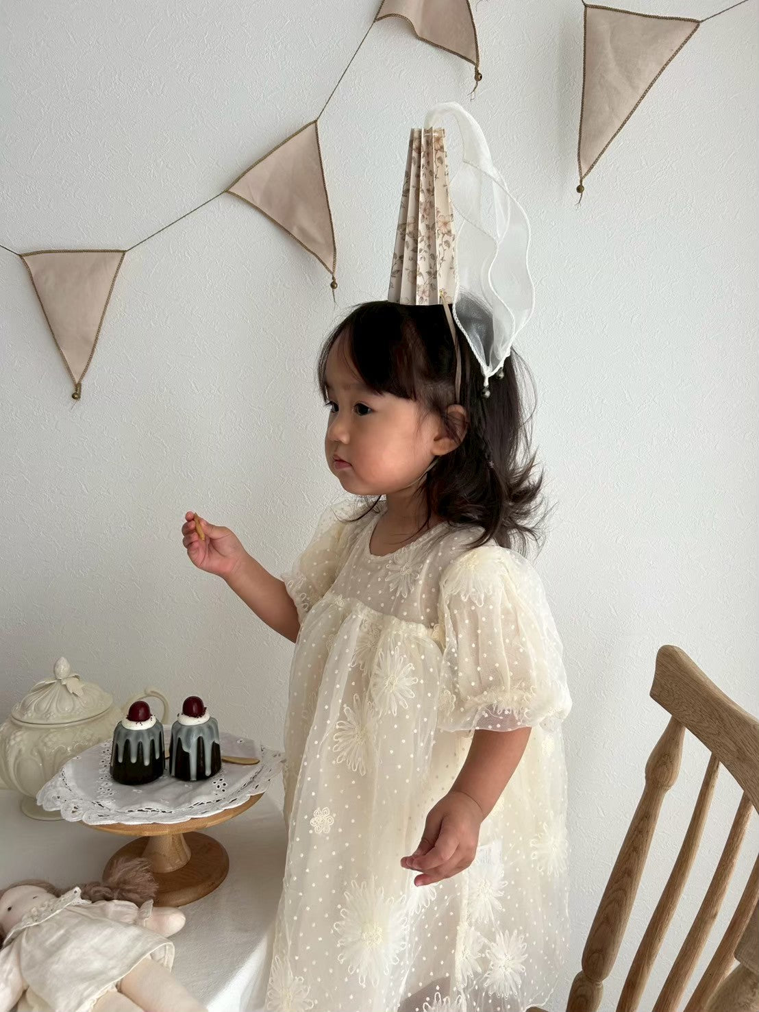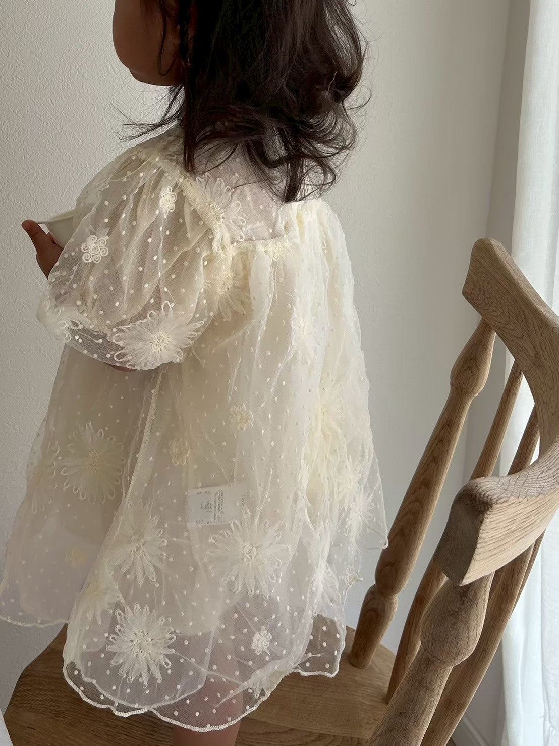 繊細な花柄刺繍があしらわれたチュール素材のワンピース。ふんわりと広がるシルエットと、ドット柄が重なった透明感のあるデザインが、特別な日にもぴったりの一着です。袖部分も柔らかいチュールで仕立てられ、軽やかな着心地。記念撮影やお呼ばれ、お誕生日などにもおすすめです◎