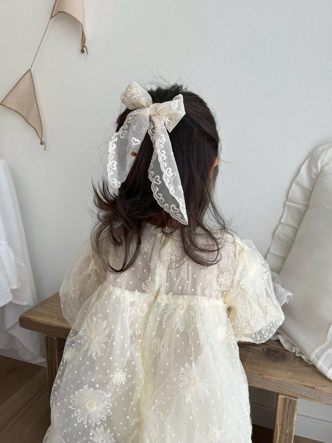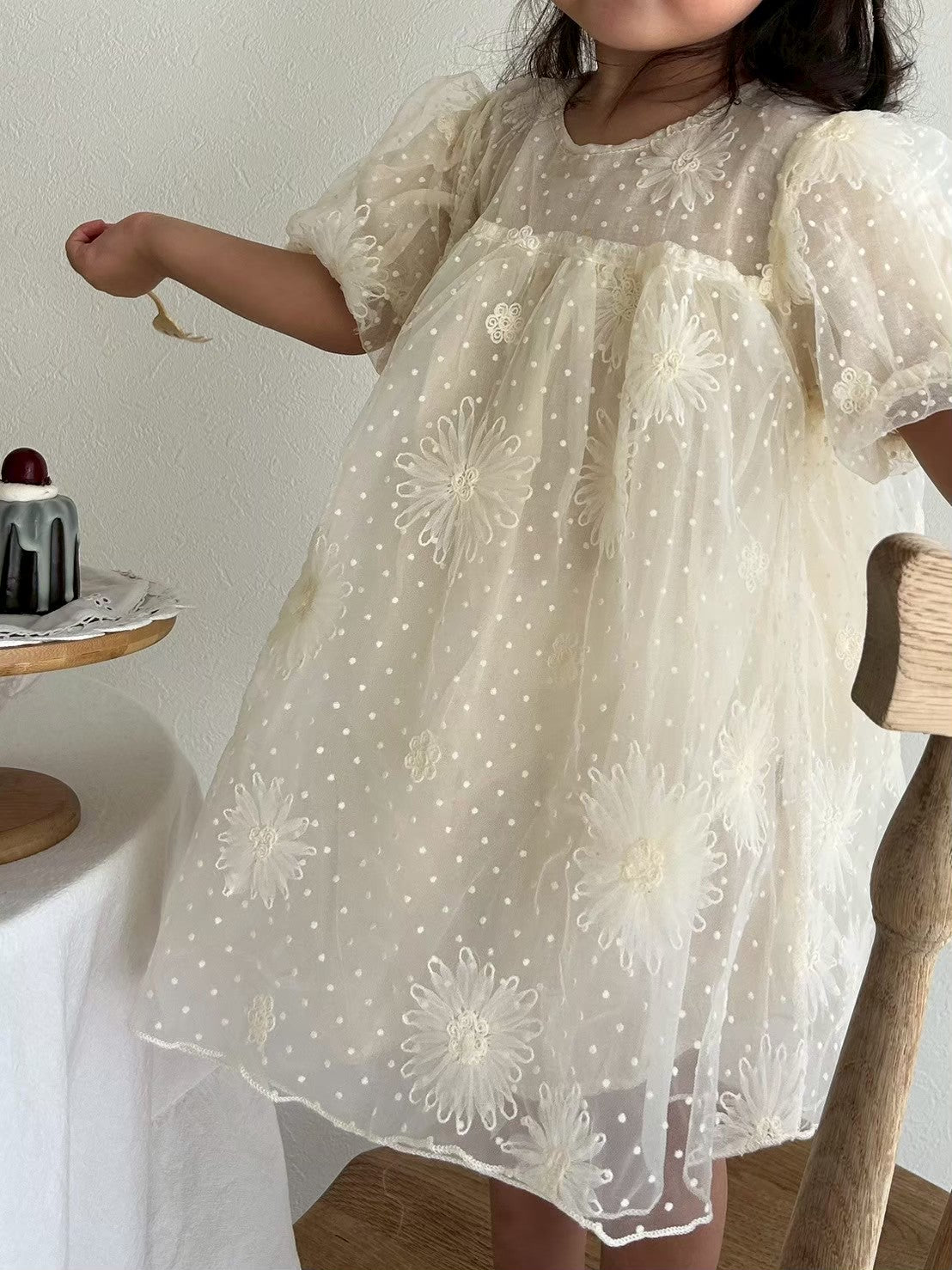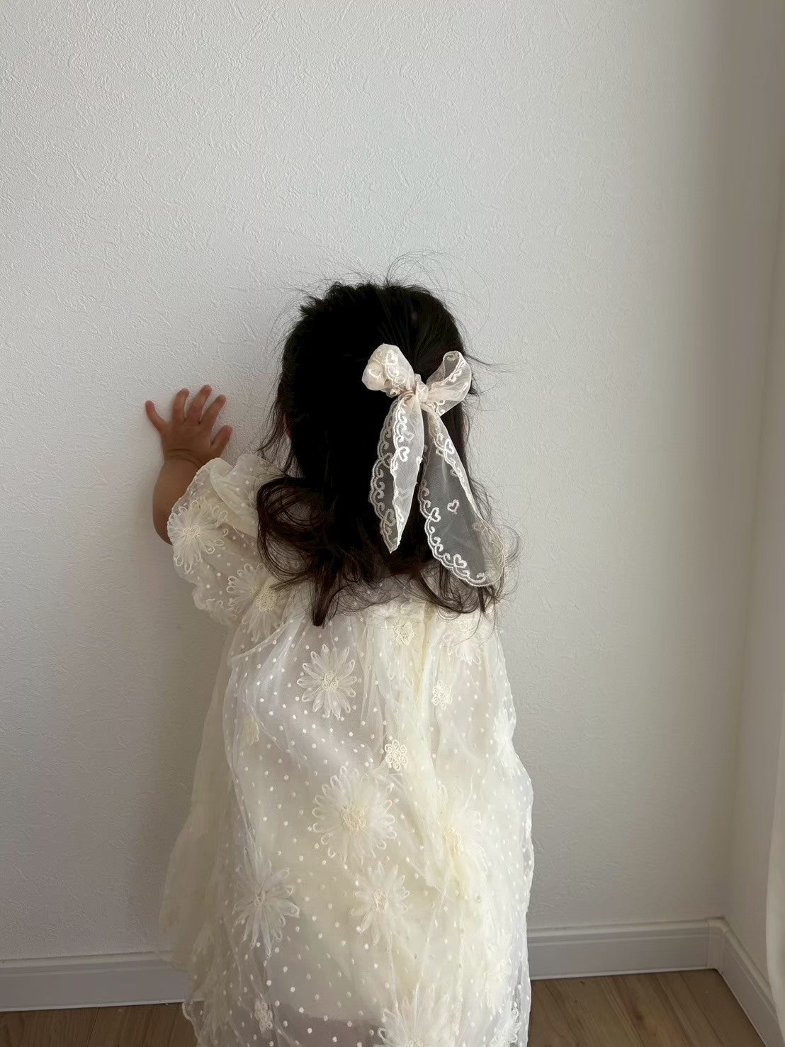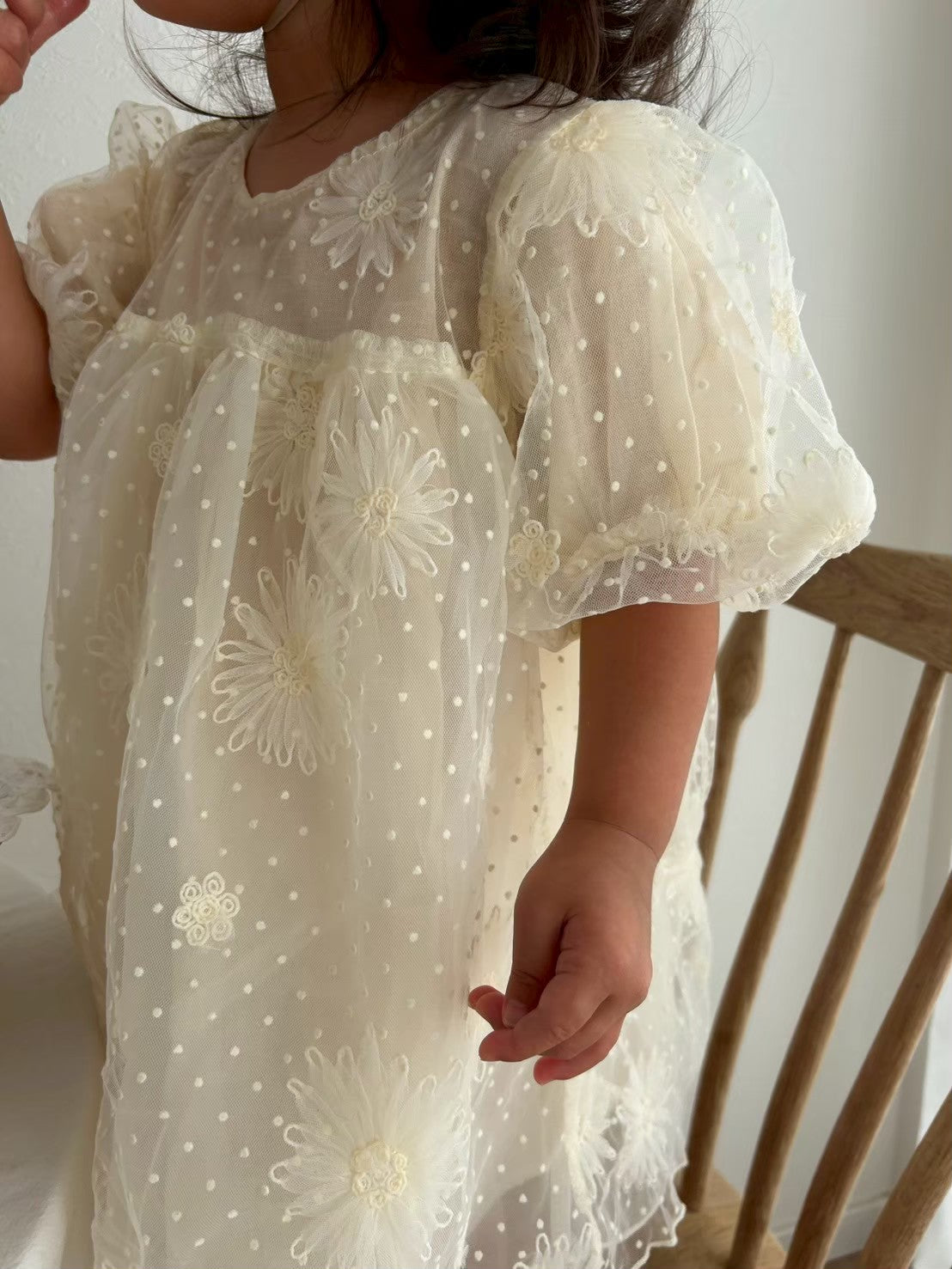 繊細な花柄刺繍があしらわれたチュール素材のワンピース。ふんわりと広がるシルエットと、ドット柄が重なった透明感のあるデザインが、特別な日にもぴったりの一着です。袖部分も柔らかいチュールで仕立てられ、軽やかな着心地。記念撮影やお呼ばれ、お誕生日などにもおすすめです◎