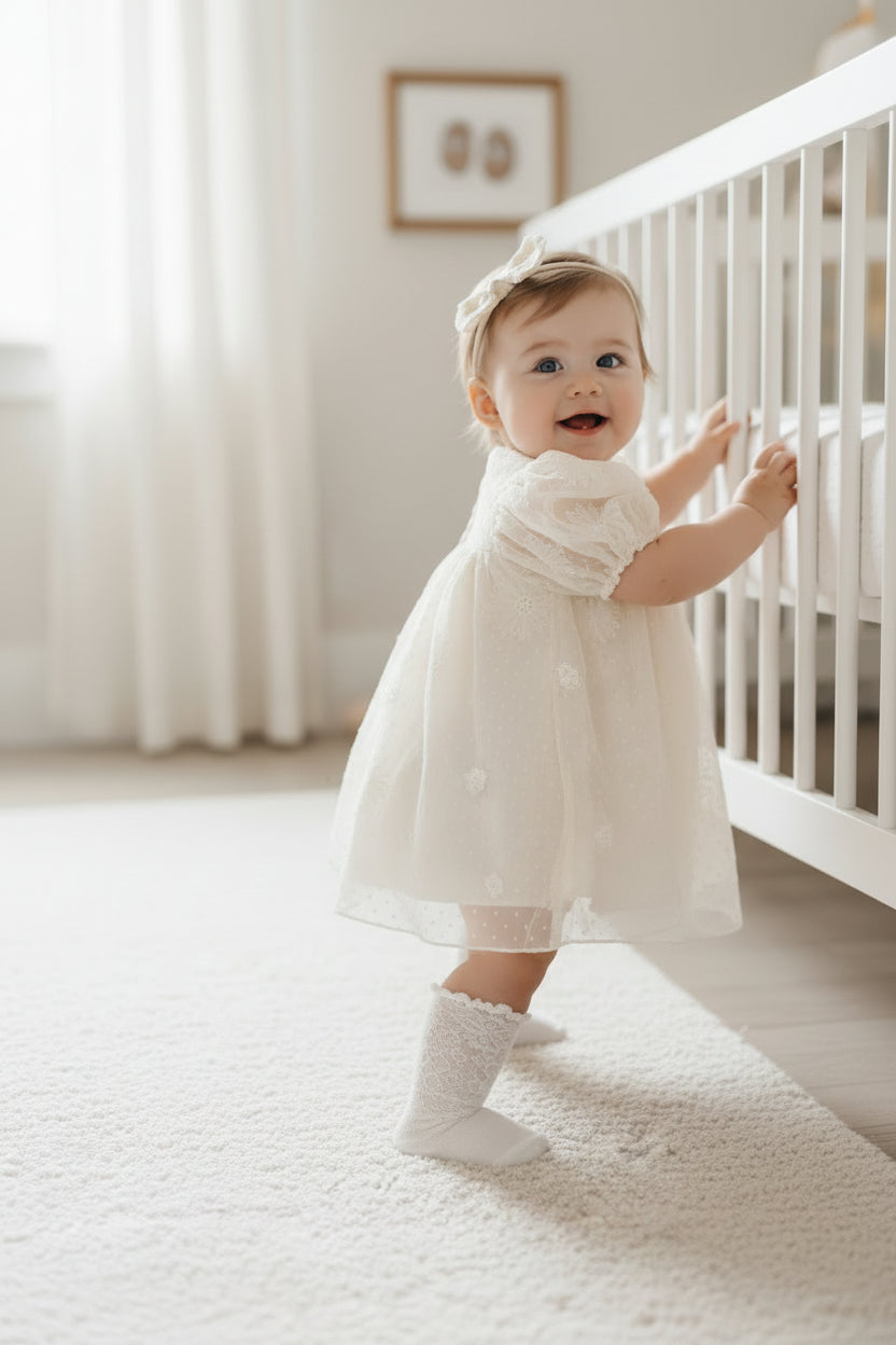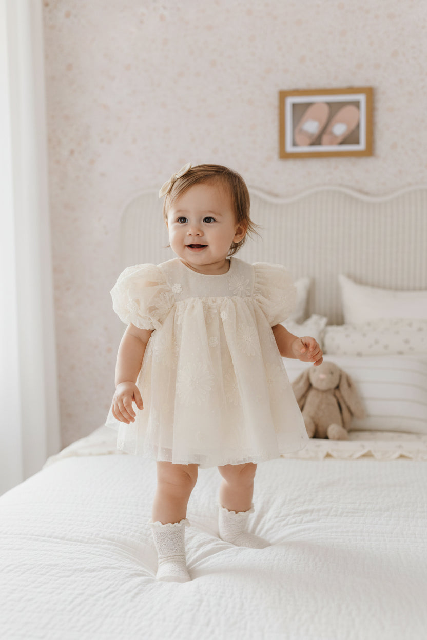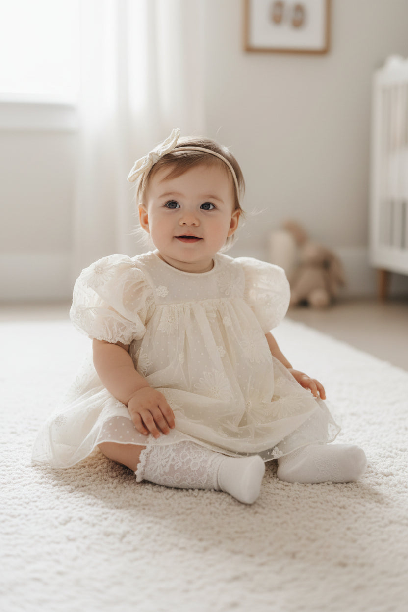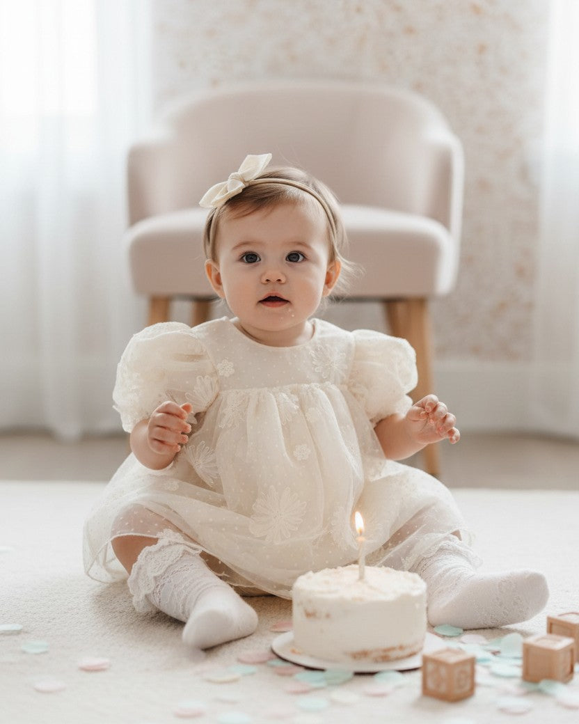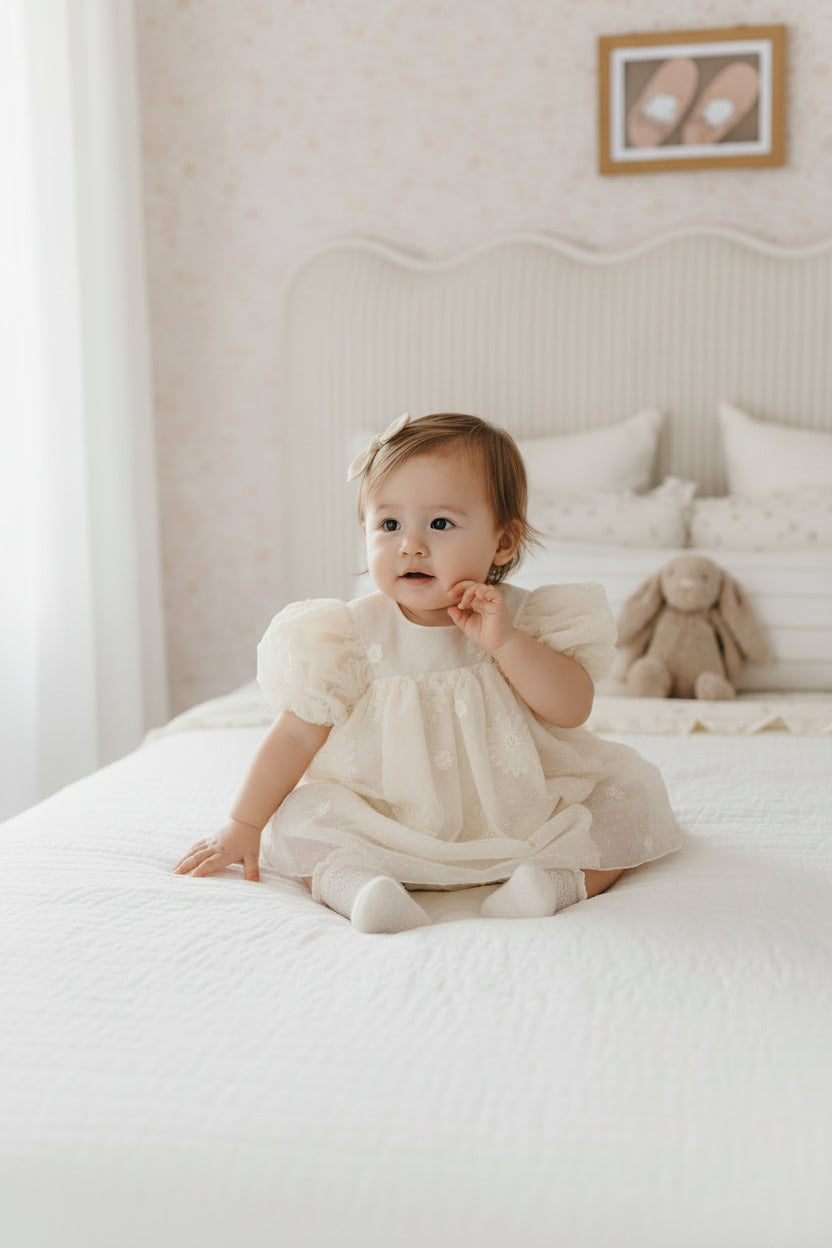 繊細な花柄刺繍があしらわれたチュール素材のワンピース。ふんわりと広がるシルエットと、ドット柄が重なった透明感のあるデザインが、特別な日にもぴったりの一着です。袖部分も柔らかいチュールで仕立てられ、軽やかな着心地。記念撮影やお呼ばれ、お誕生日などにもおすすめです◎