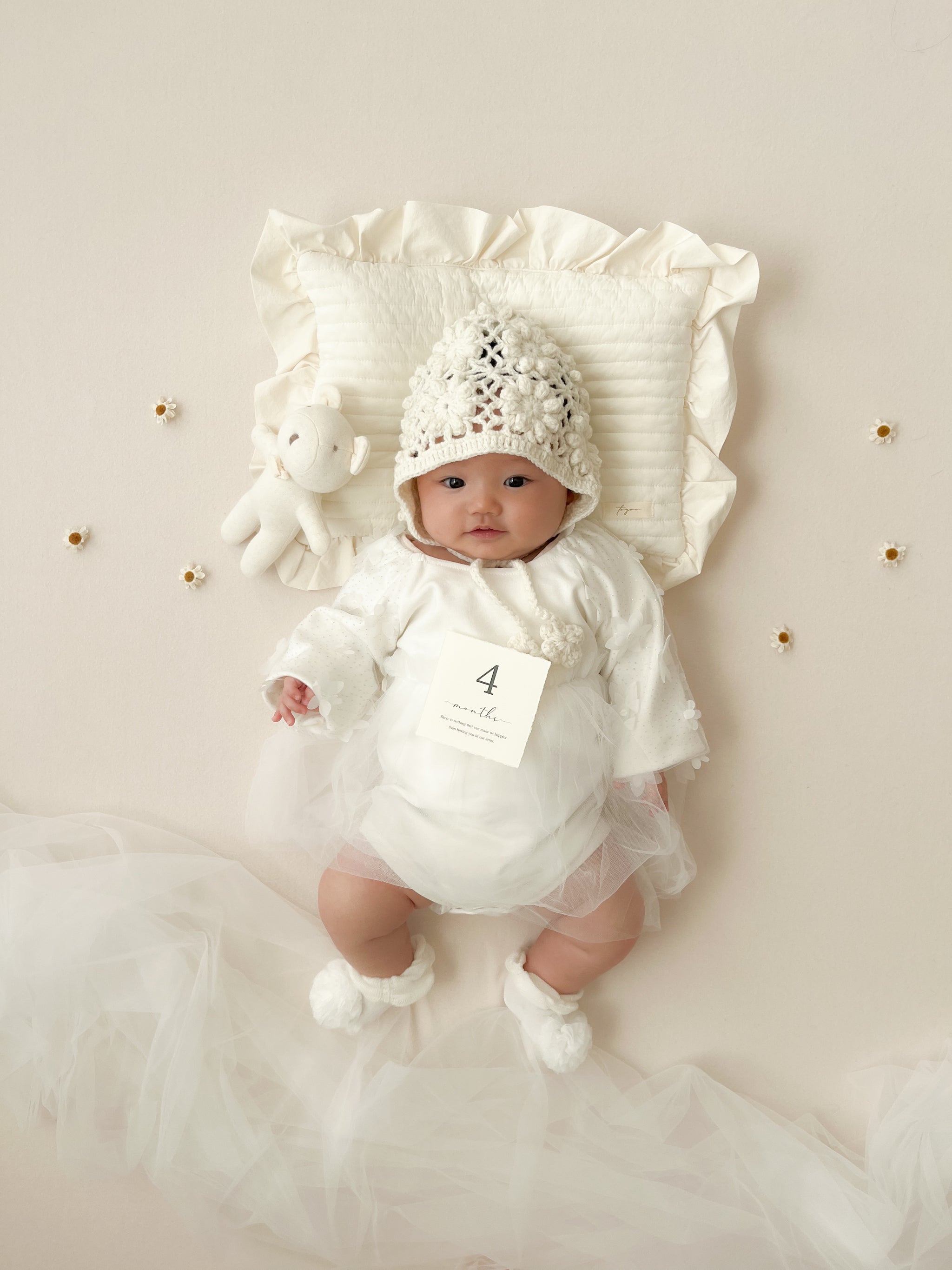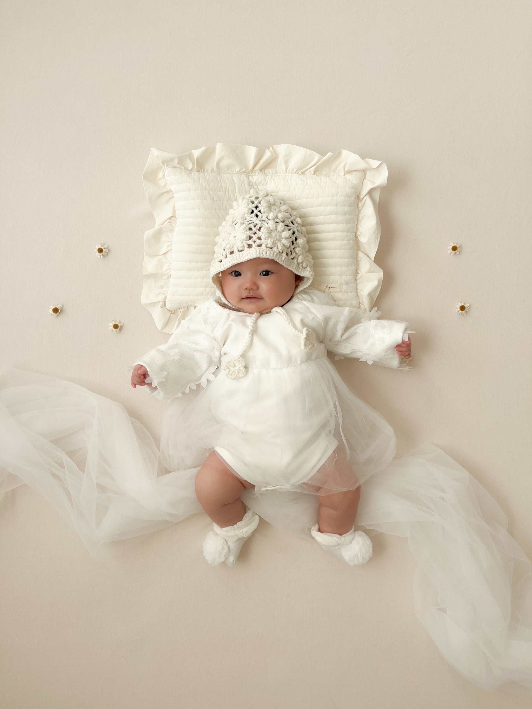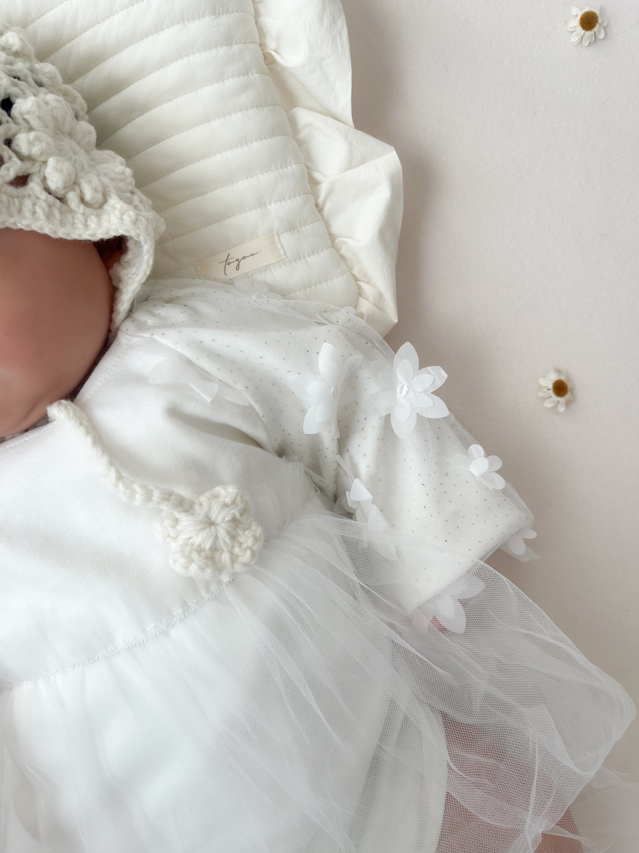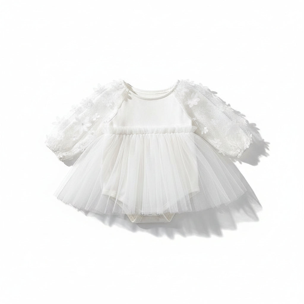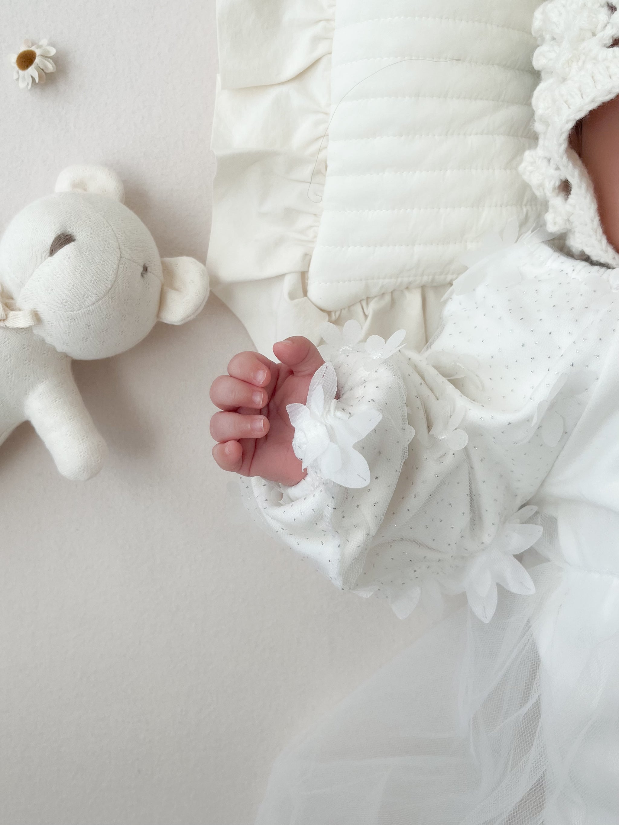 立体フラワーをあしらった透け感チュール袖が目を惹く、華やかなドレスロンパース。ふんわり広がるチュールスカートが、赤ちゃんの愛らしさをより一層引き立てます。特別な日やバースデーフォトにもぴったりな、とっておきの一着です。