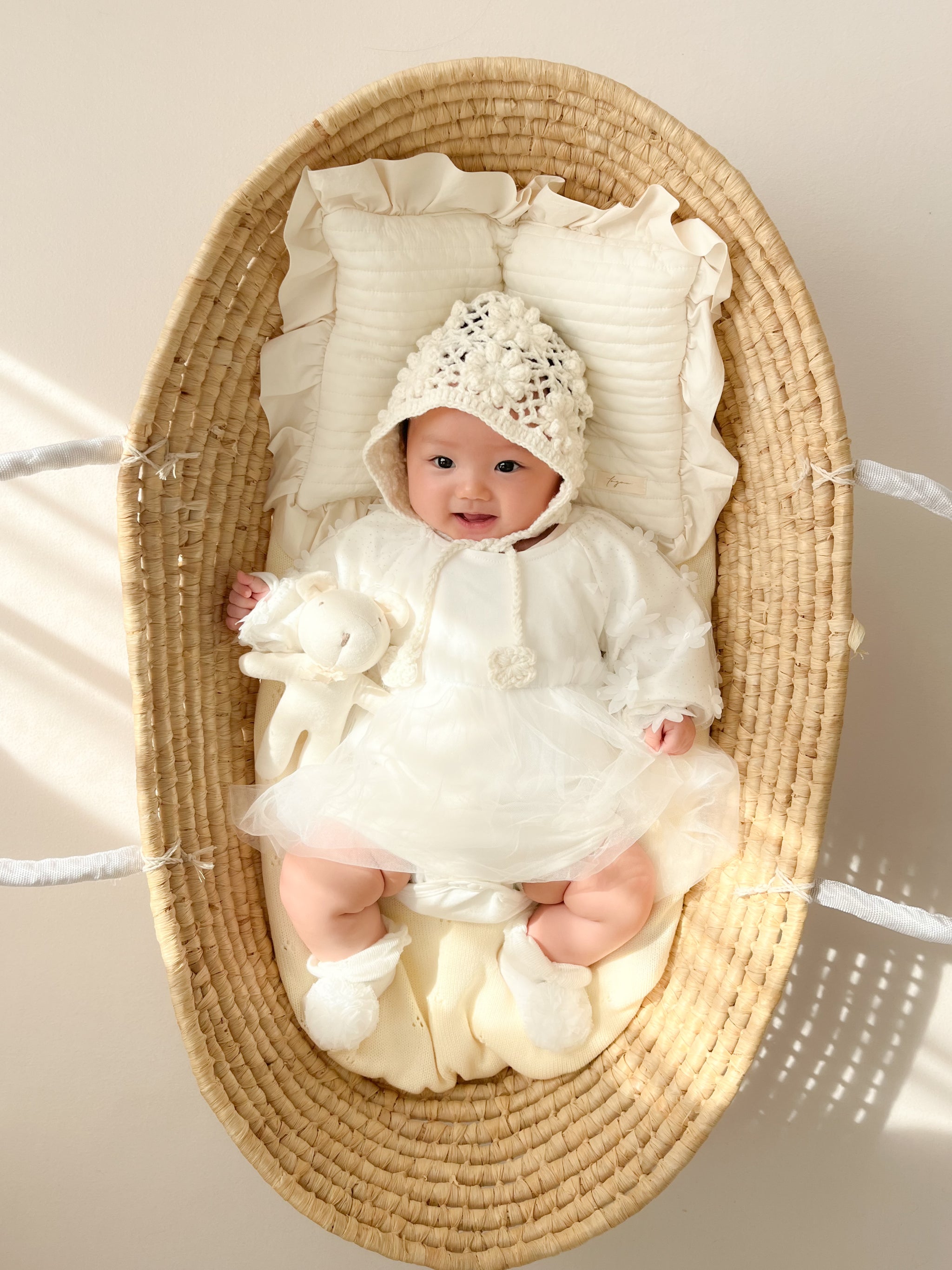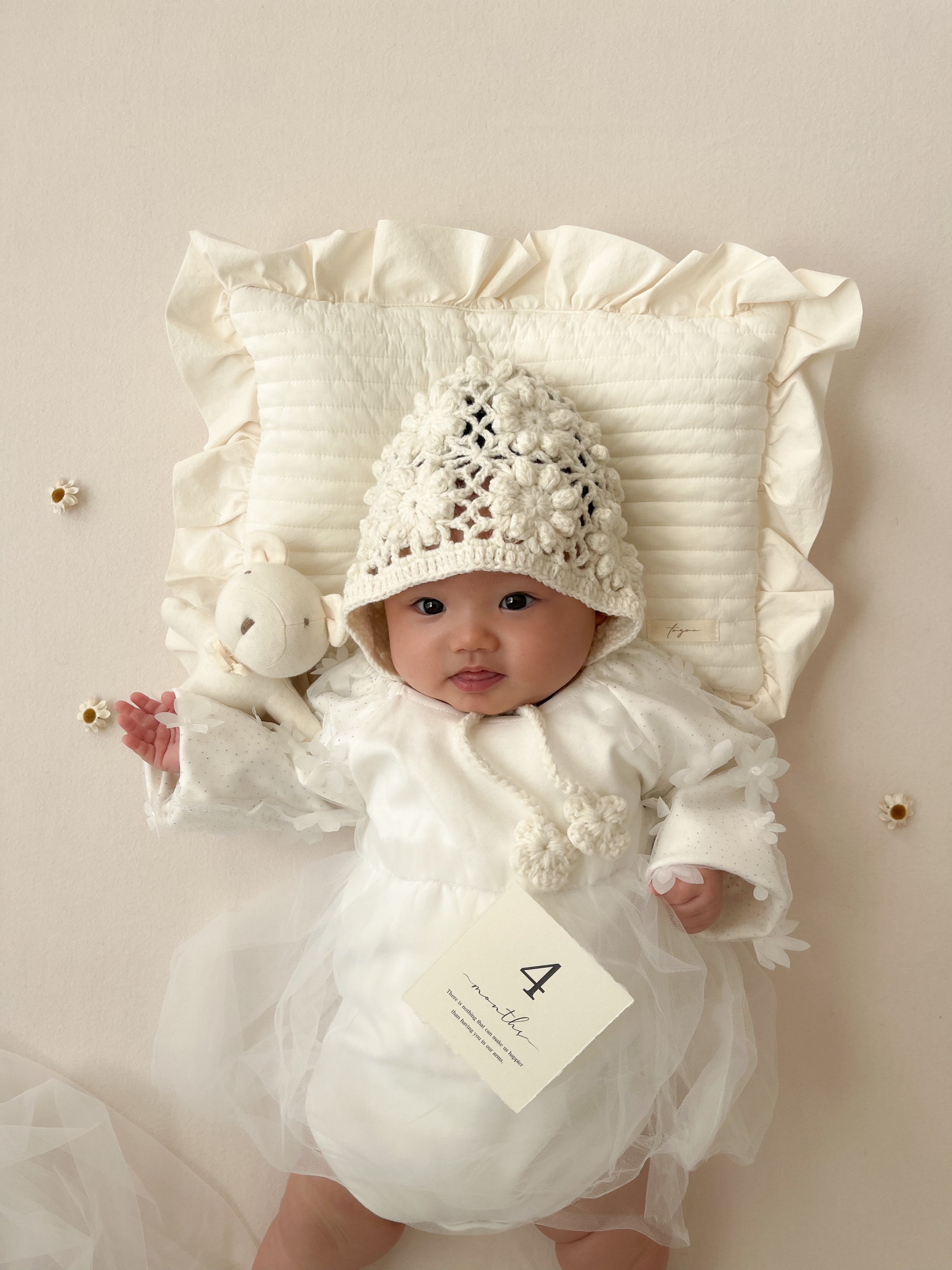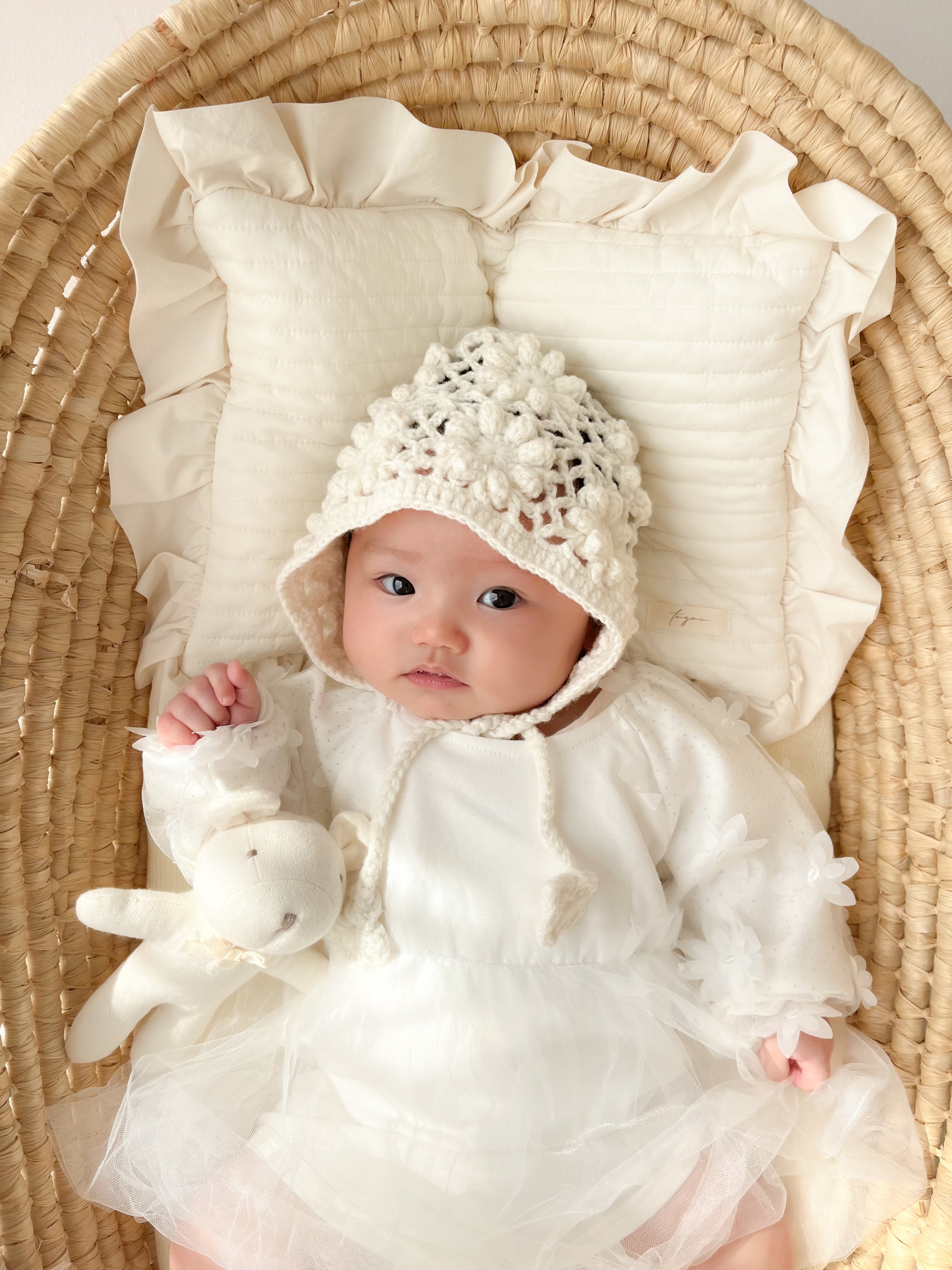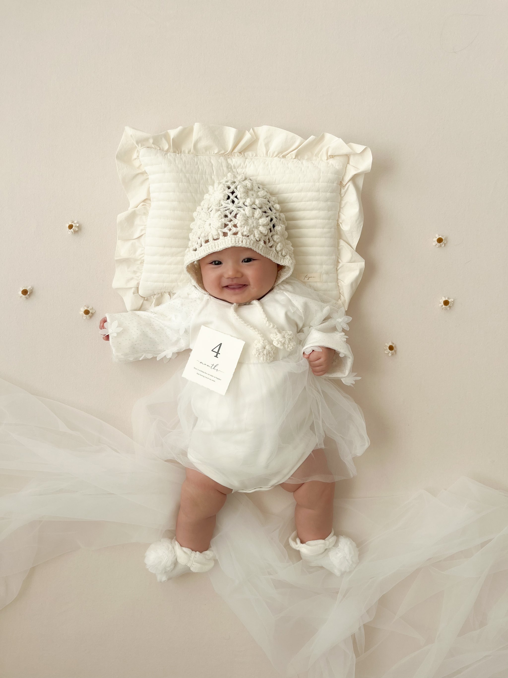 立体フラワーをあしらった透け感チュール袖が目を惹く、華やかなドレスロンパース。ふんわり広がるチュールスカートが、赤ちゃんの愛らしさをより一層引き立てます。特別な日やバースデーフォトにもぴったりな、とっておきの一着です。