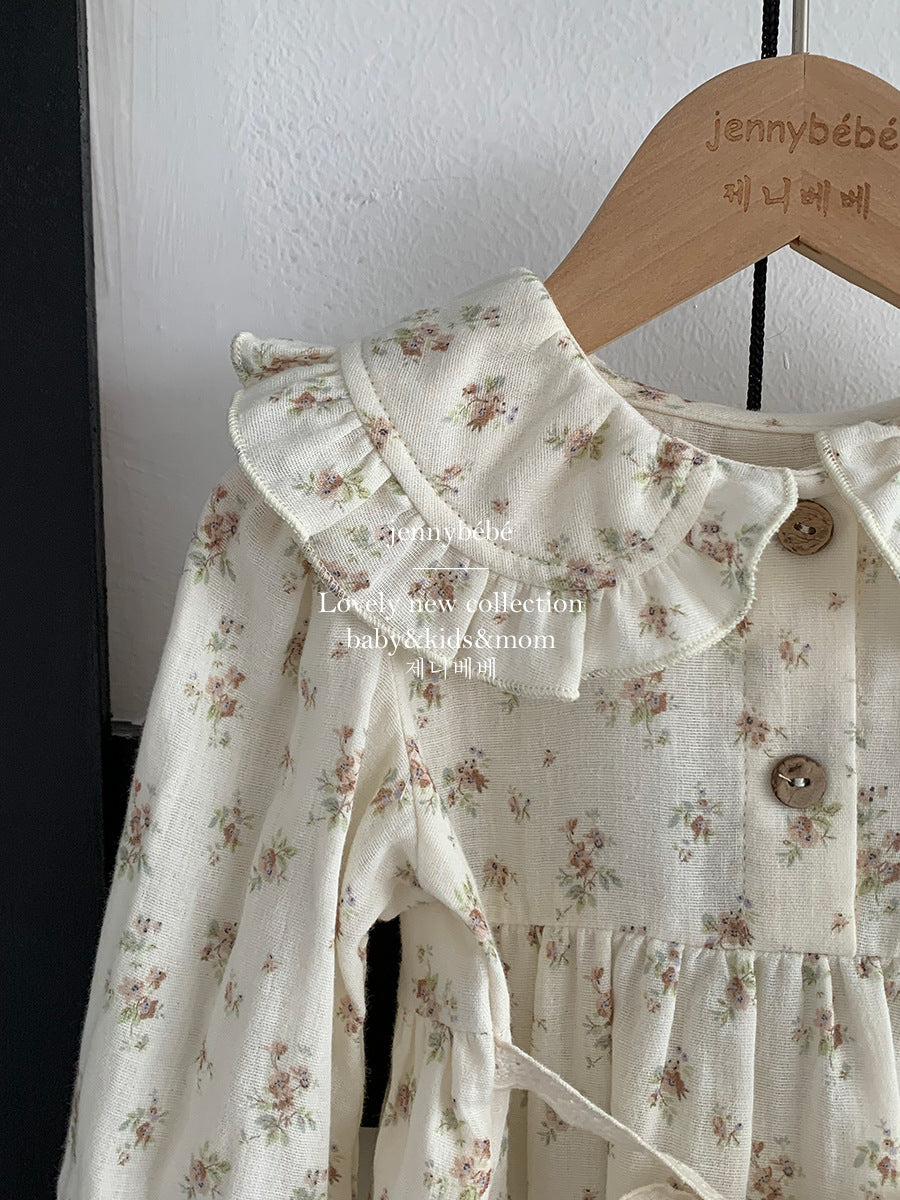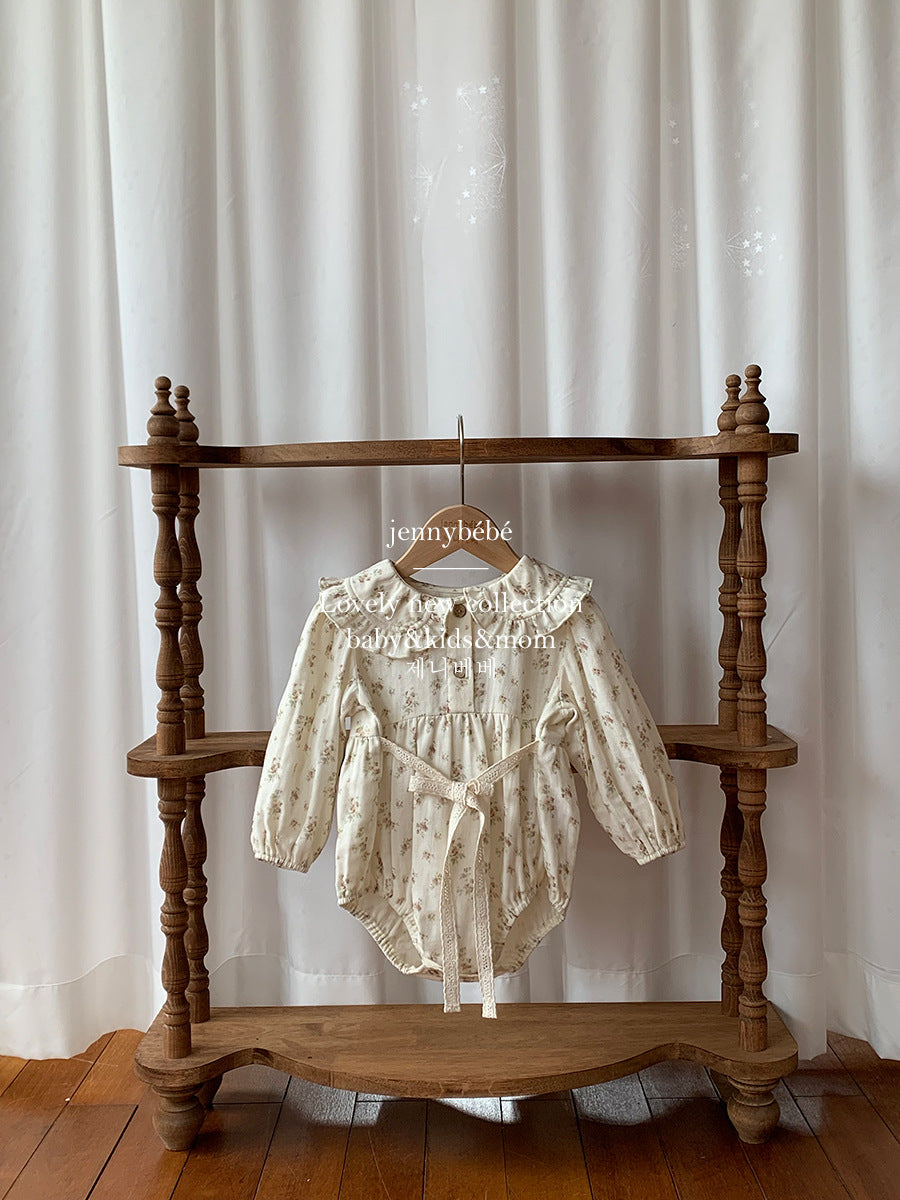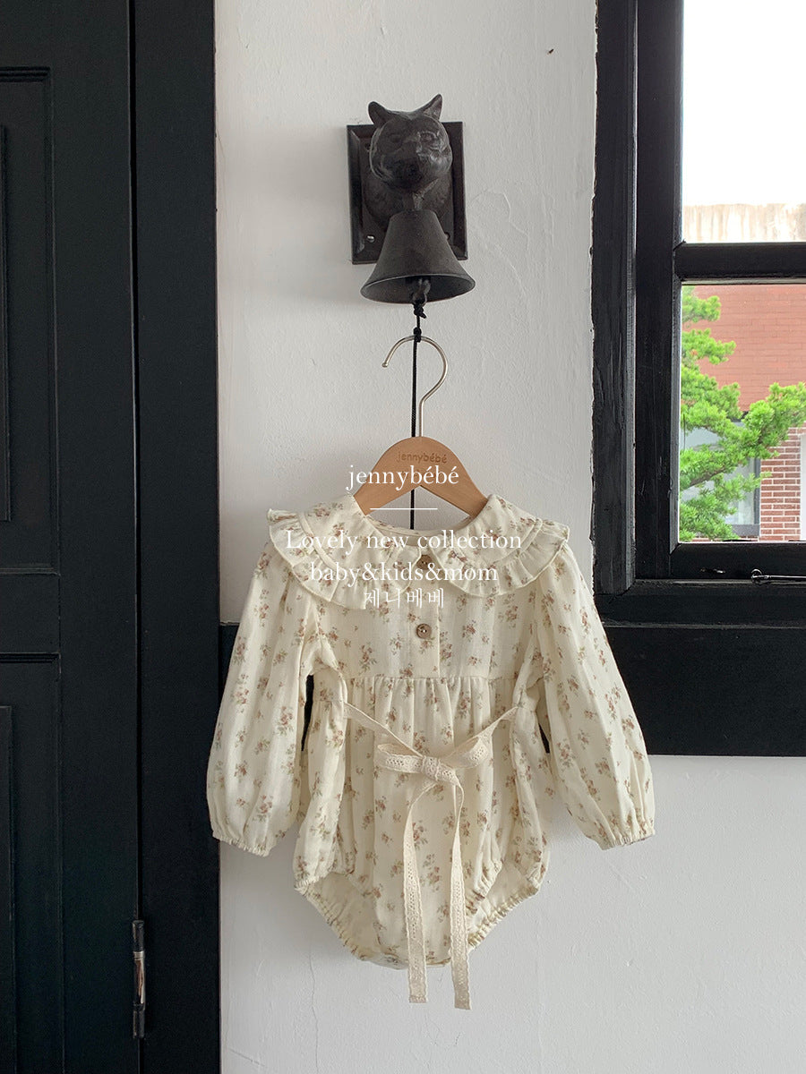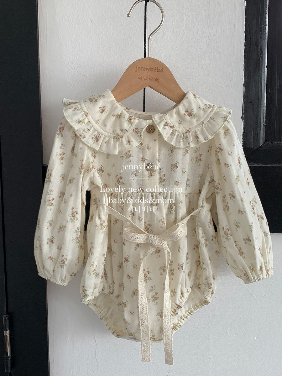 繊細な小花柄と、ふんわり広がるレースカラーが印象的なロンパース。やわらかな色合いが、赤ちゃんの可愛らしさをより引き立てます。ウエストのリボンディテールが、さりげないアクセントに。ululuらしい“やさしく儚い可愛さ”を詰め込んだ一枚です。