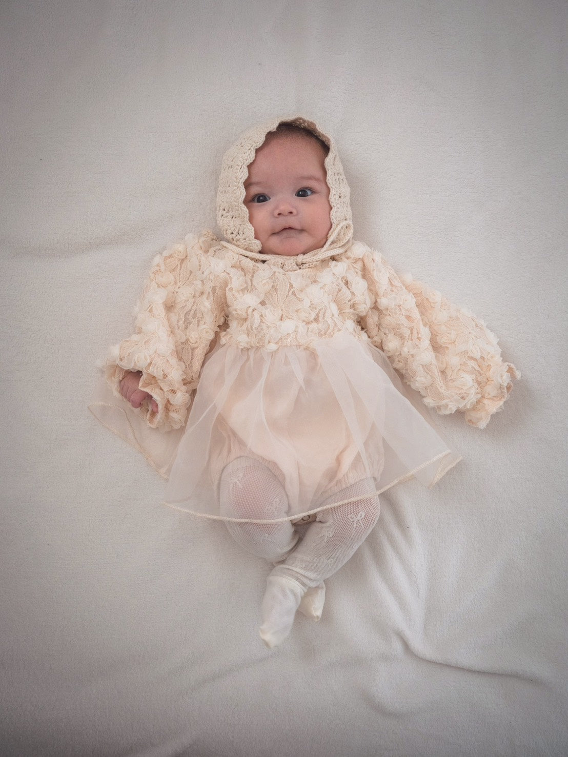 繊細なフローラルレースと、ふんわり広がるチュールスカートが愛らしいベビードレスロンパース