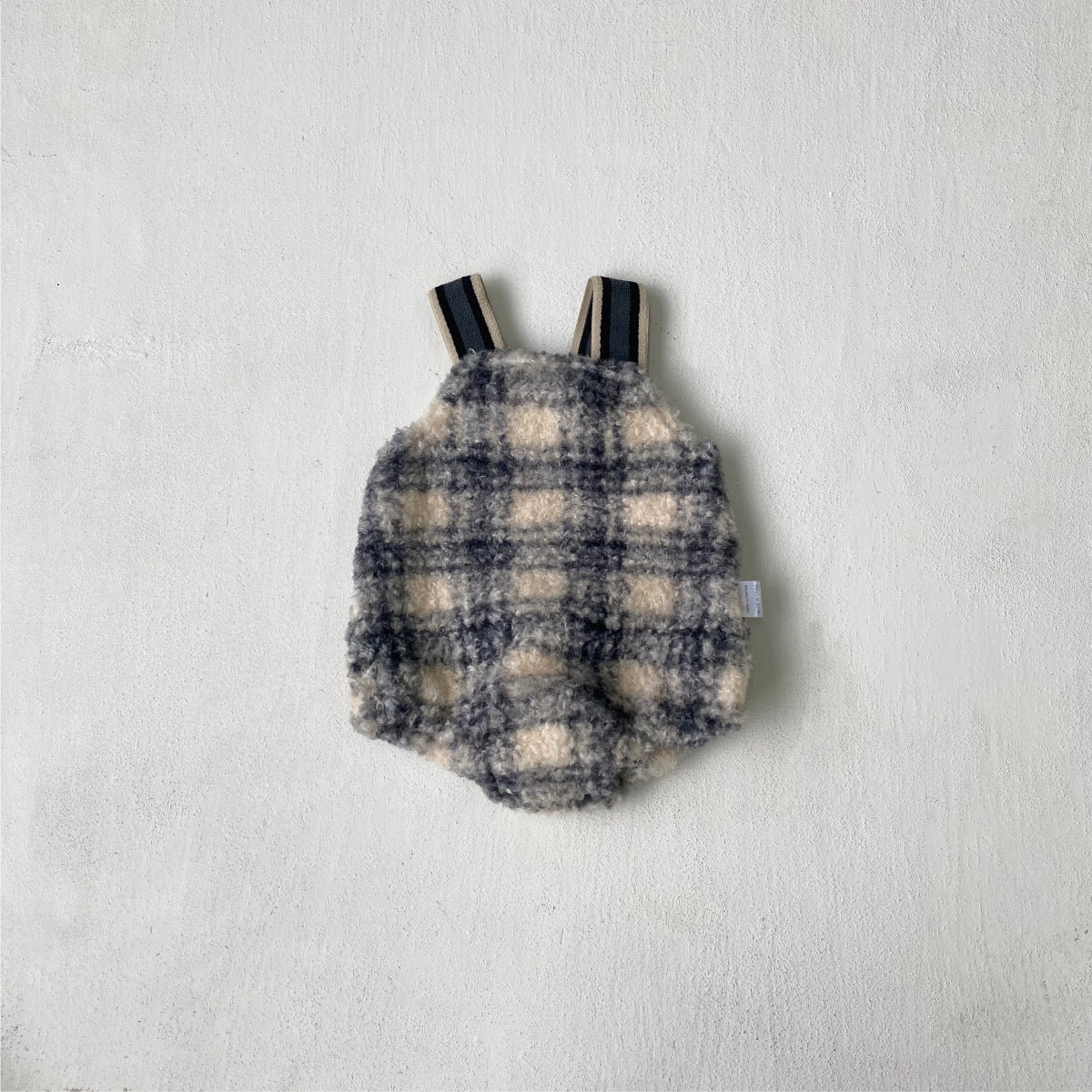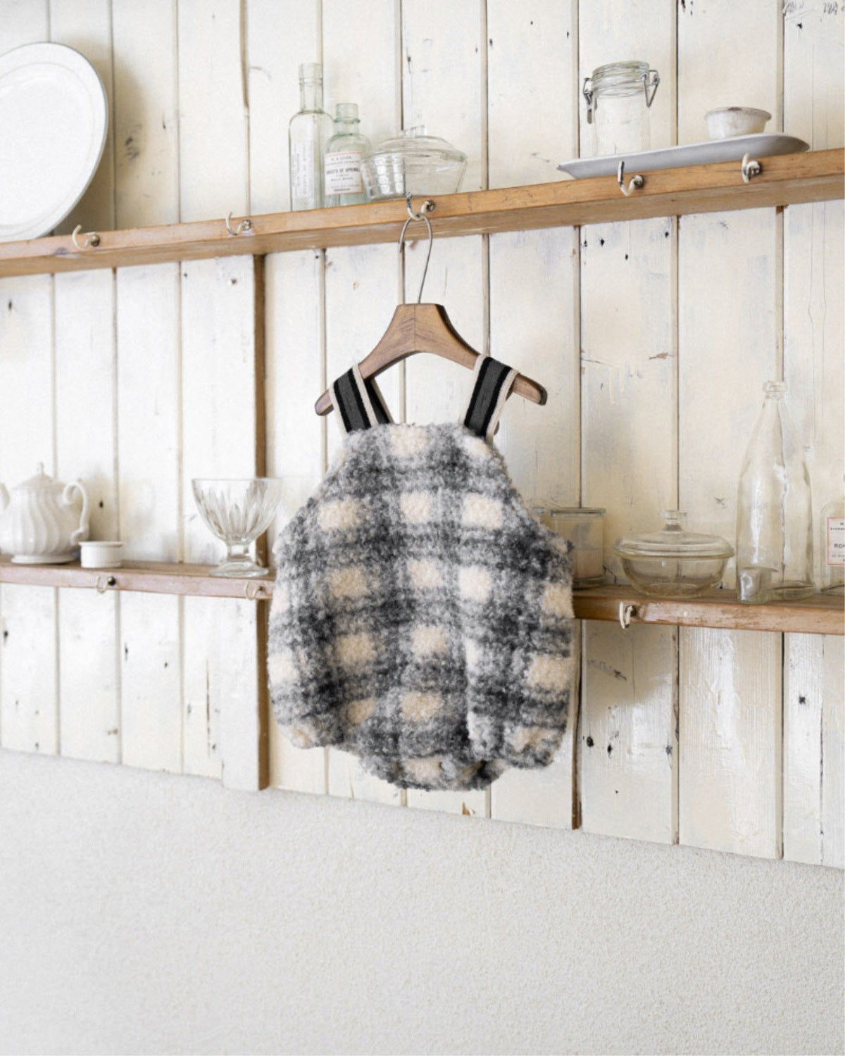 ふんわりとしたボア素材に、やさしい配色のチェック柄をあしらったベビー用サロペットブルマ。立体感のあるもこもこ素材が、秋冬らしい温もりのある表情を演出します。