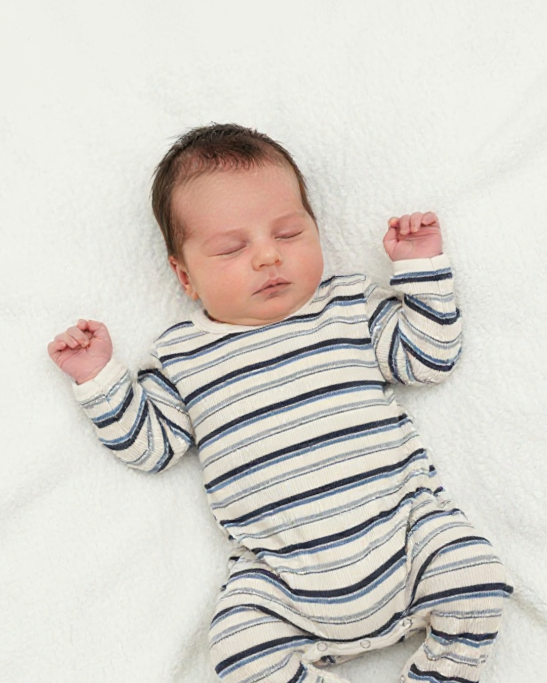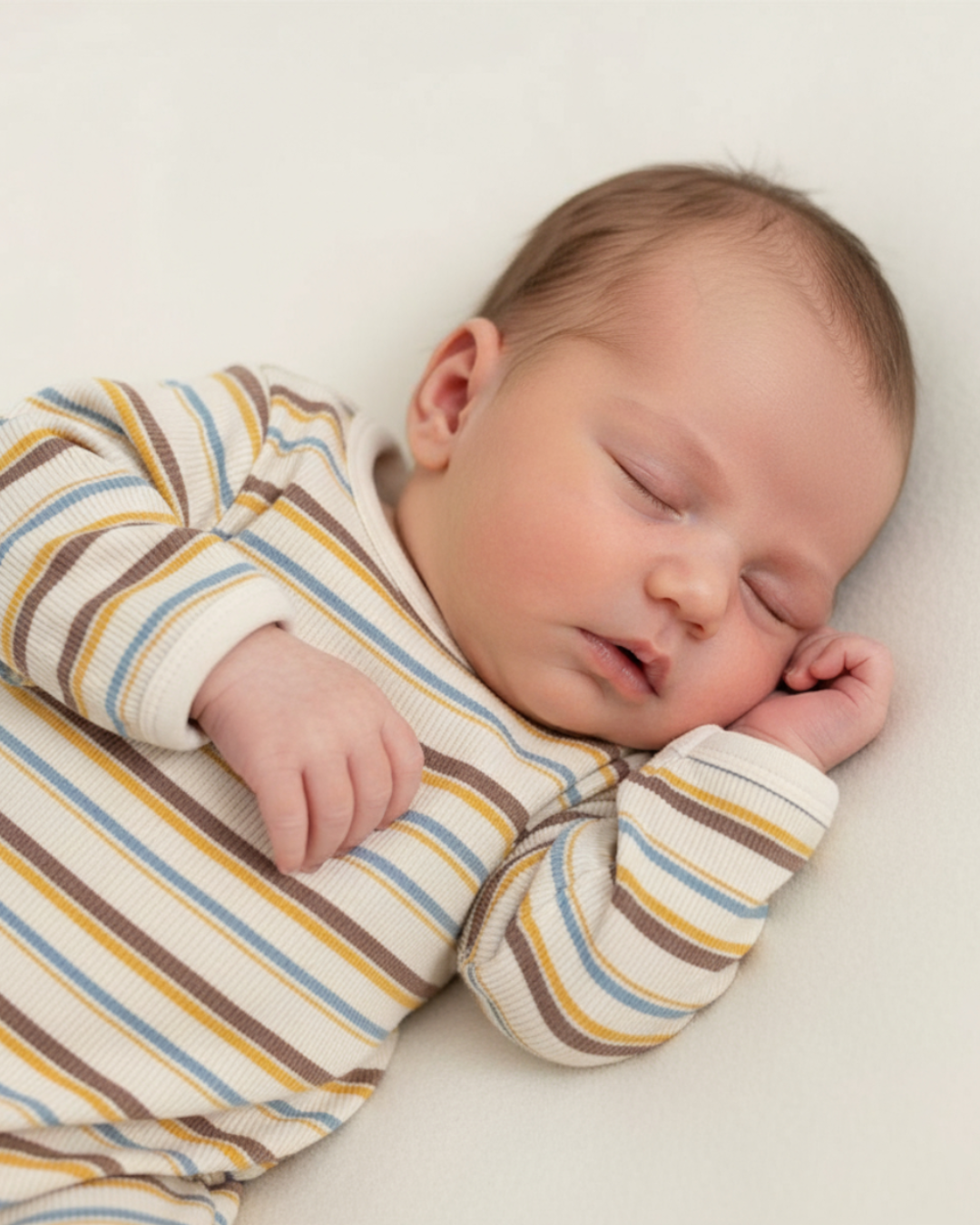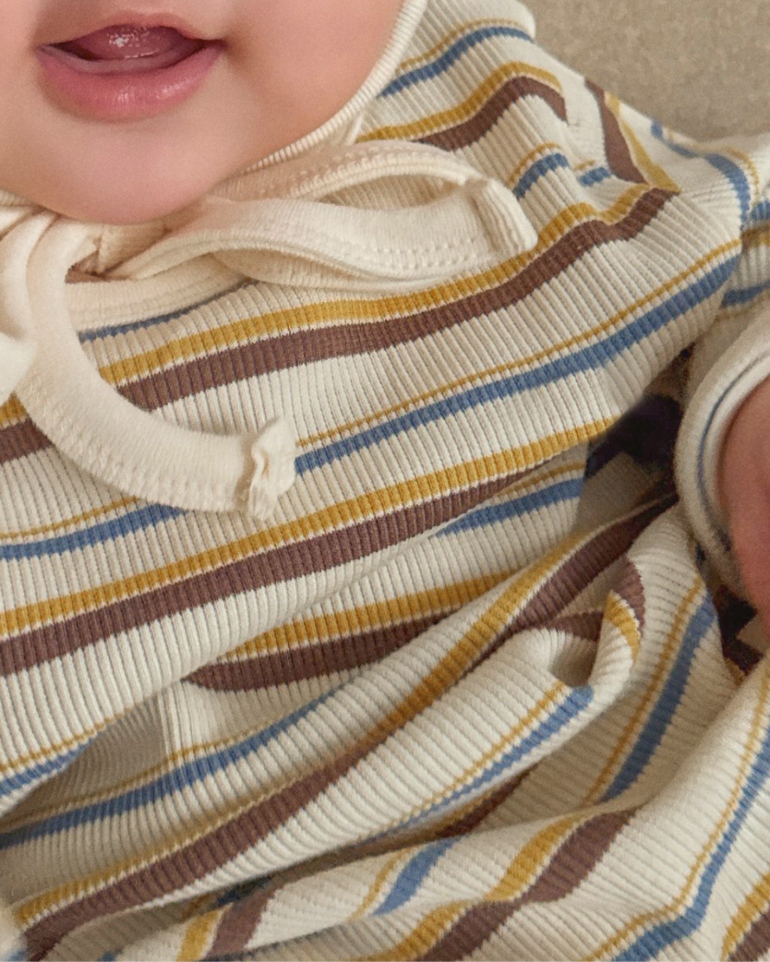 やわらかく伸縮性のあるリブ素材で、赤ちゃんの動きをやさしく包み込むロンパース。