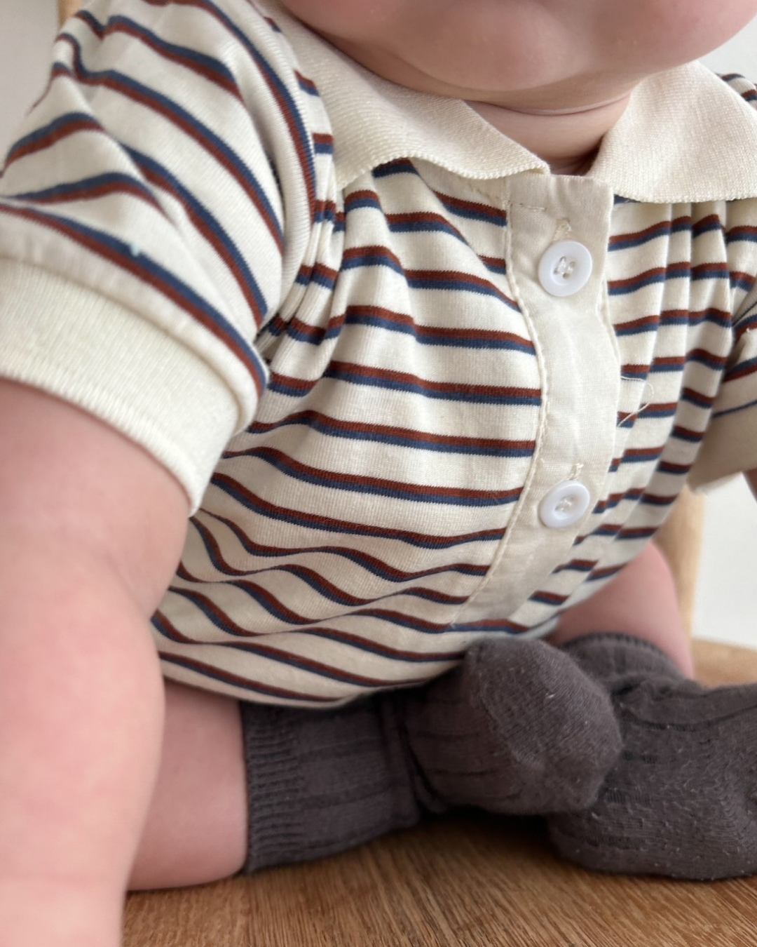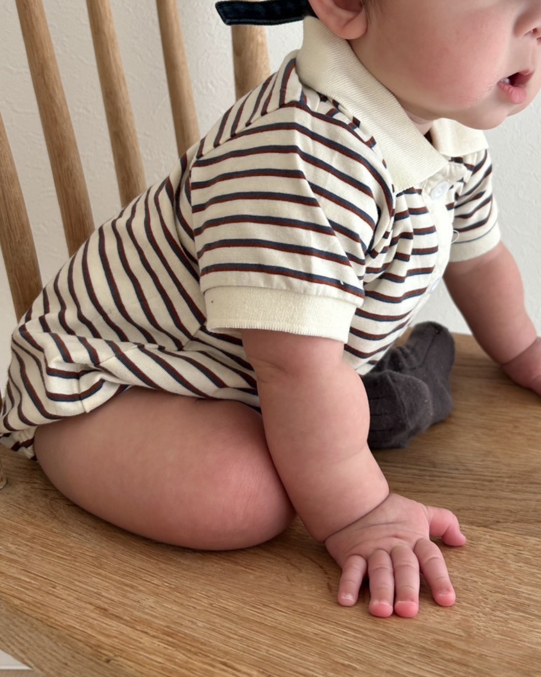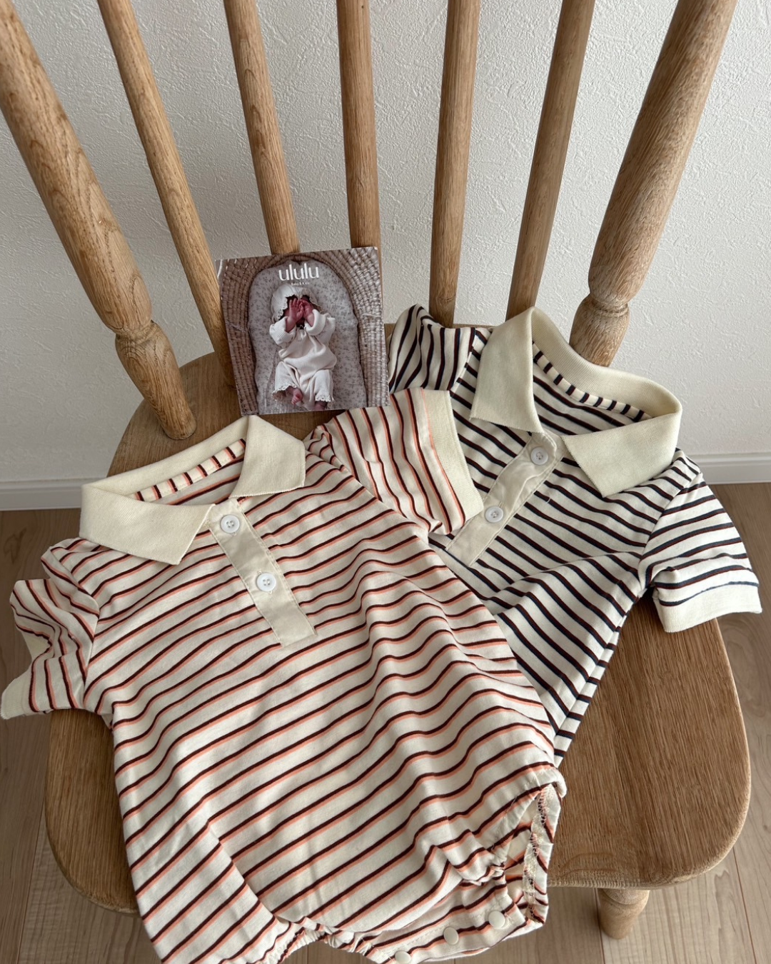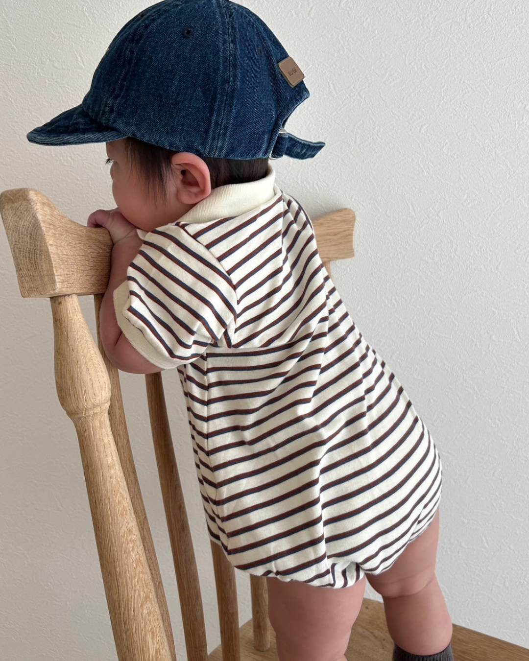 おしゃれでクラシックなデザインが魅力のボーダー襟付きロンパース♡