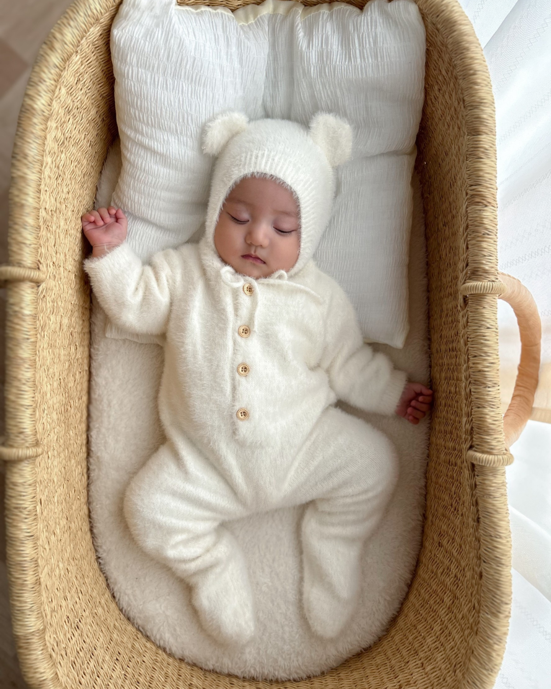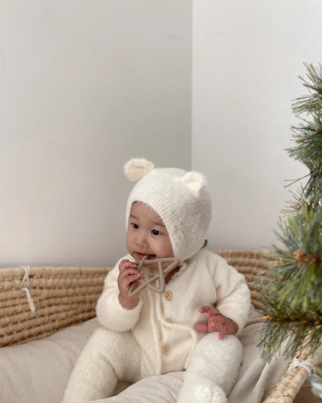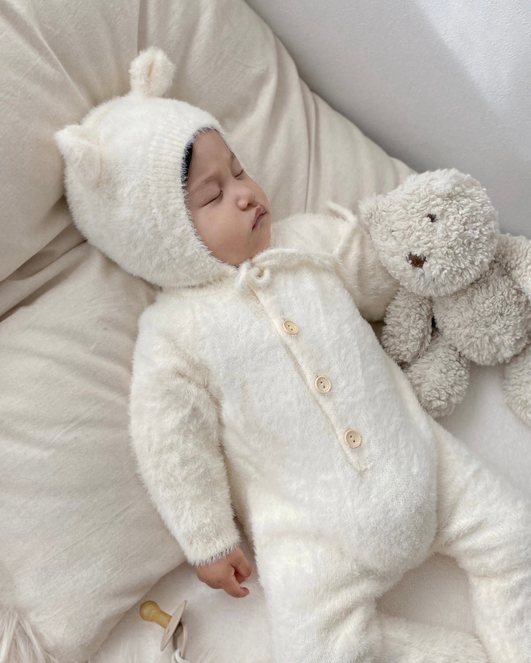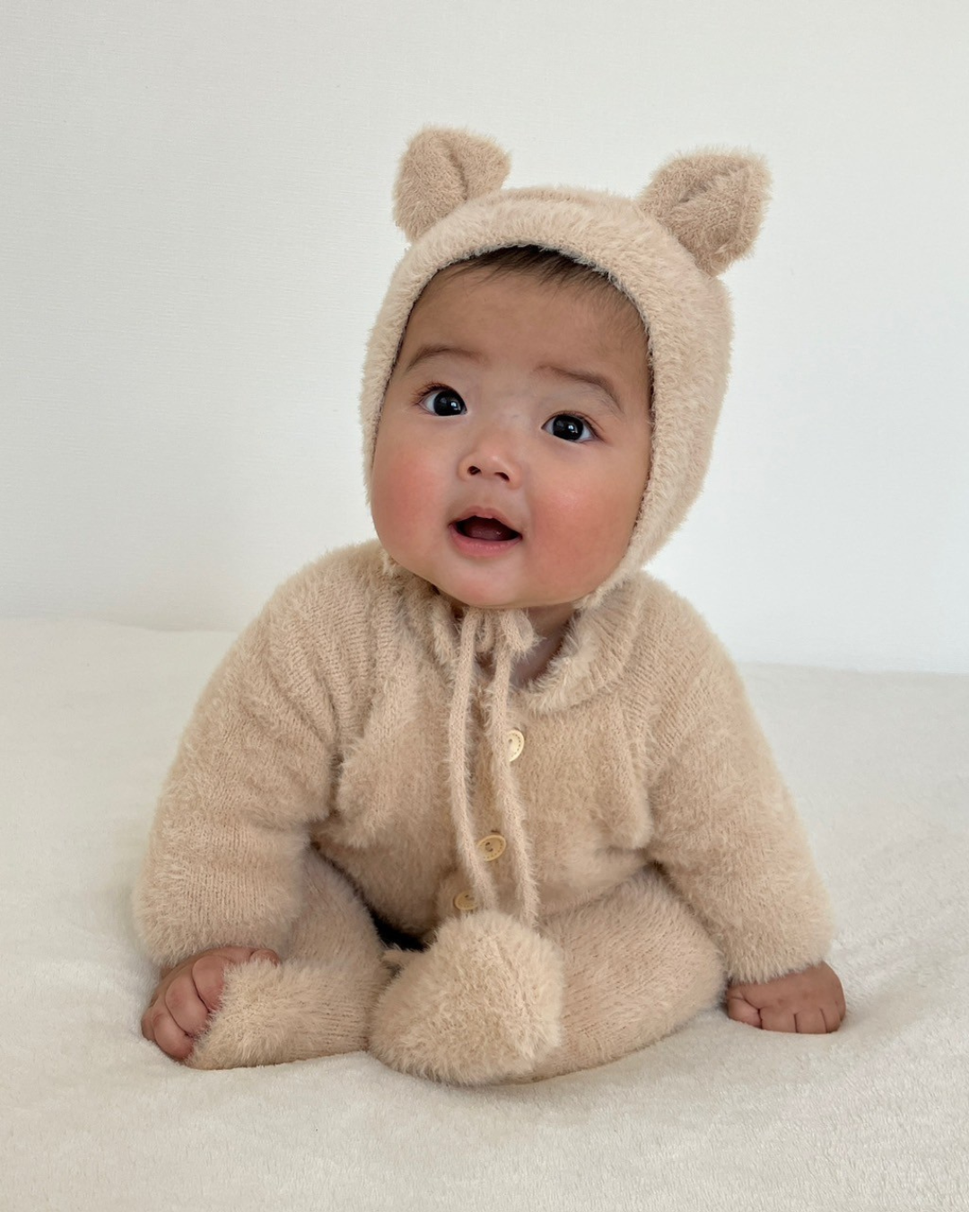 ボンネットとロンパースの2点セットで、まるでぬいぐるみのような愛らしさです。おうち時間にもお出かけにもぴったりな、冬の定番アイテムです♡