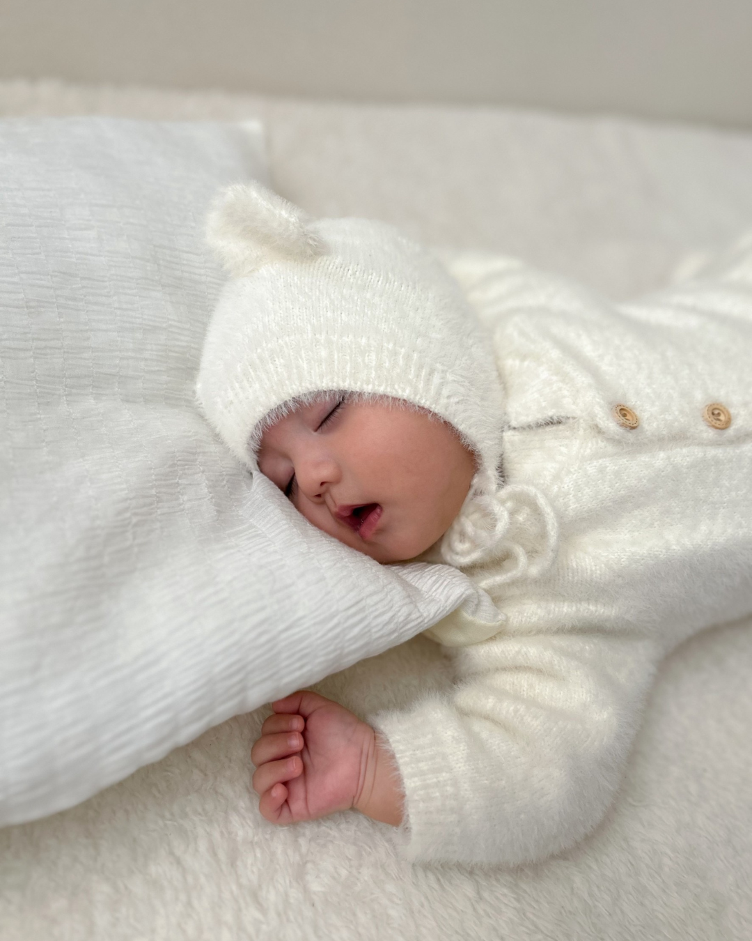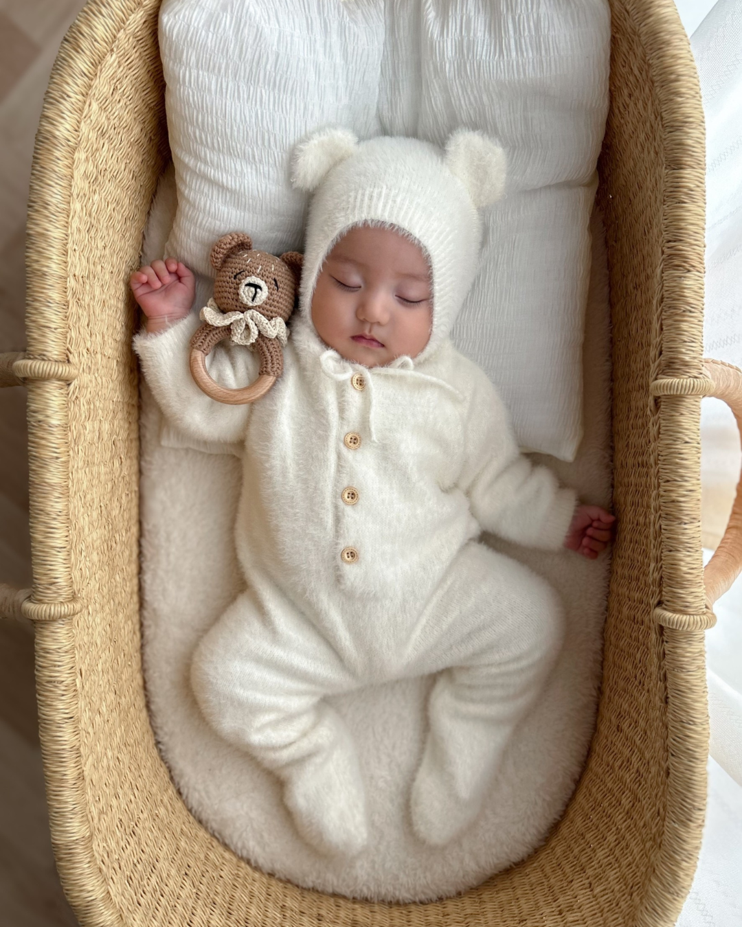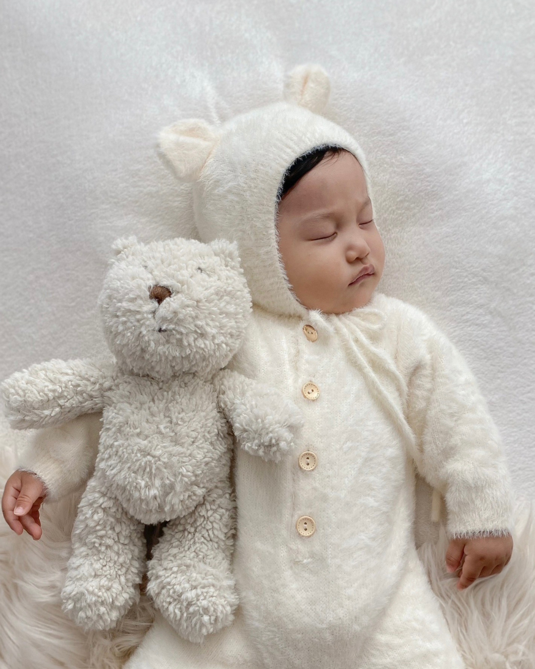 ボンネットとロンパースの2点セットで、まるでぬいぐるみのような愛らしさです。おうち時間にもお出かけにもぴったりな、冬の定番アイテムです♡