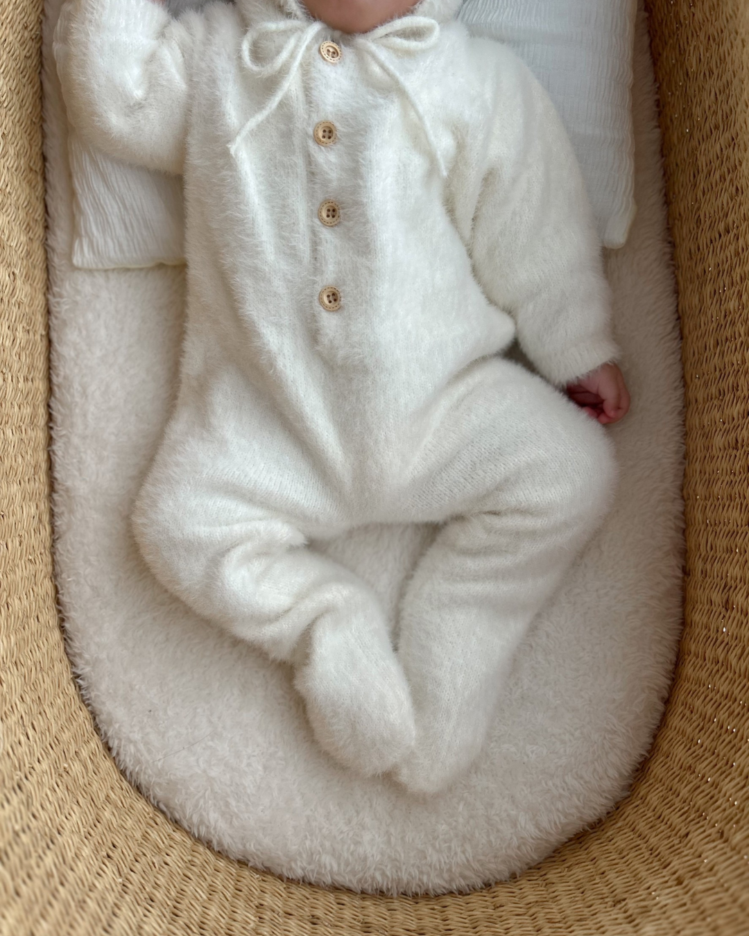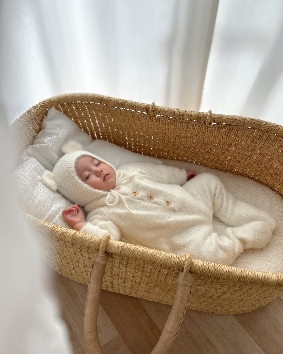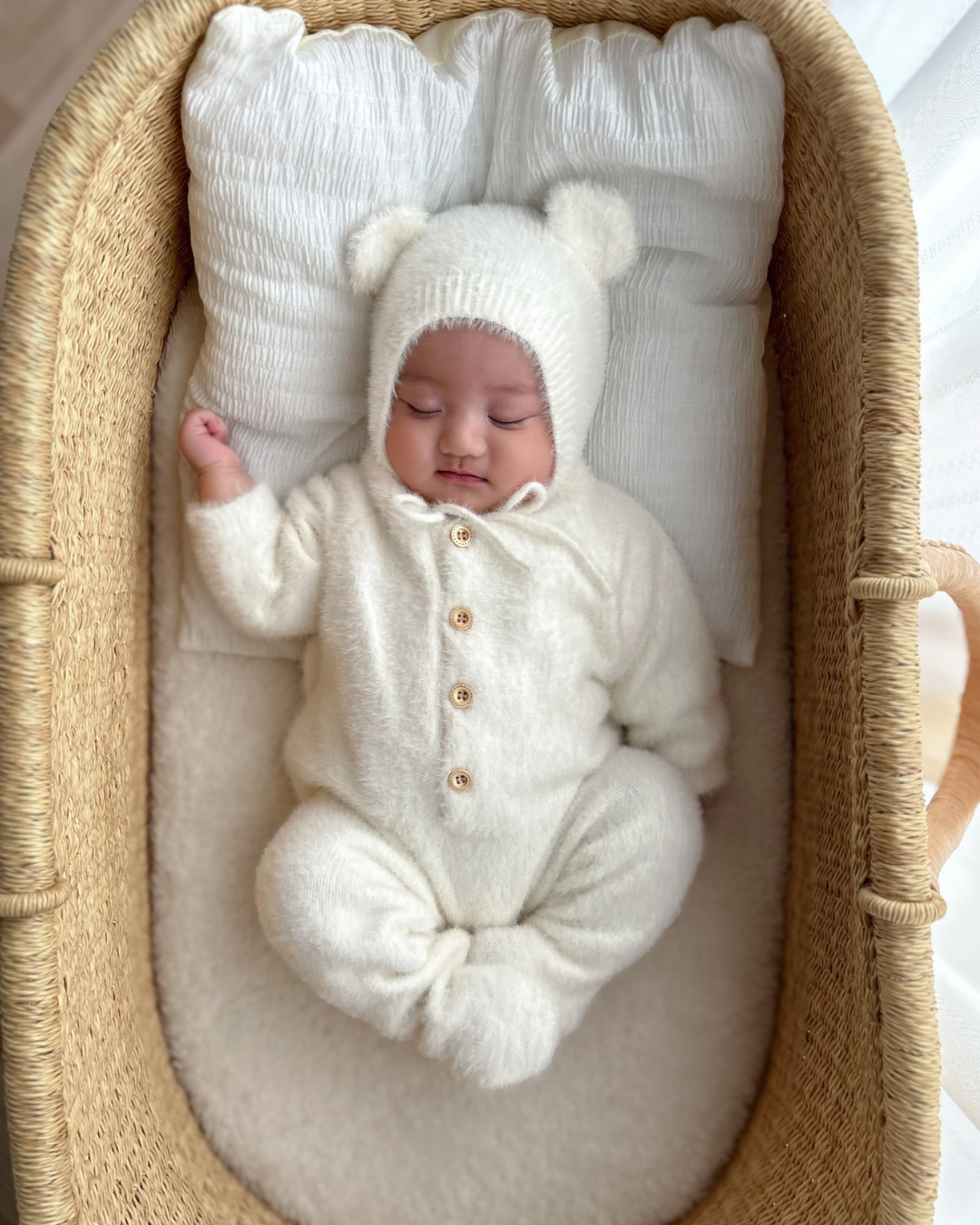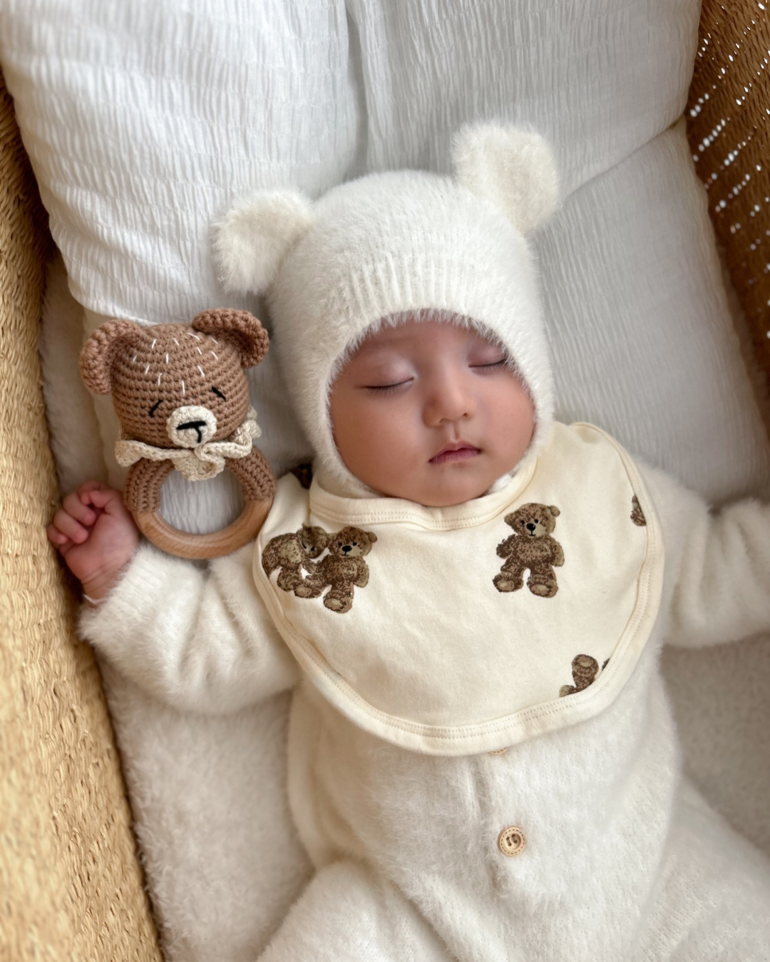 ボンネットとロンパースの2点セットで、まるでぬいぐるみのような愛らしさです。おうち時間にもお出かけにもぴったりな、冬の定番アイテムです♡
