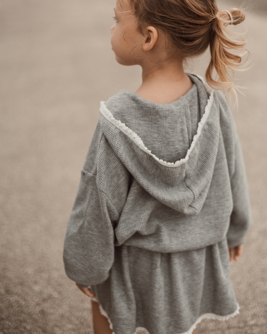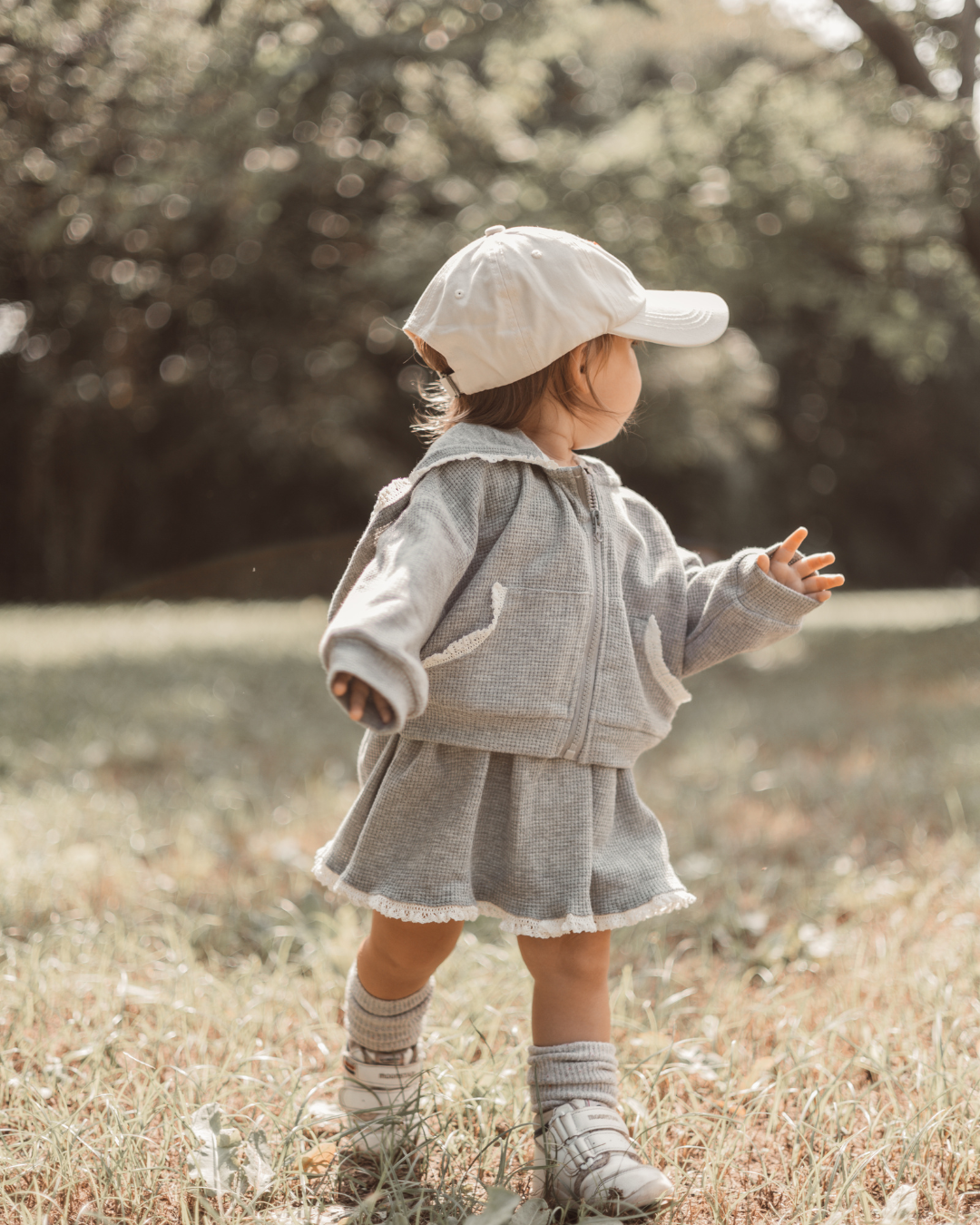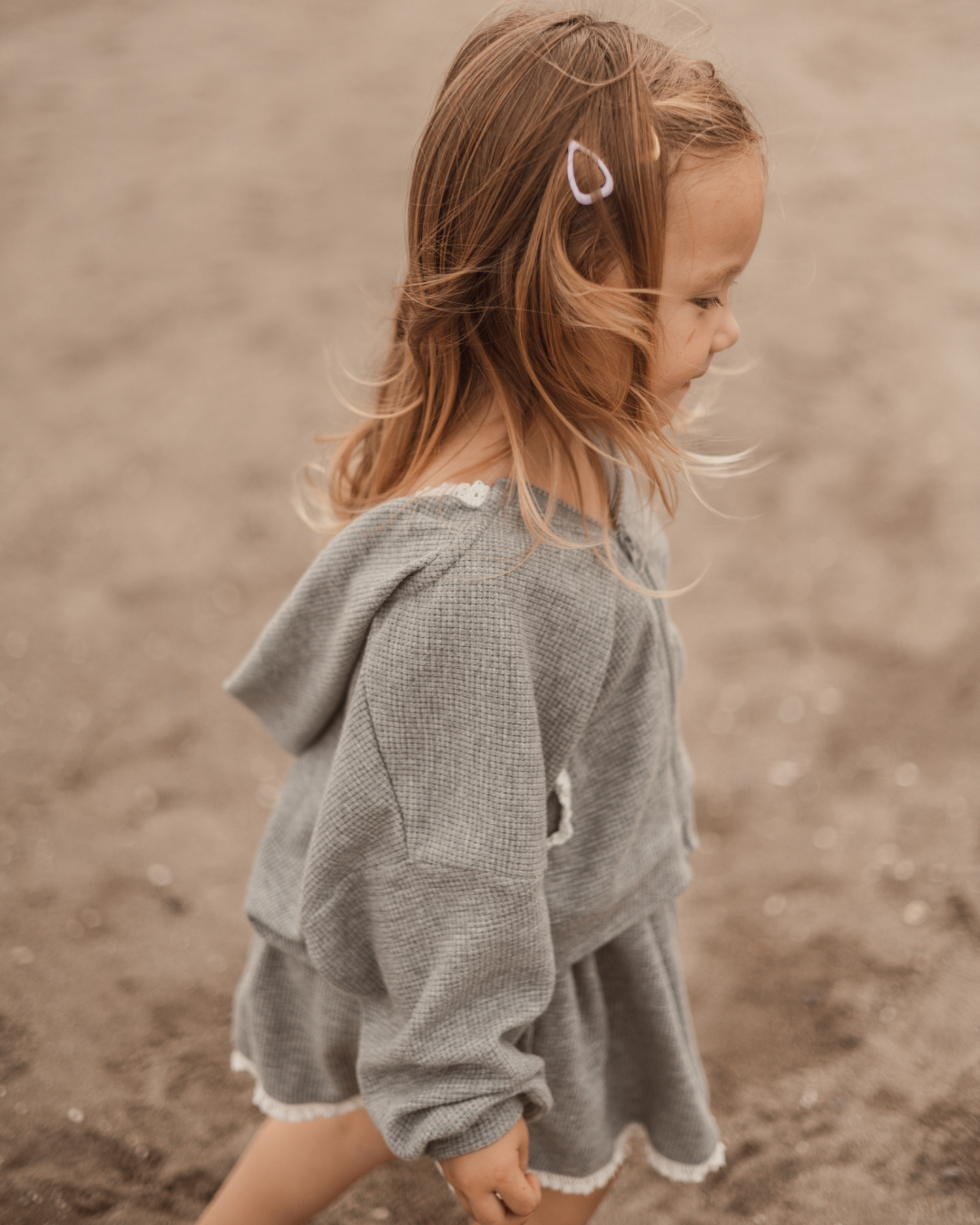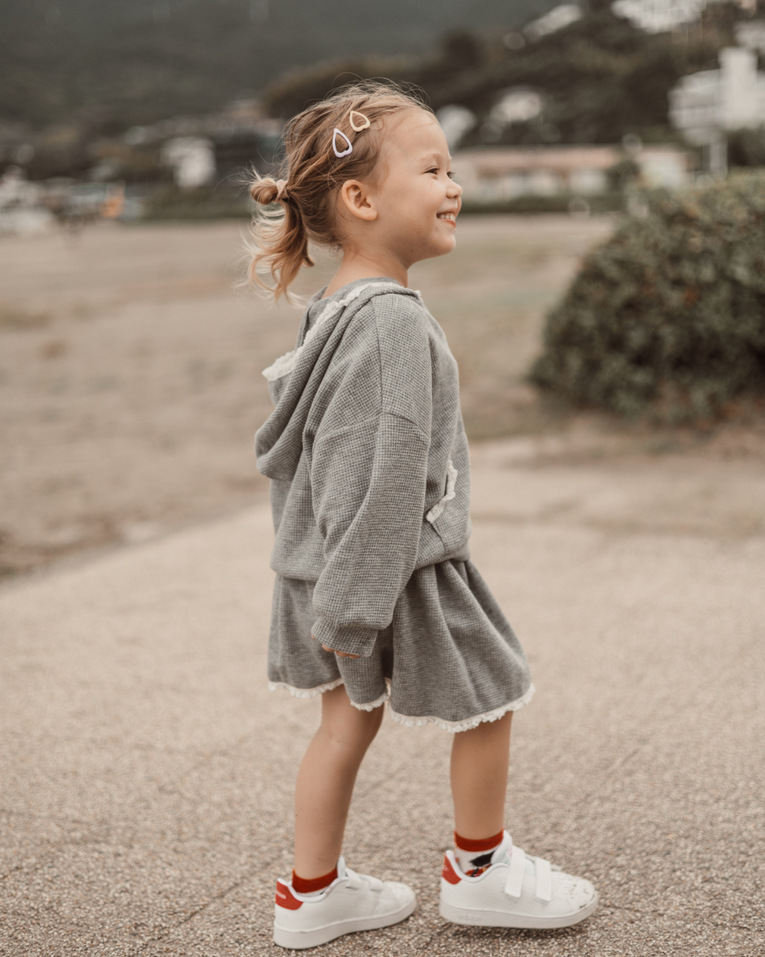 ワッフル風の柔らか素材に、裾のレースがアクセントになったガーリーセットアップ♡