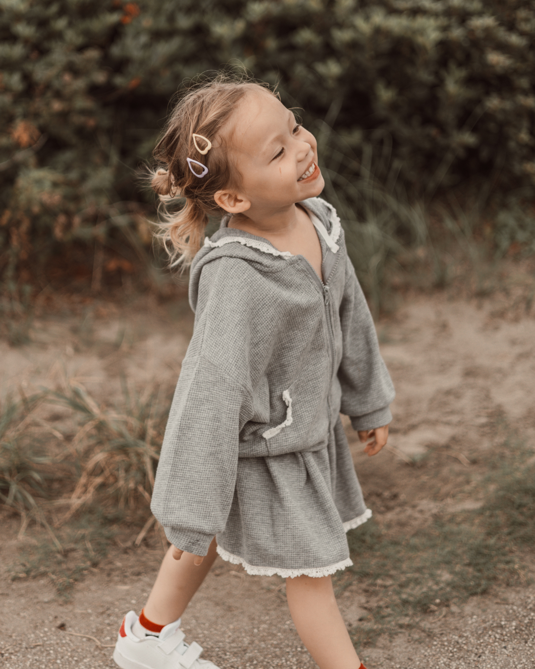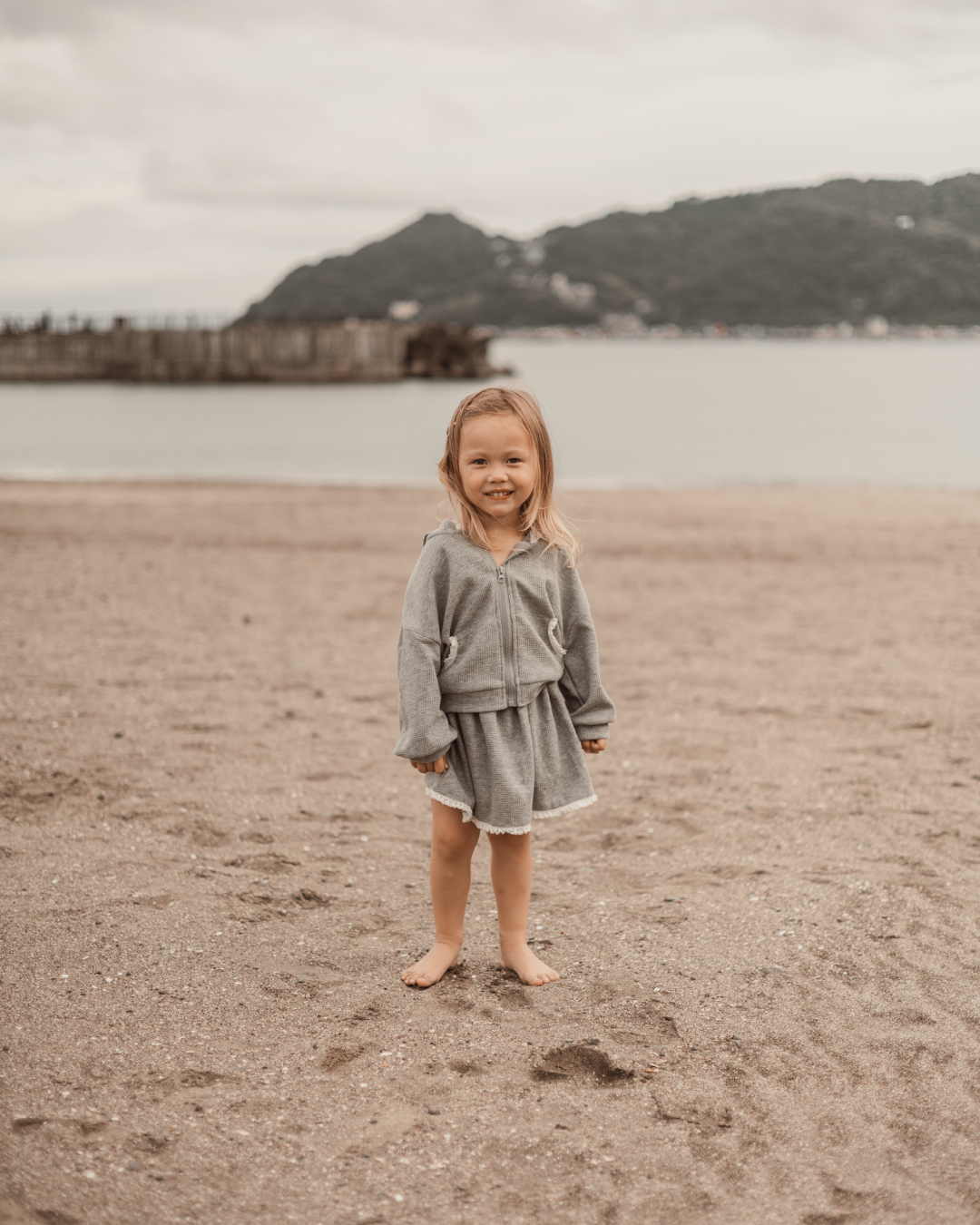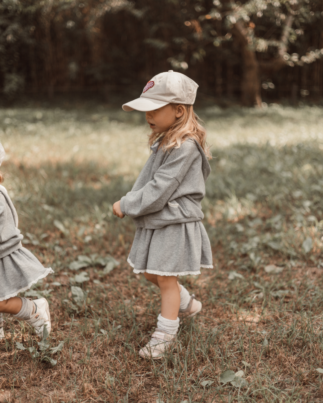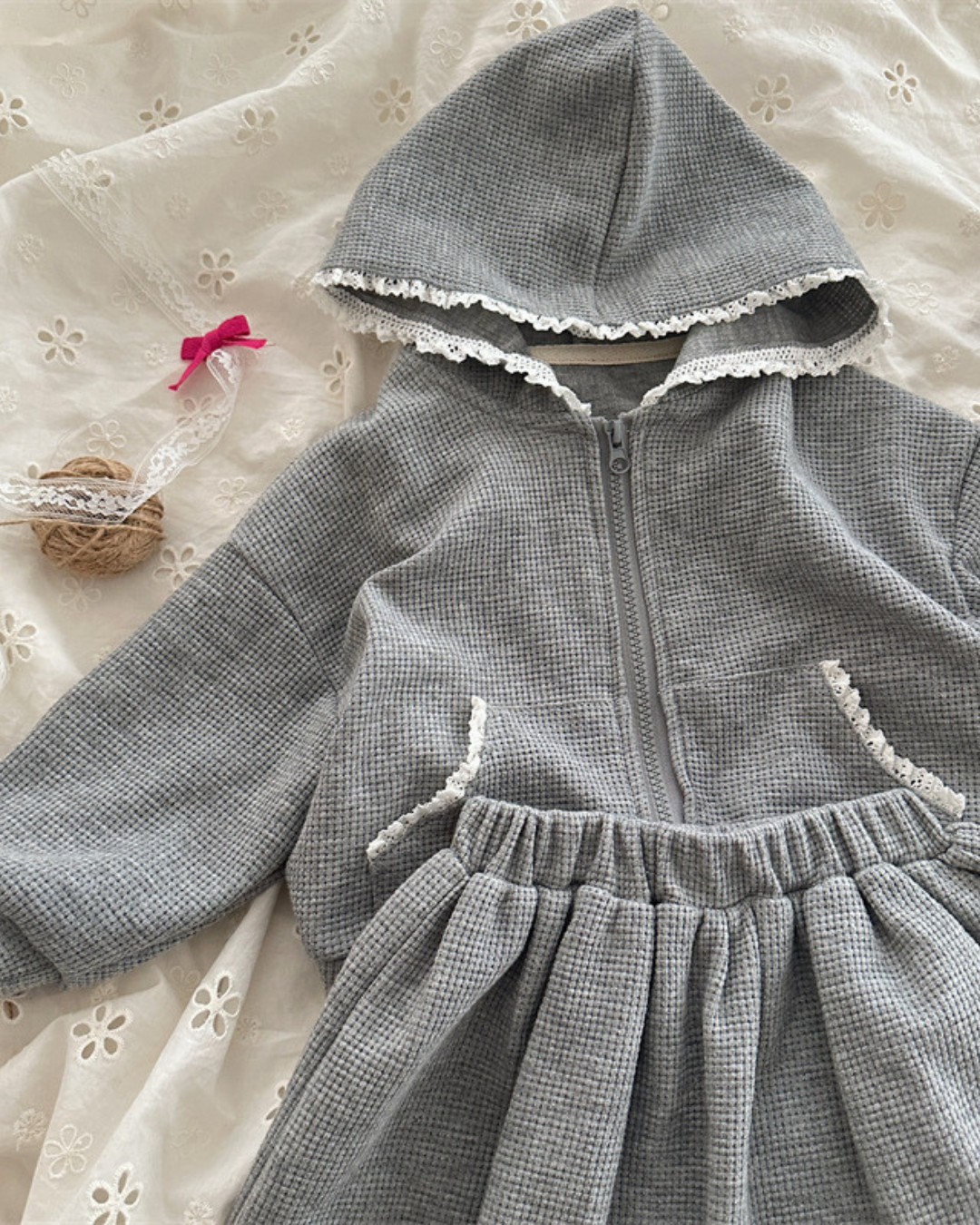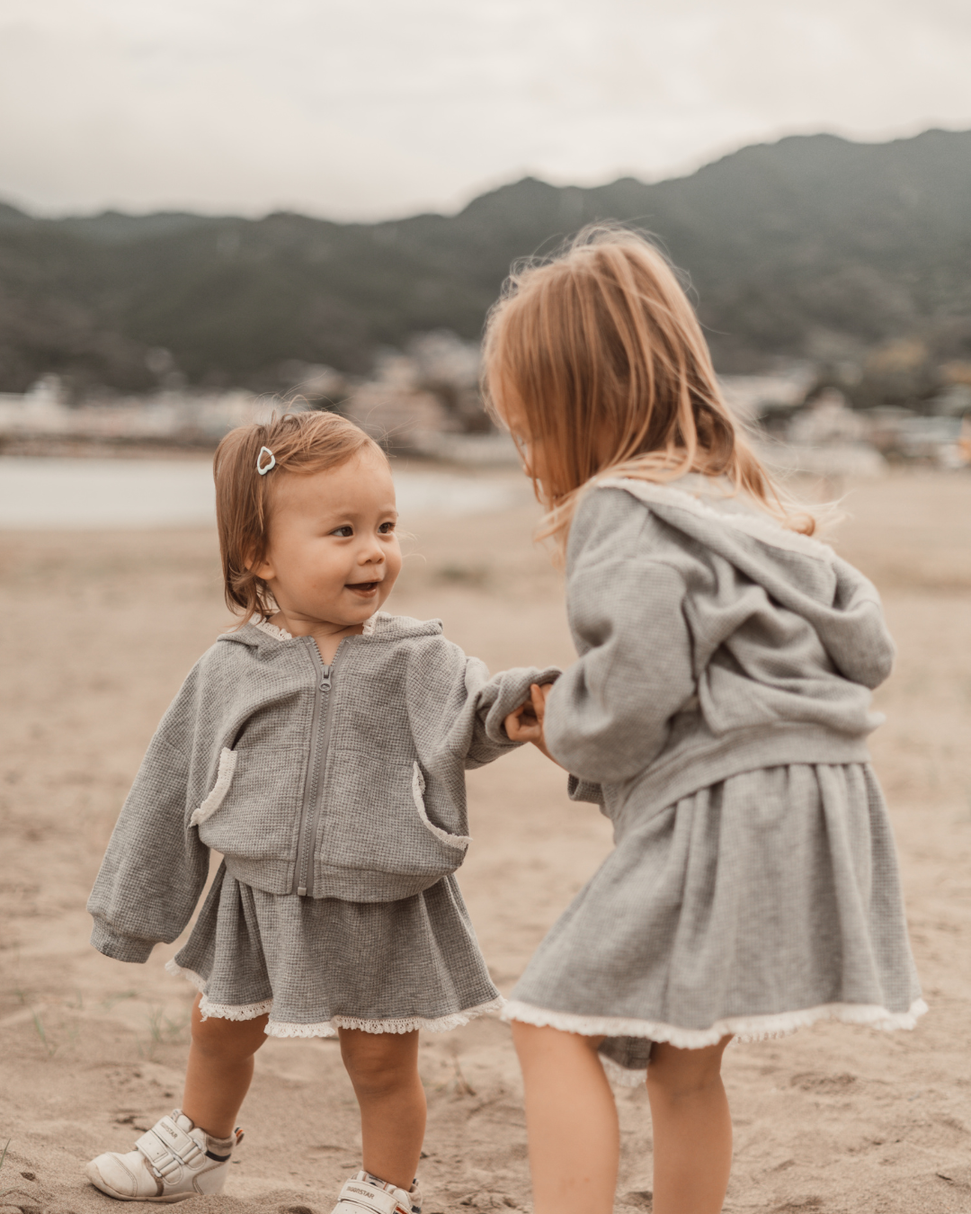 フード付きジップパーカーとふんわりスカートの組み合わせで、カジュアルなのに女の子らしさ満点。