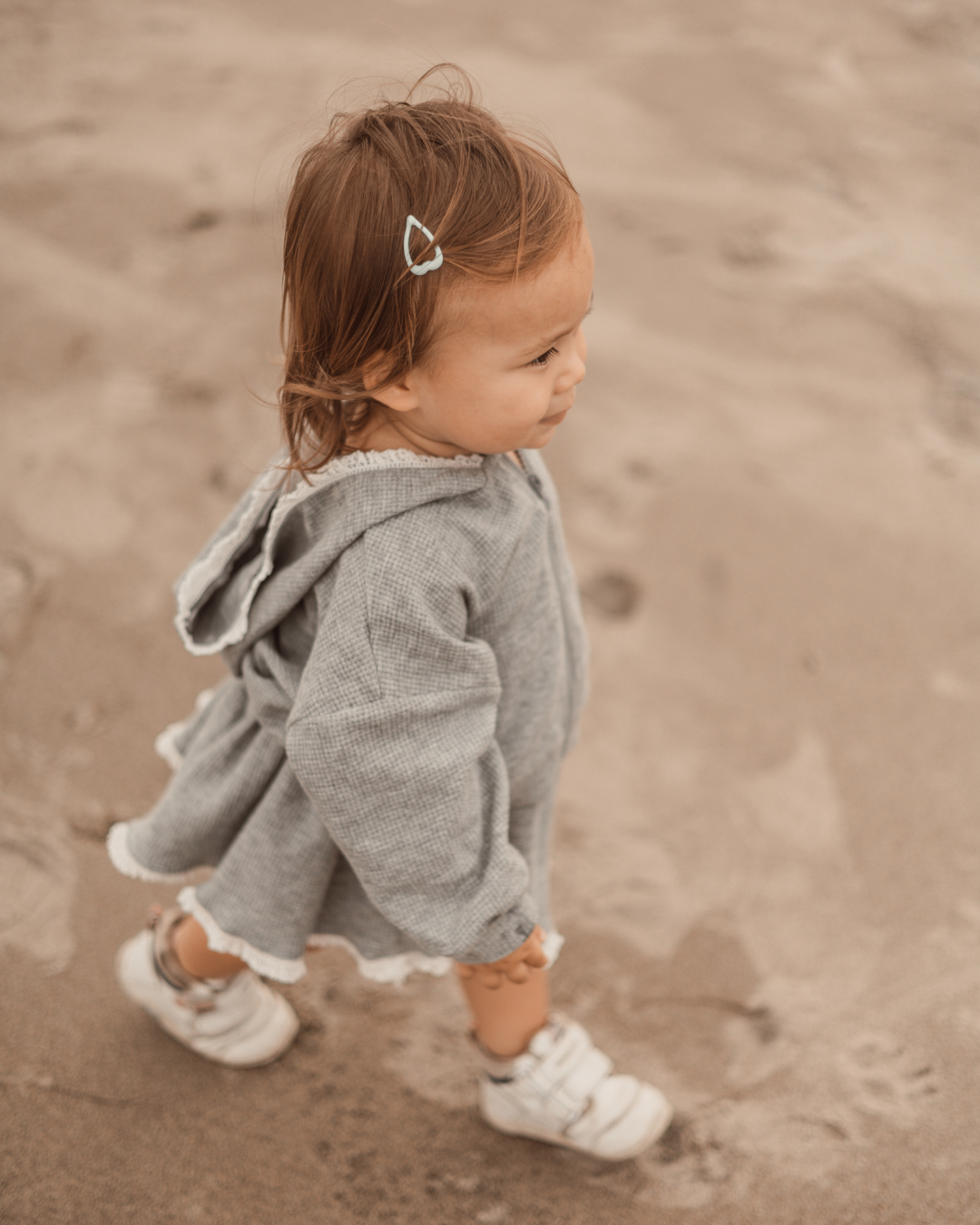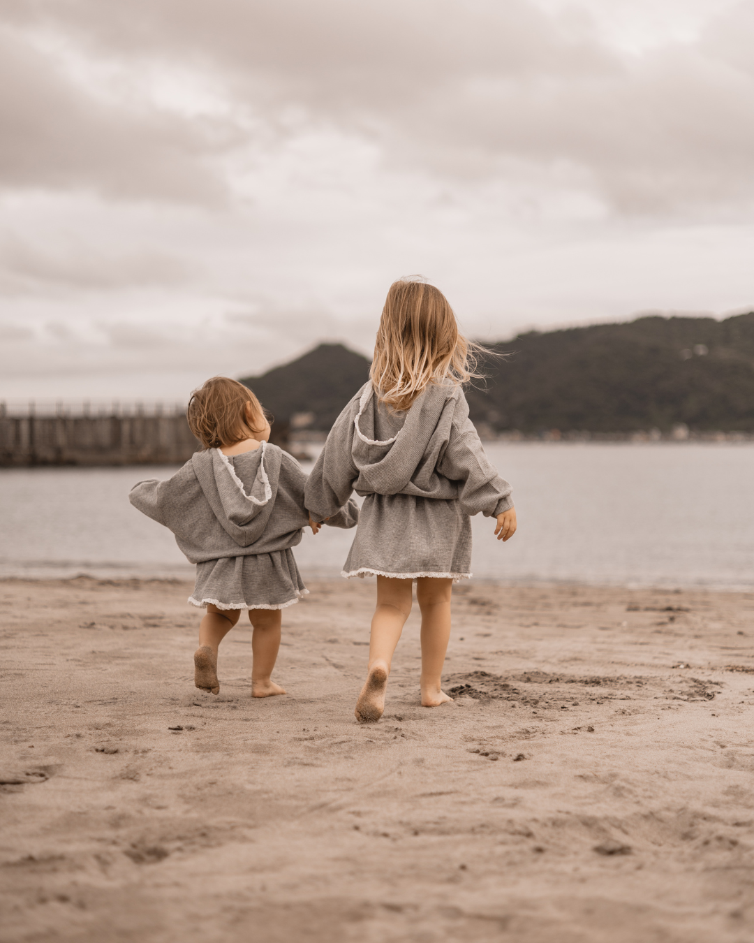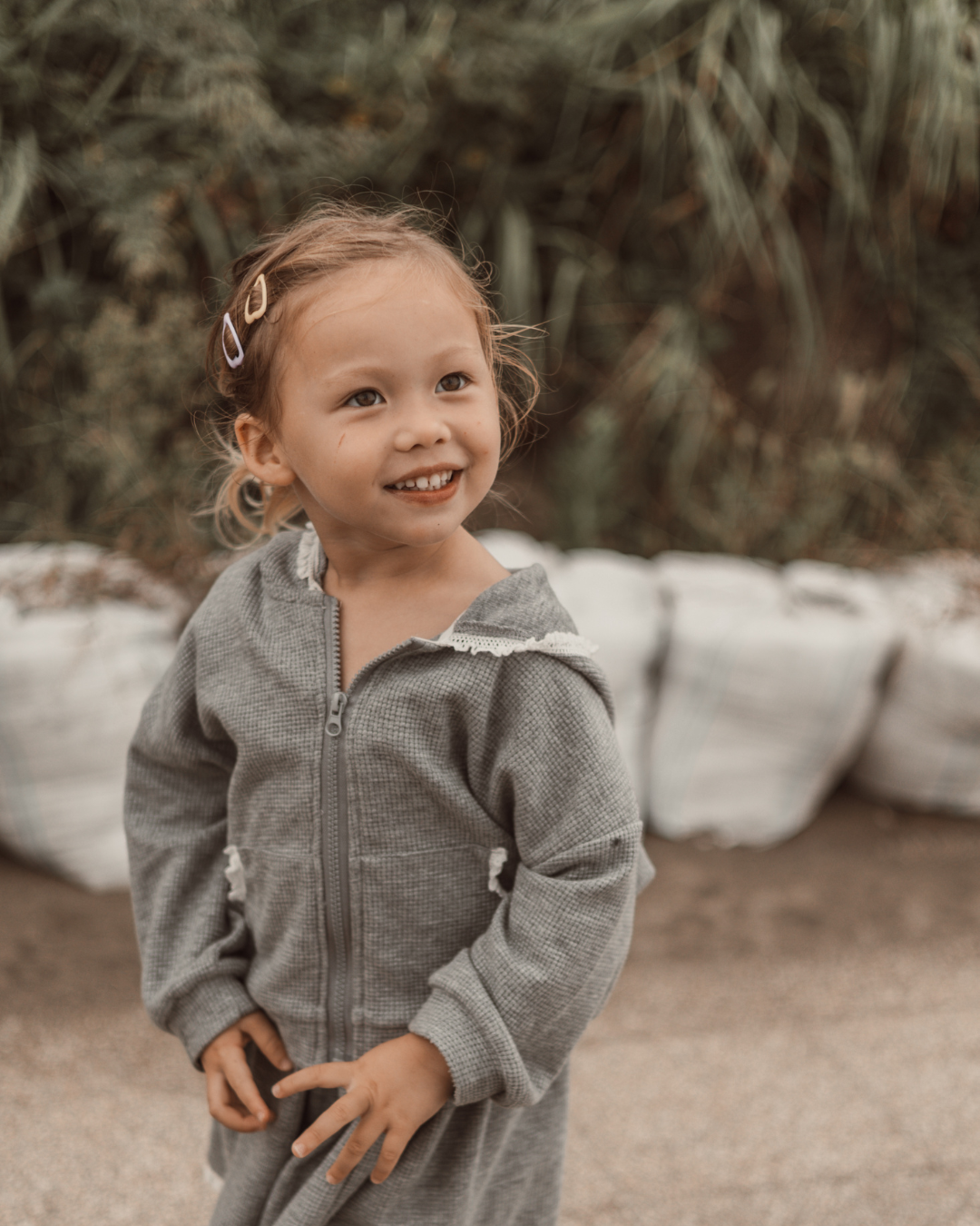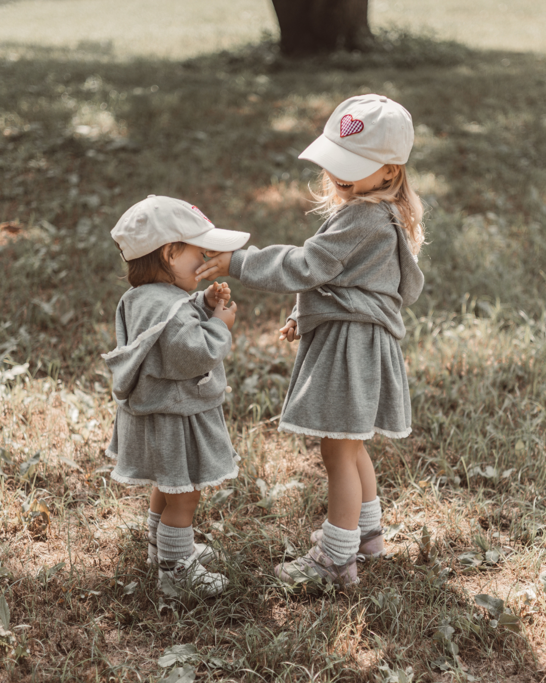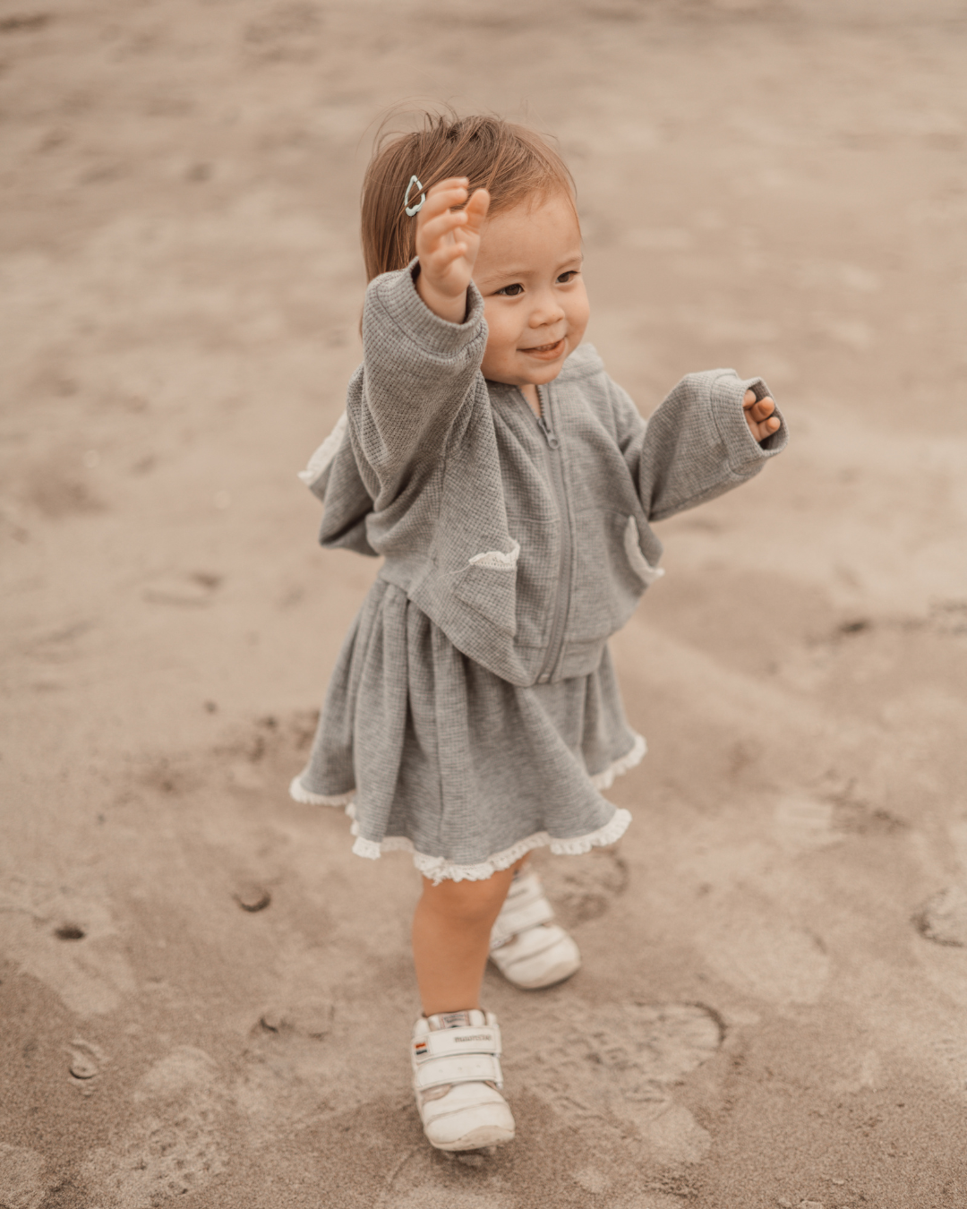 フード付きジップパーカーとふんわりスカートの組み合わせで、カジュアルなのに女の子らしさ満点。