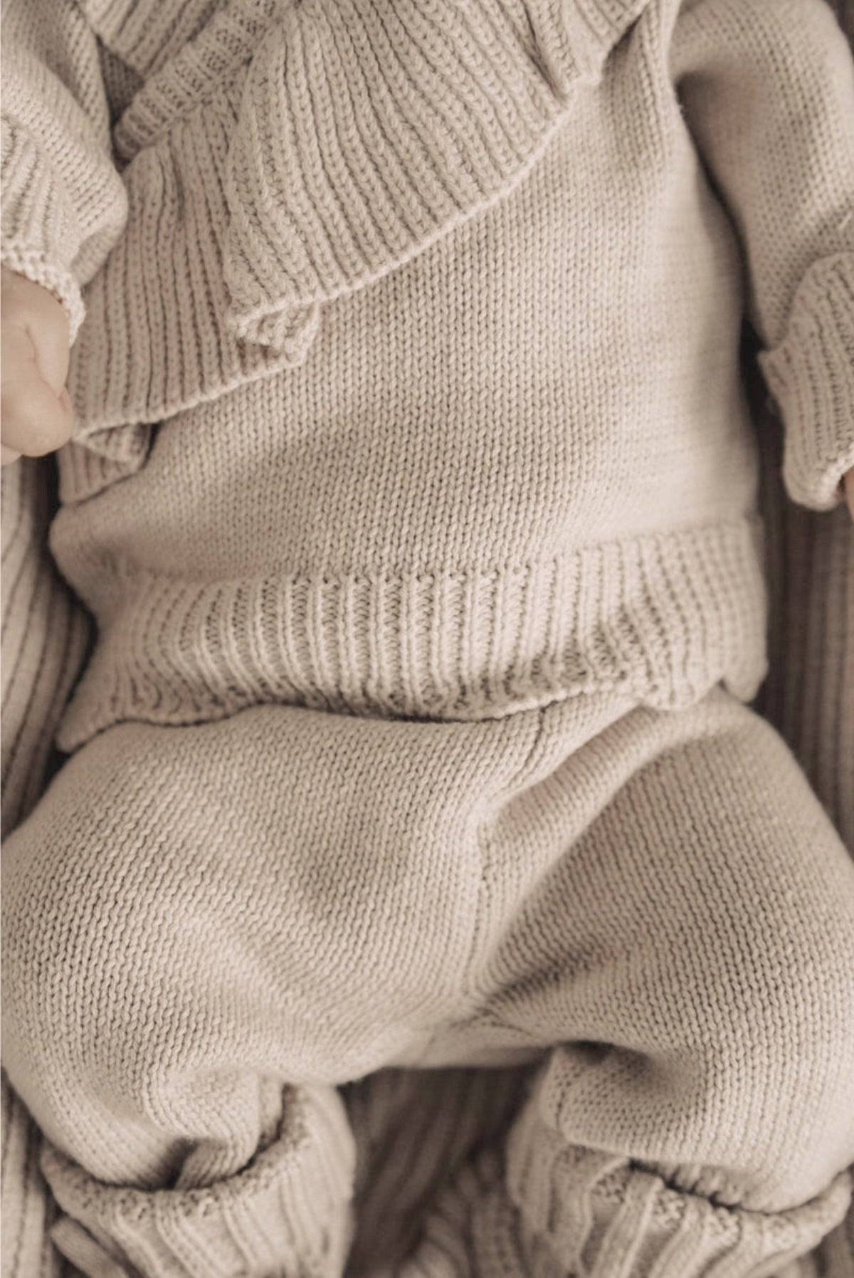 やさしいベージュトーンで仕上げた、ニットトップスとボトムスのセットアップです。