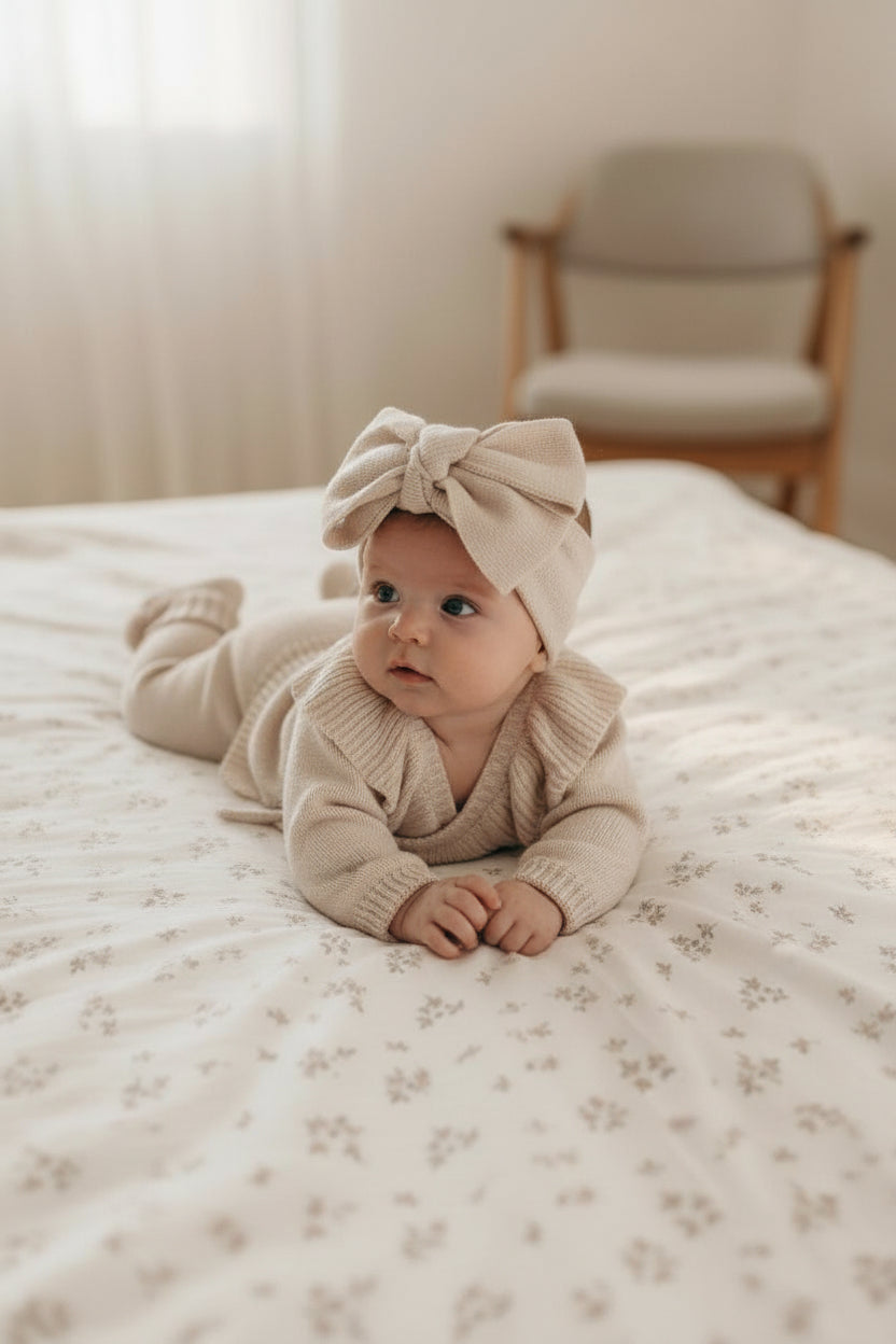 首元のフリルデザインと、ふんわりとした柔らかなシルエットが、赤ちゃんの愛らしさを引き立てます。