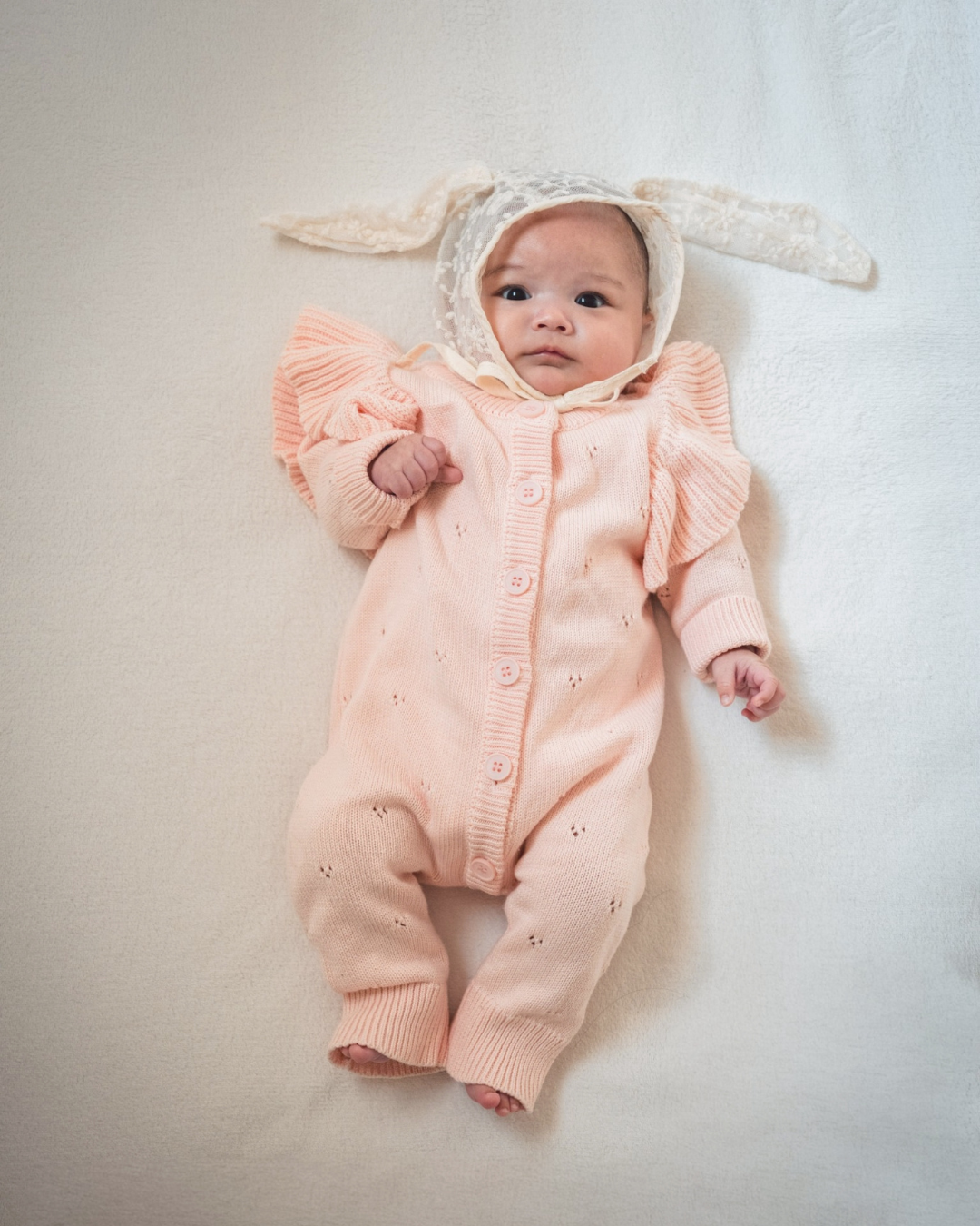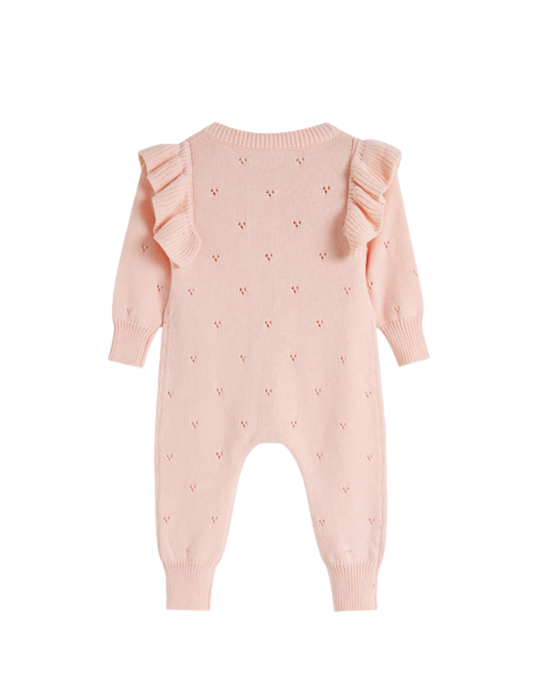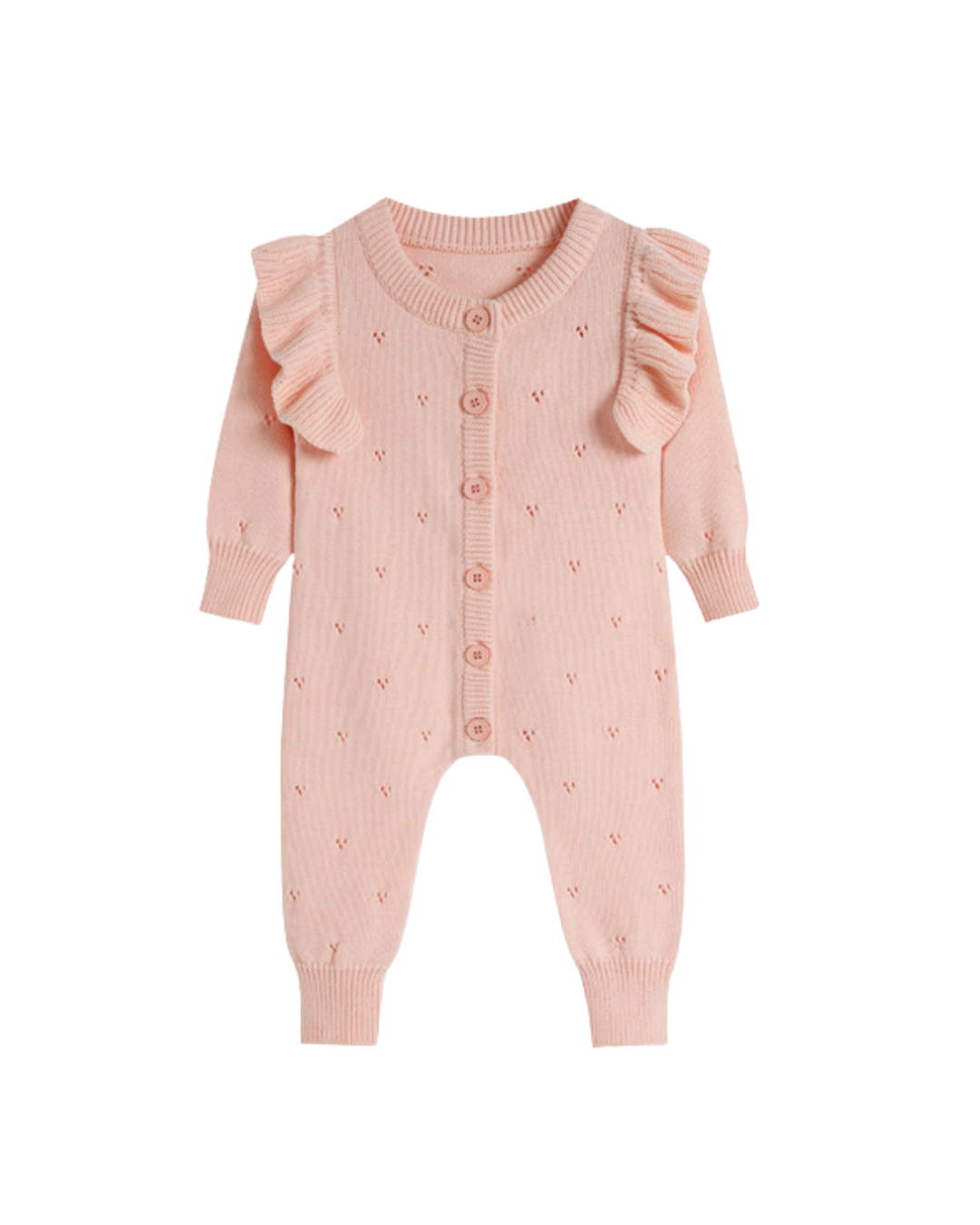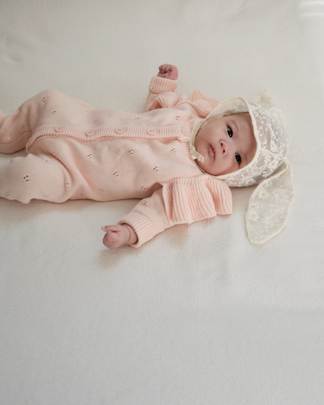 やさしい淡ピンクが赤ちゃんの可愛さを引き立てる、フリルスリーブのニットロンパース。ふんわり広がる肩のフリルと、細やかな編み模様が上品で、特別な1日にぴったりの一着です。