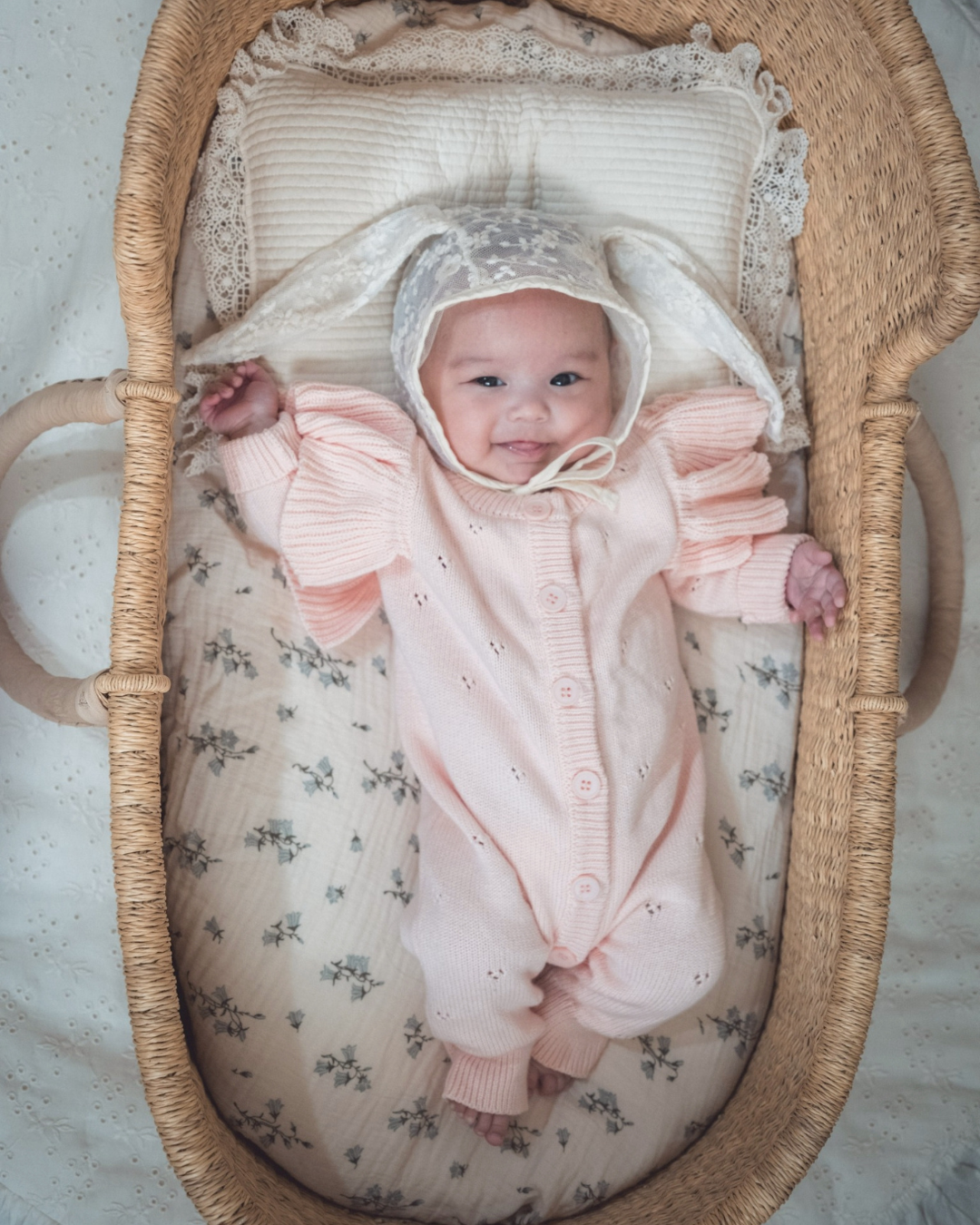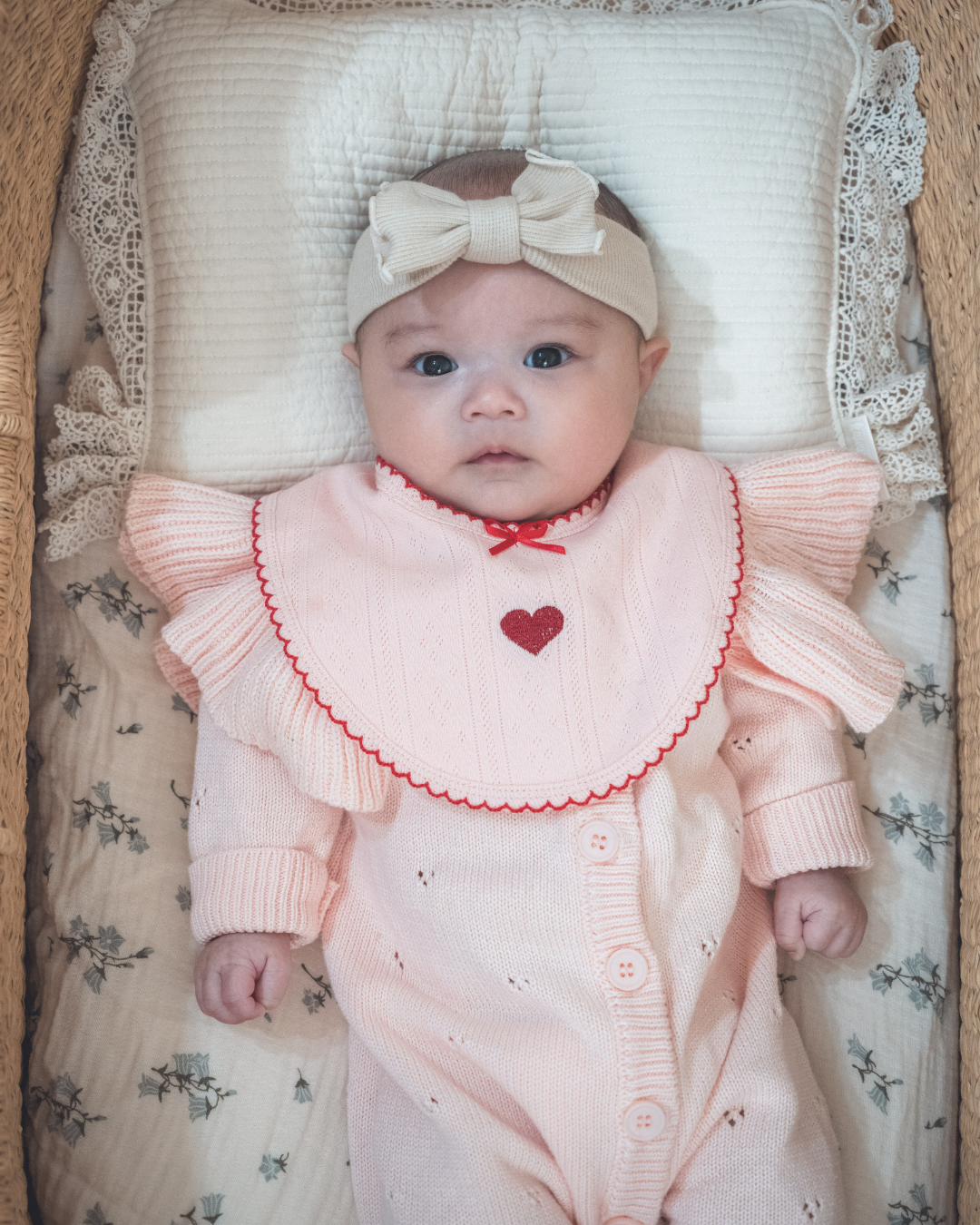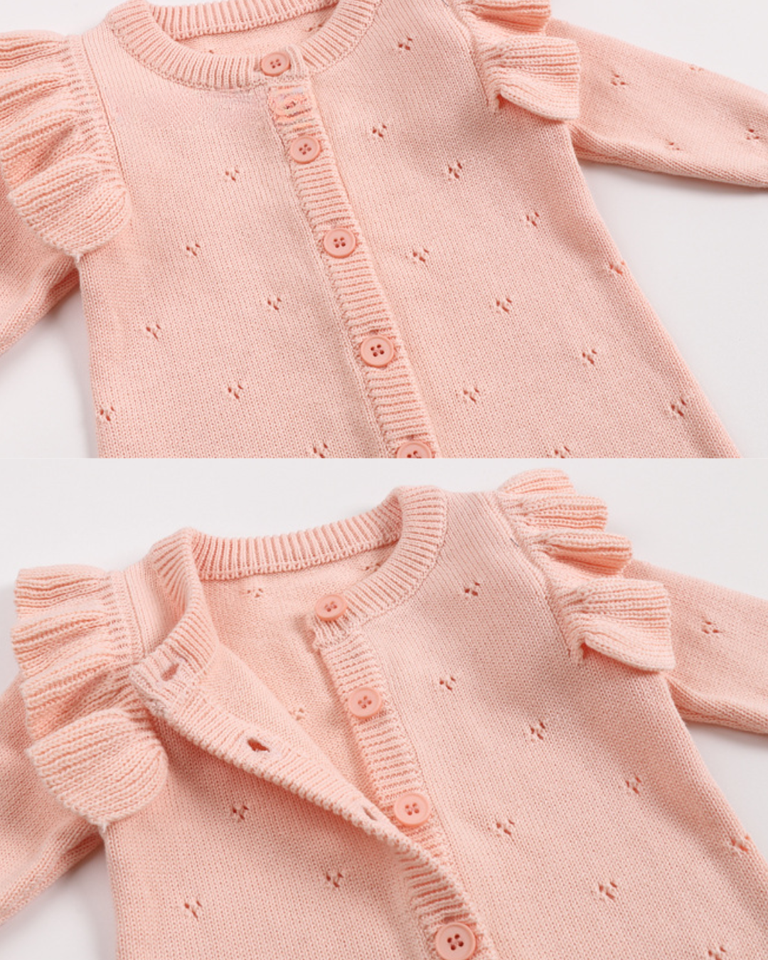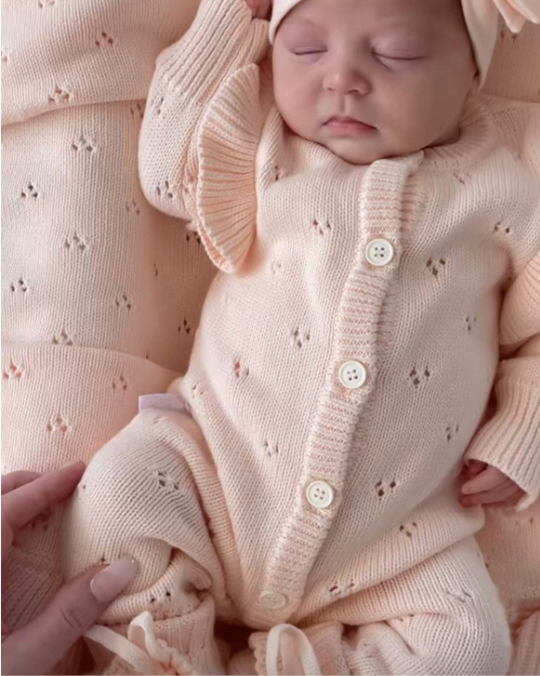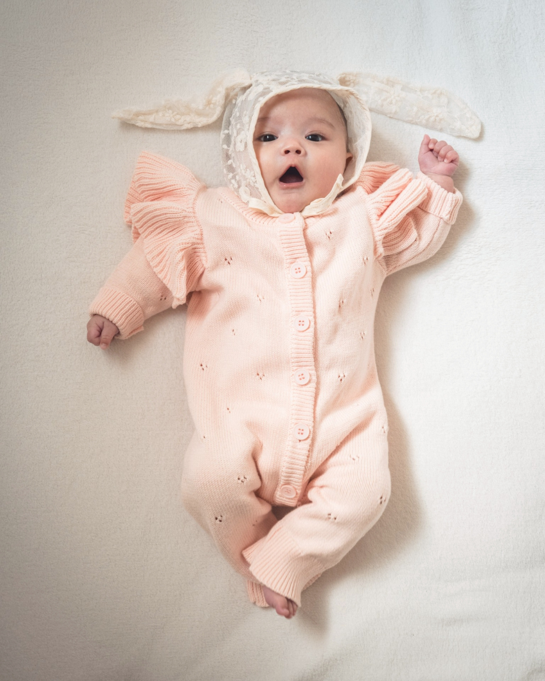 やさしい淡ピンクが赤ちゃんの可愛さを引き立てる、フリルスリーブのニットロンパース。ふんわり広がる肩のフリルと、細やかな編み模様が上品で、特別な1日にぴったりの一着です。
