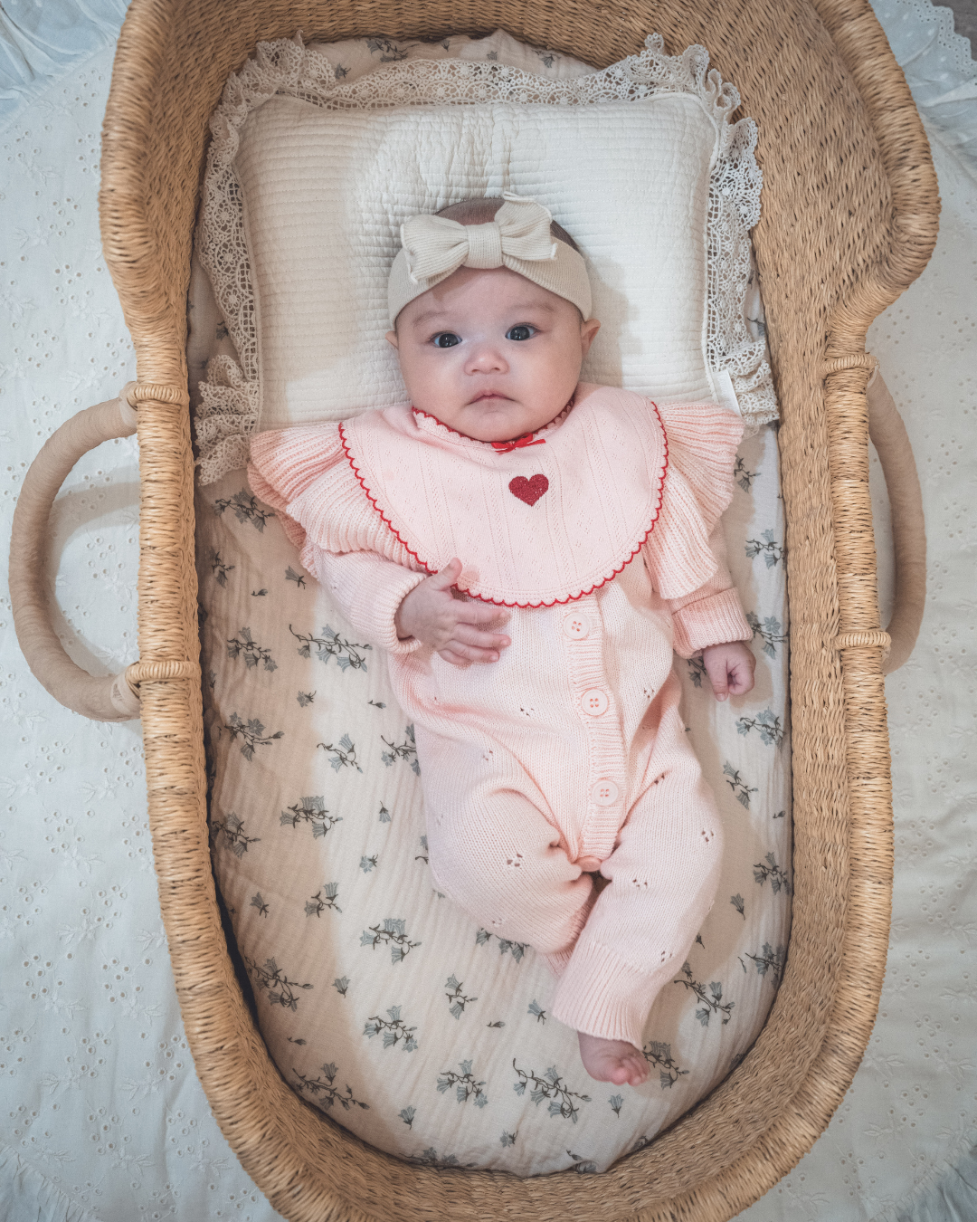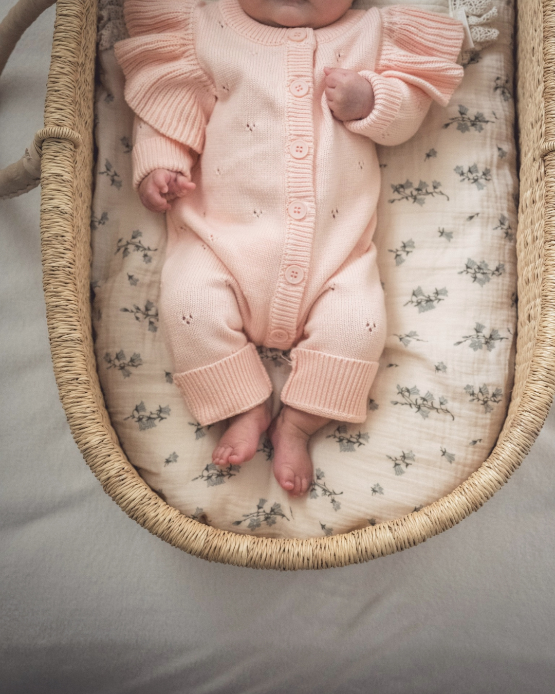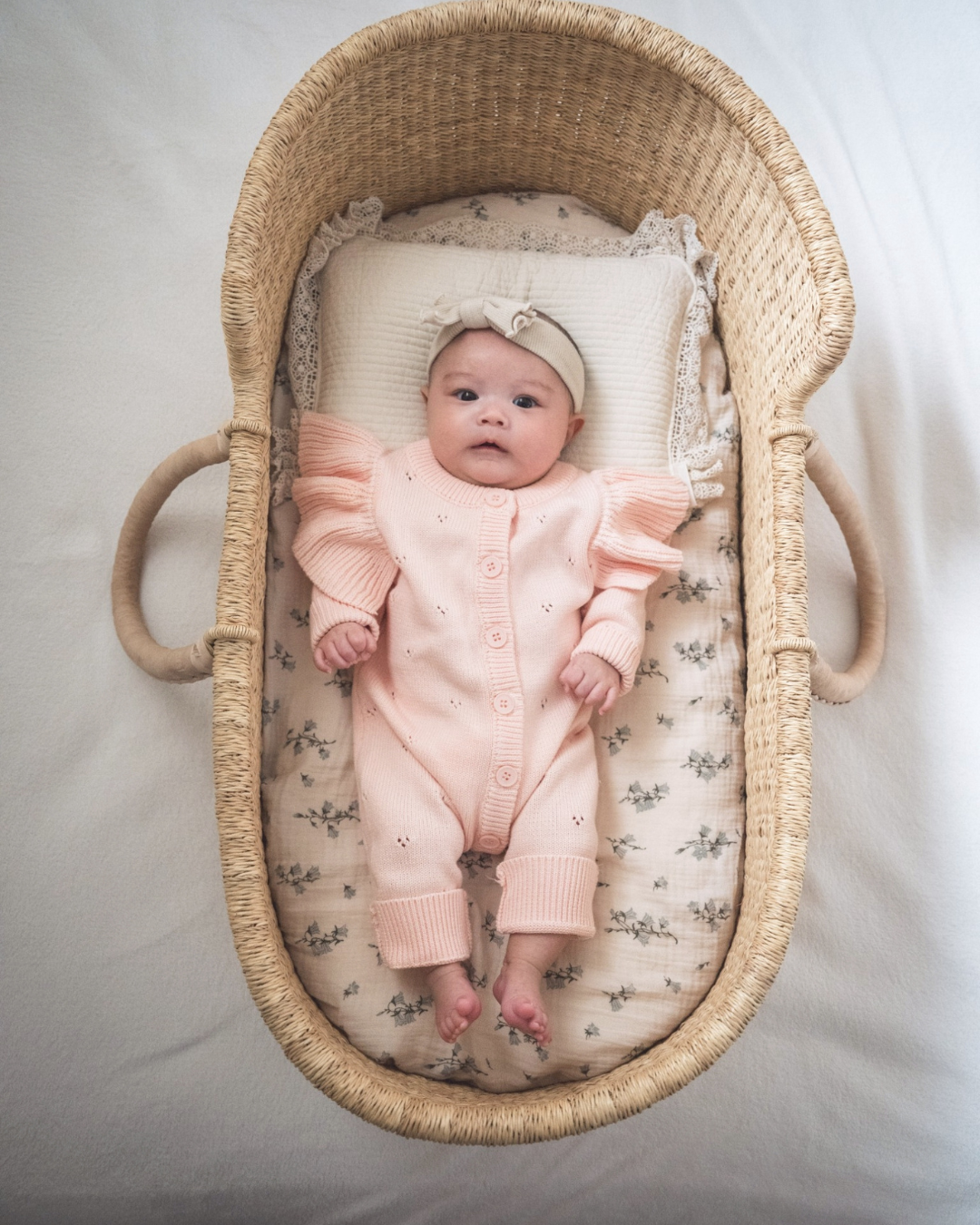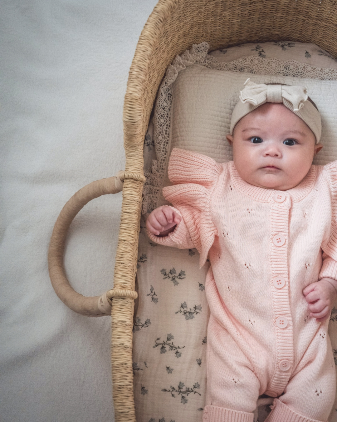 やさしい淡ピンクが赤ちゃんの可愛さを引き立てる、フリルスリーブのニットロンパース。ふんわり広がる肩のフリルと、細やかな編み模様が上品で、特別な1日にぴったりの一着です。