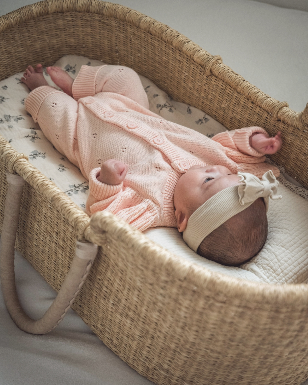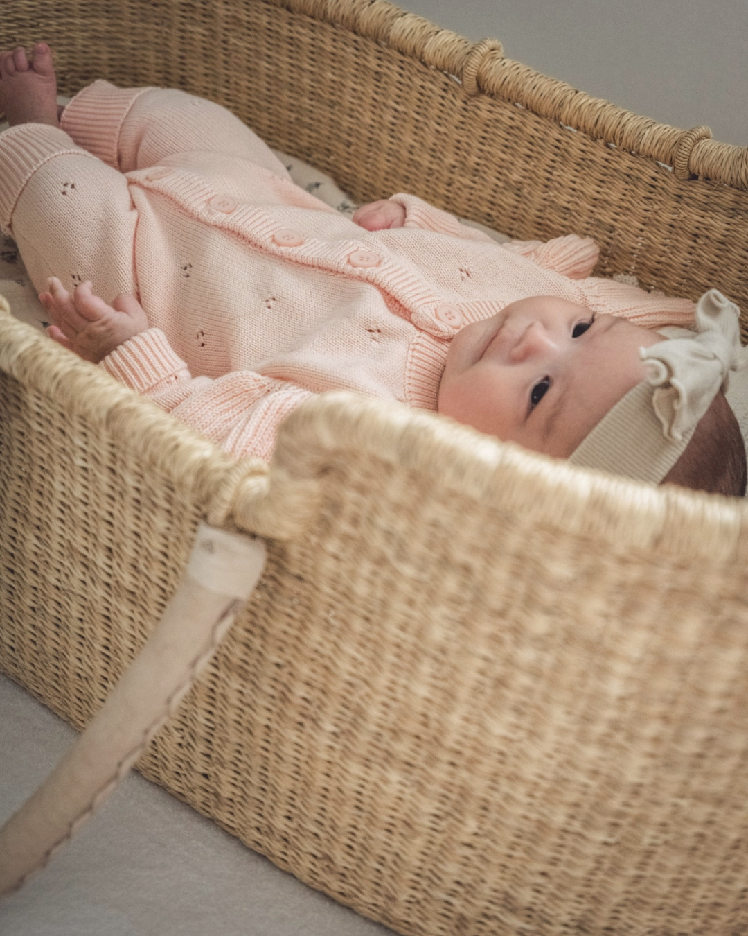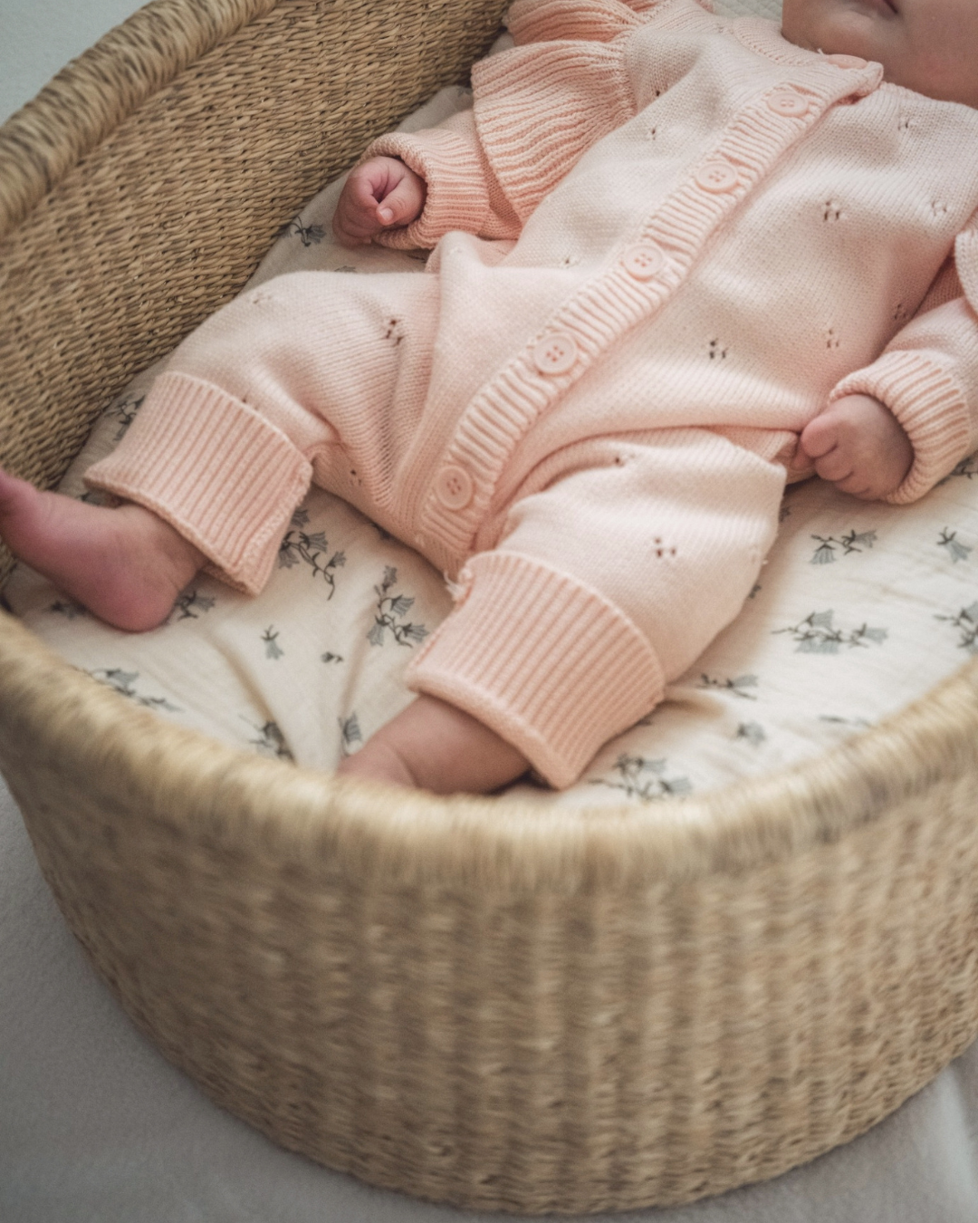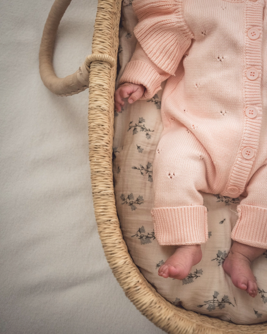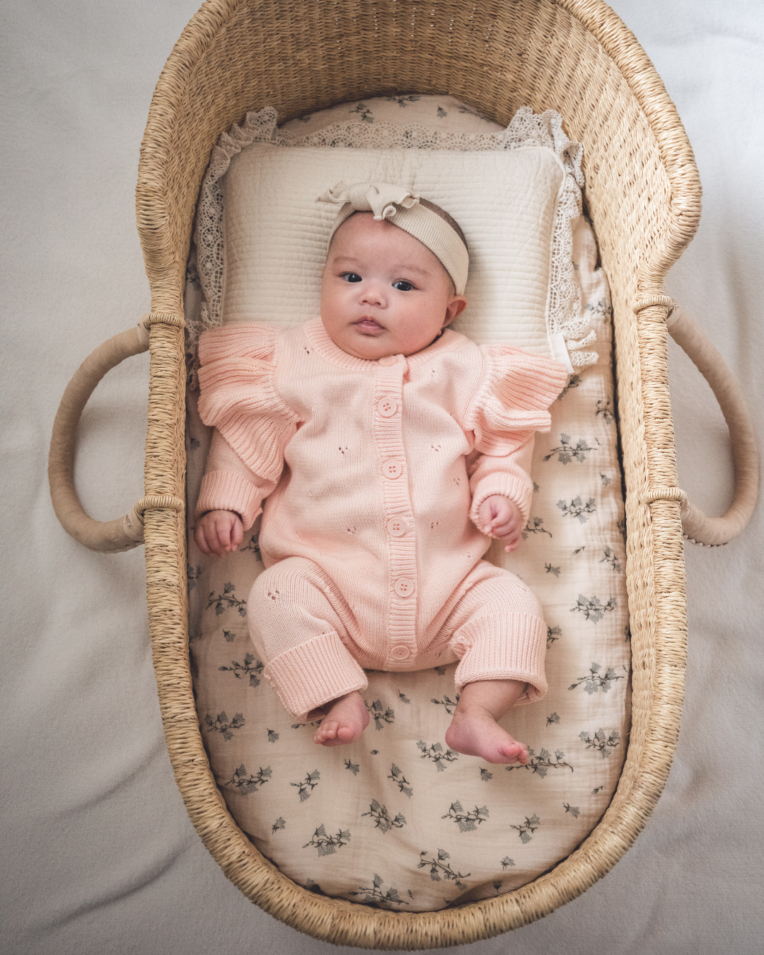 やさしい淡ピンクが赤ちゃんの可愛さを引き立てる、フリルスリーブのニットロンパース。ふんわり広がる肩のフリルと、細やかな編み模様が上品で、特別な1日にぴったりの一着です。