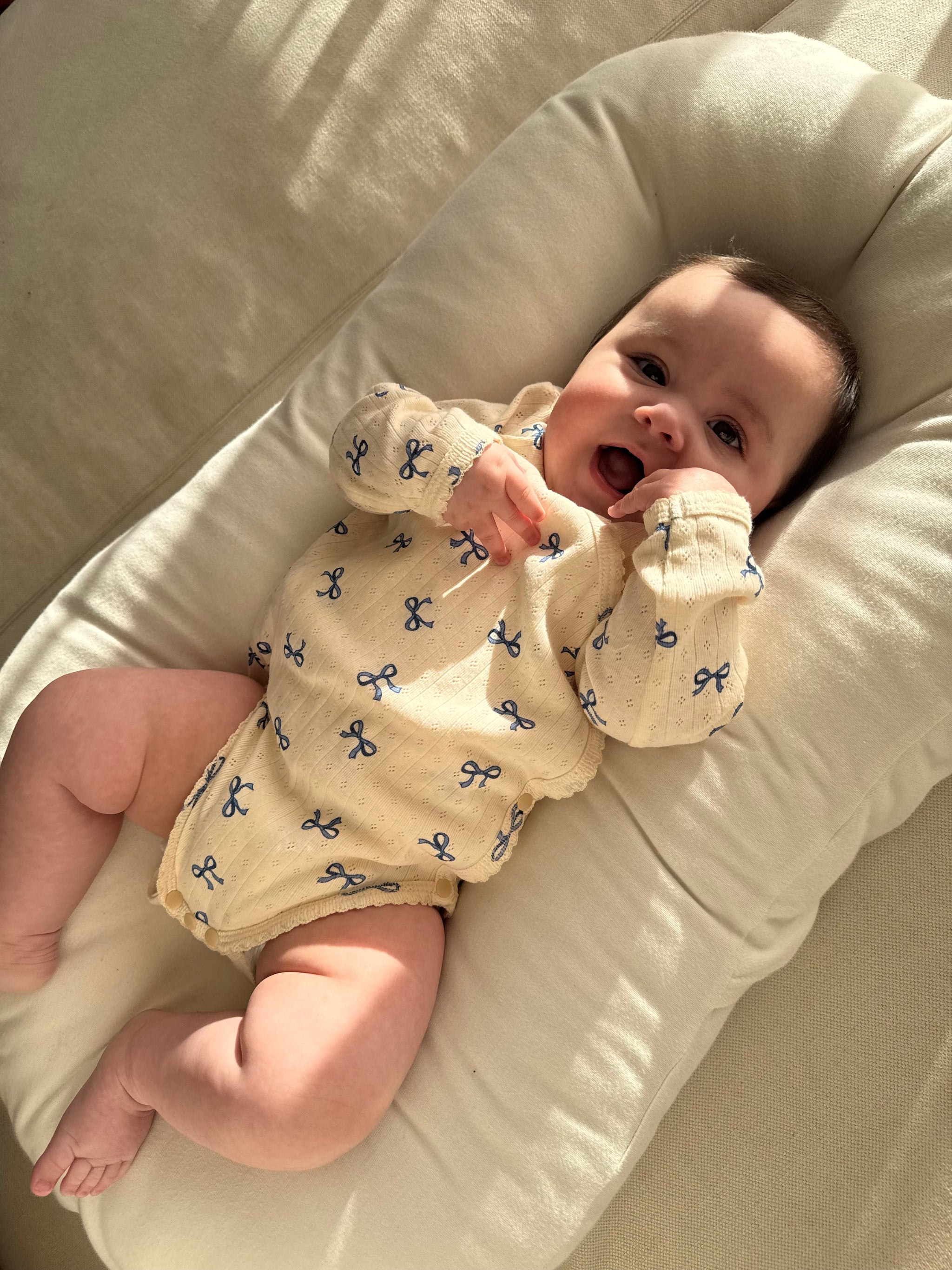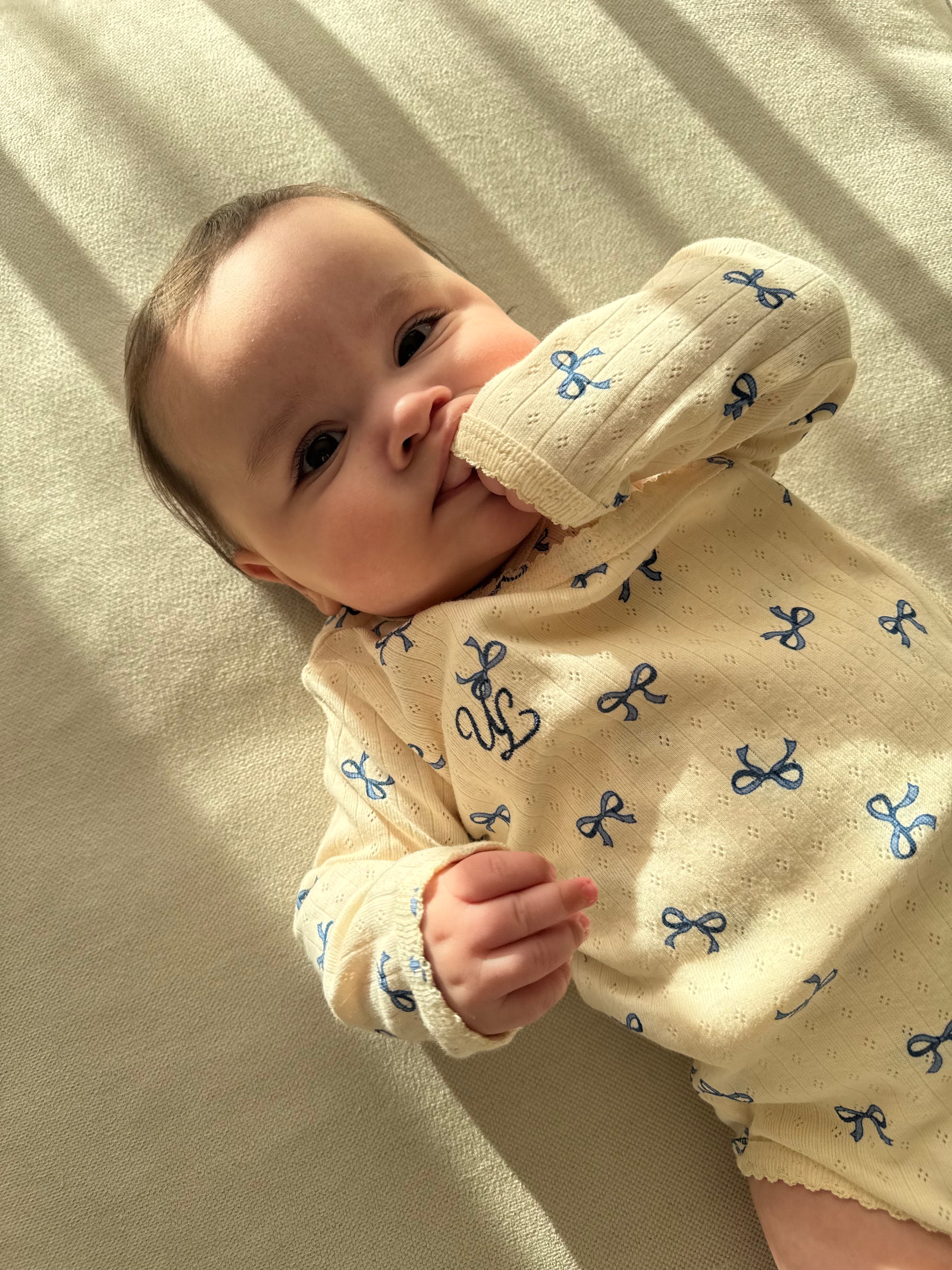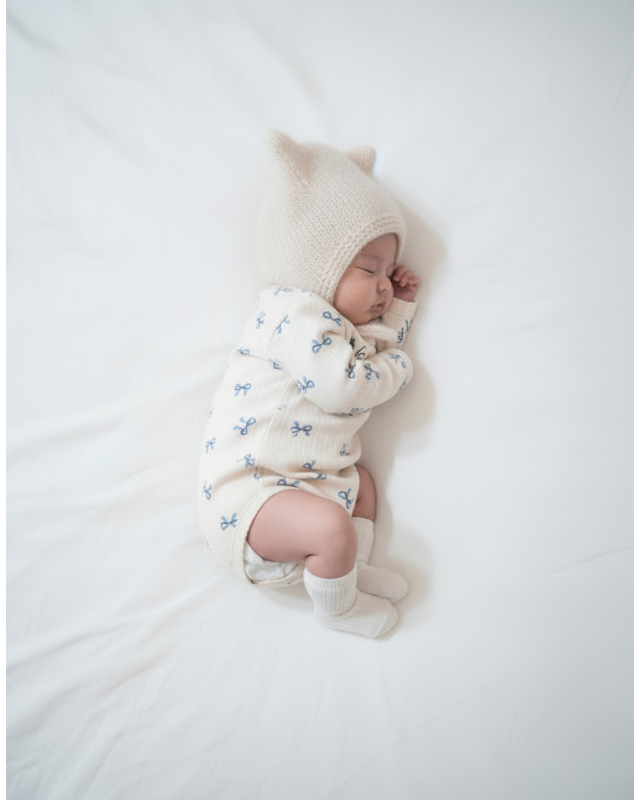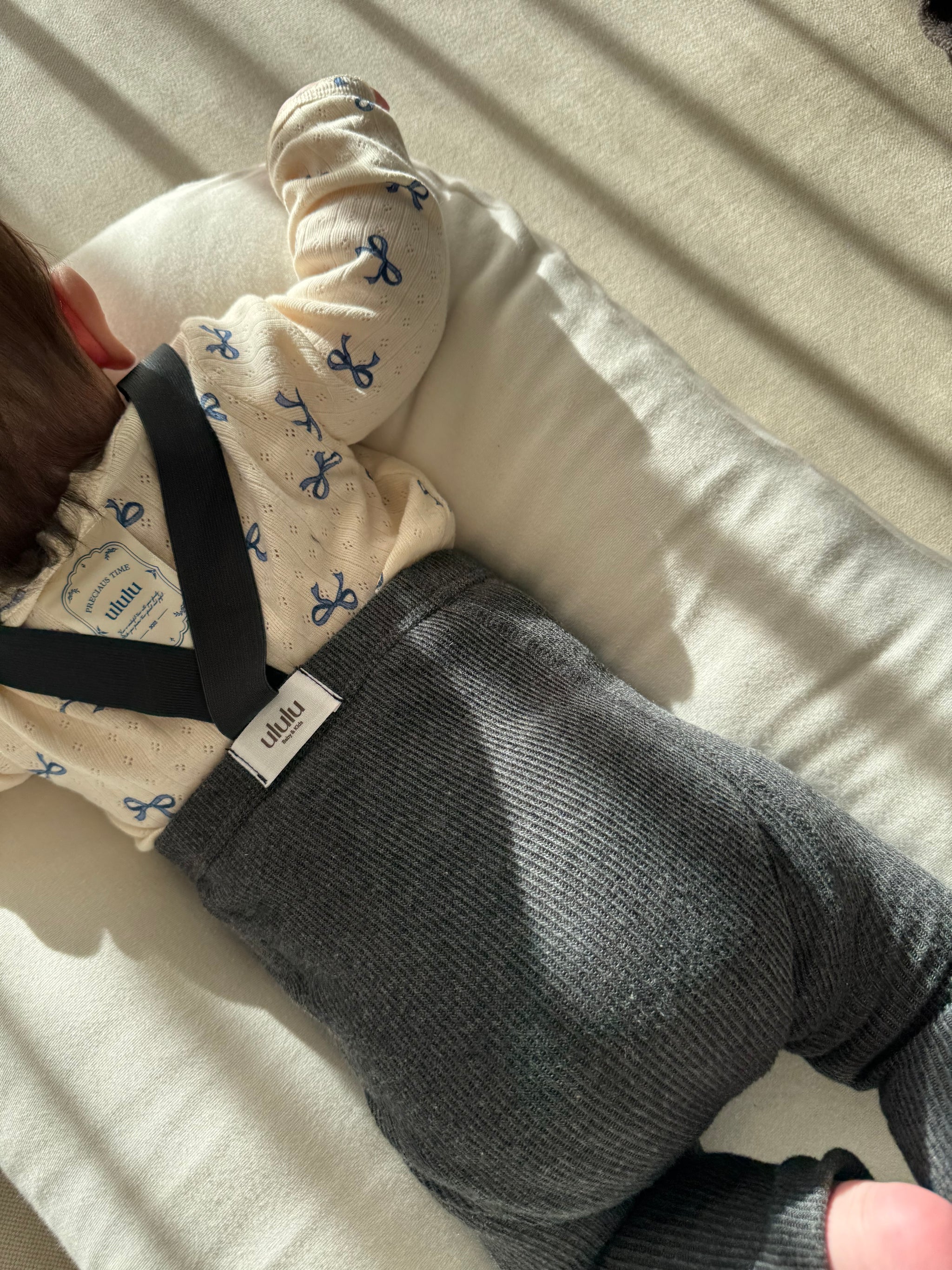 全体に散りばめられたリボンと、ナチュラルカラーのリブ素材がやさしい雰囲気を演出します。