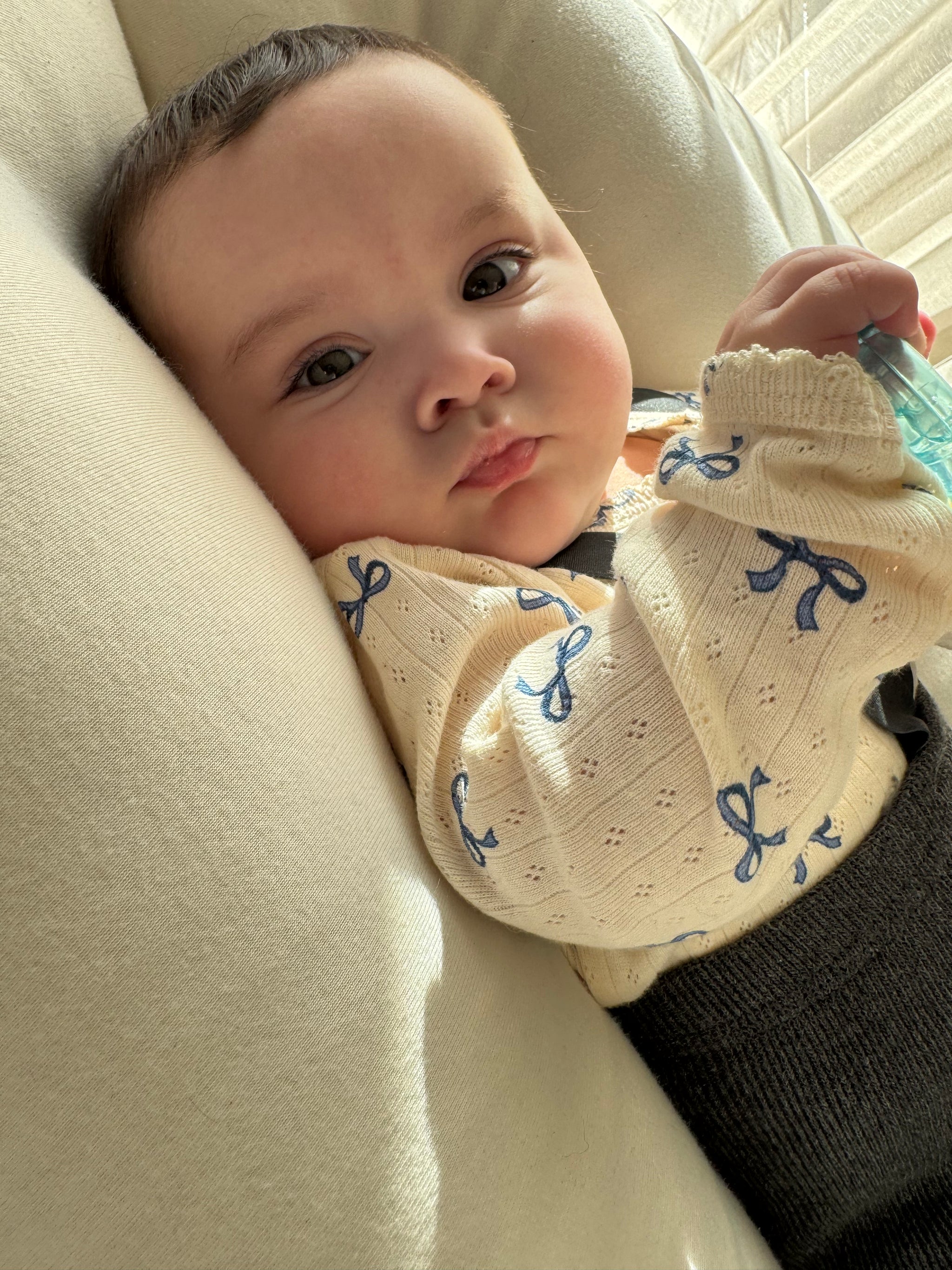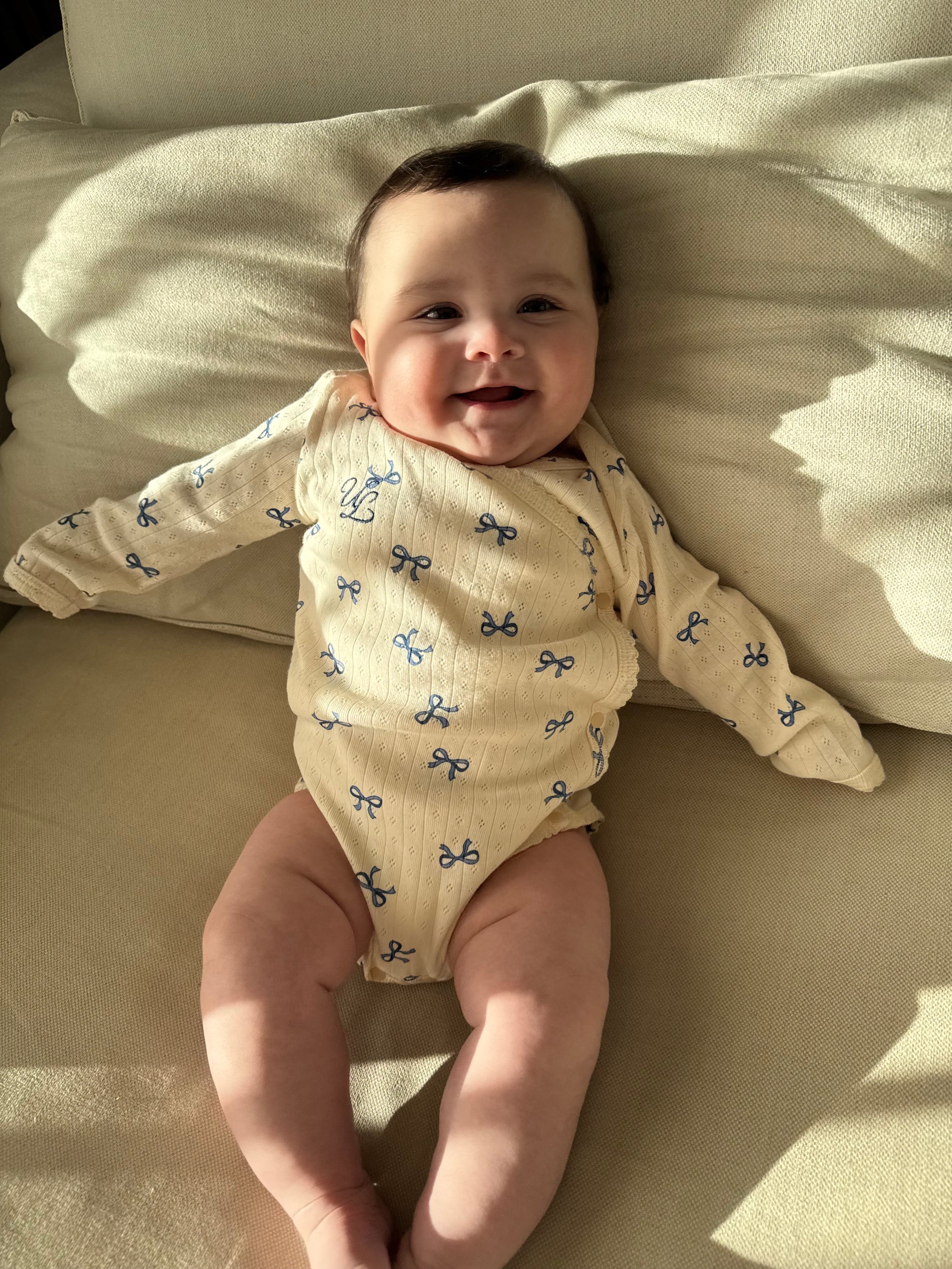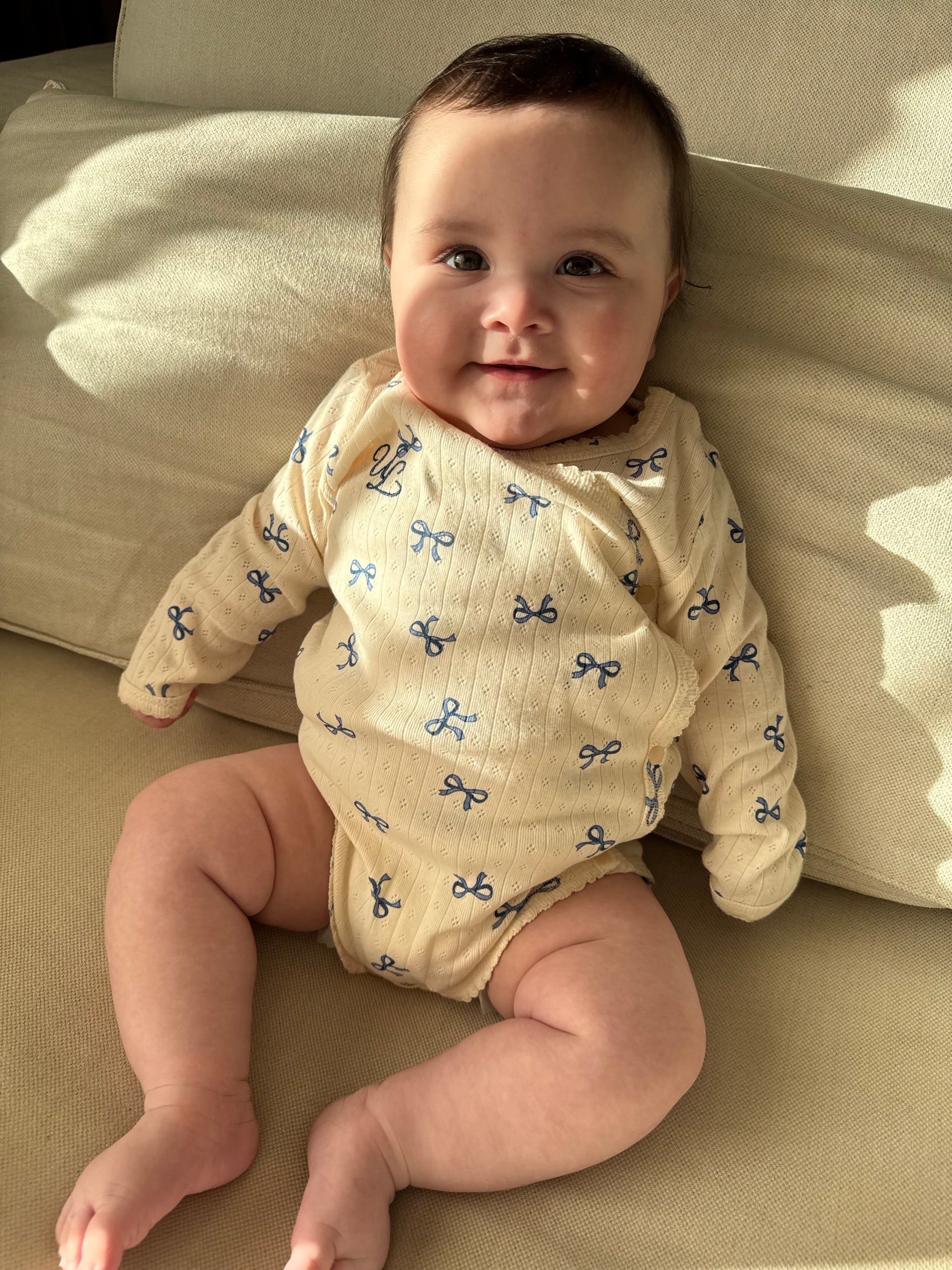 全体に散りばめられたリボンと、ナチュラルカラーのリブ素材がやさしい雰囲気を演出します。