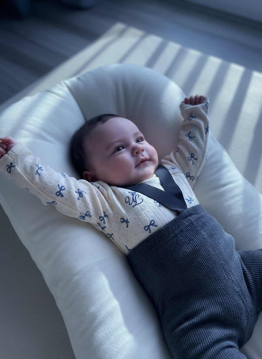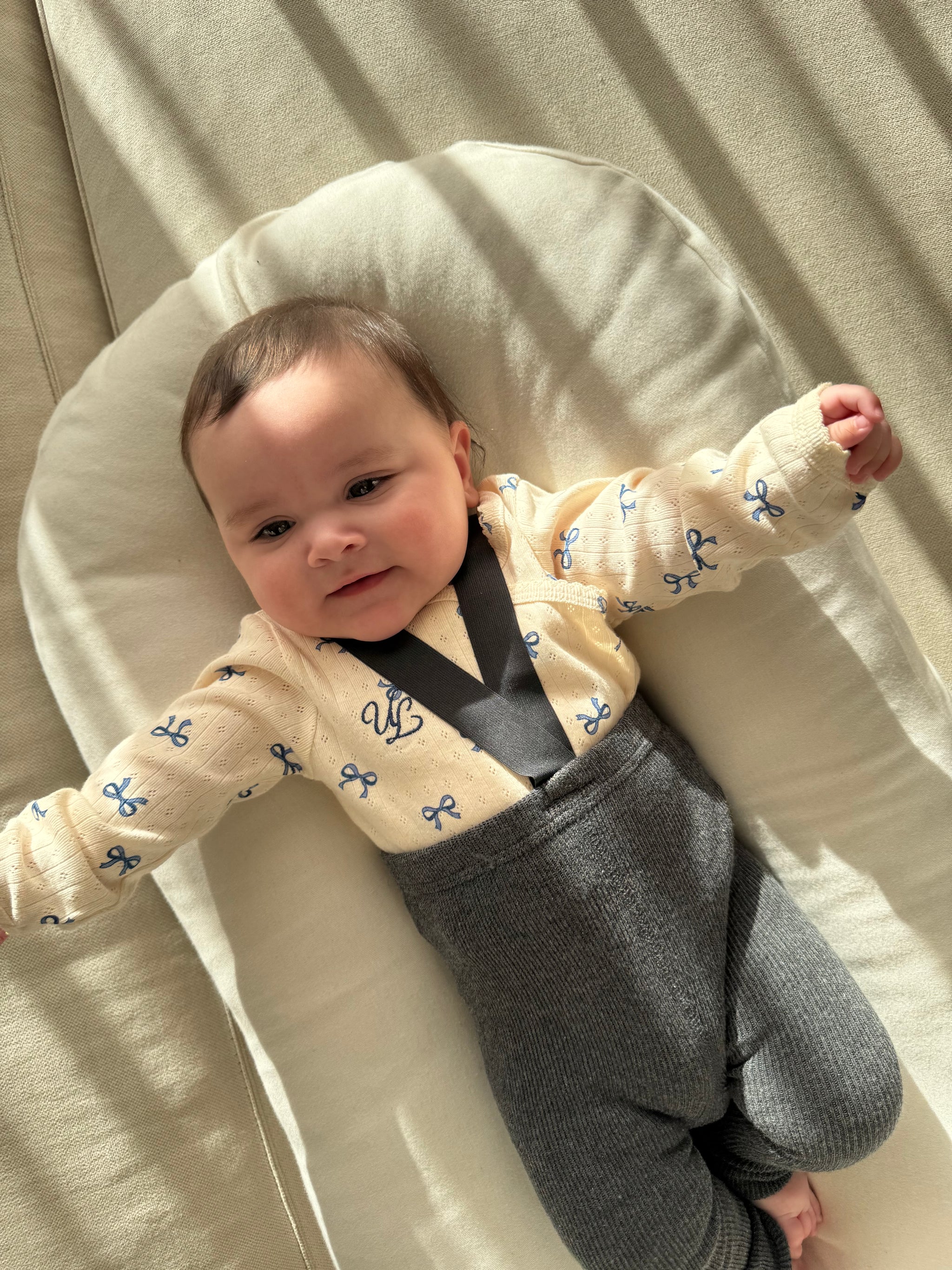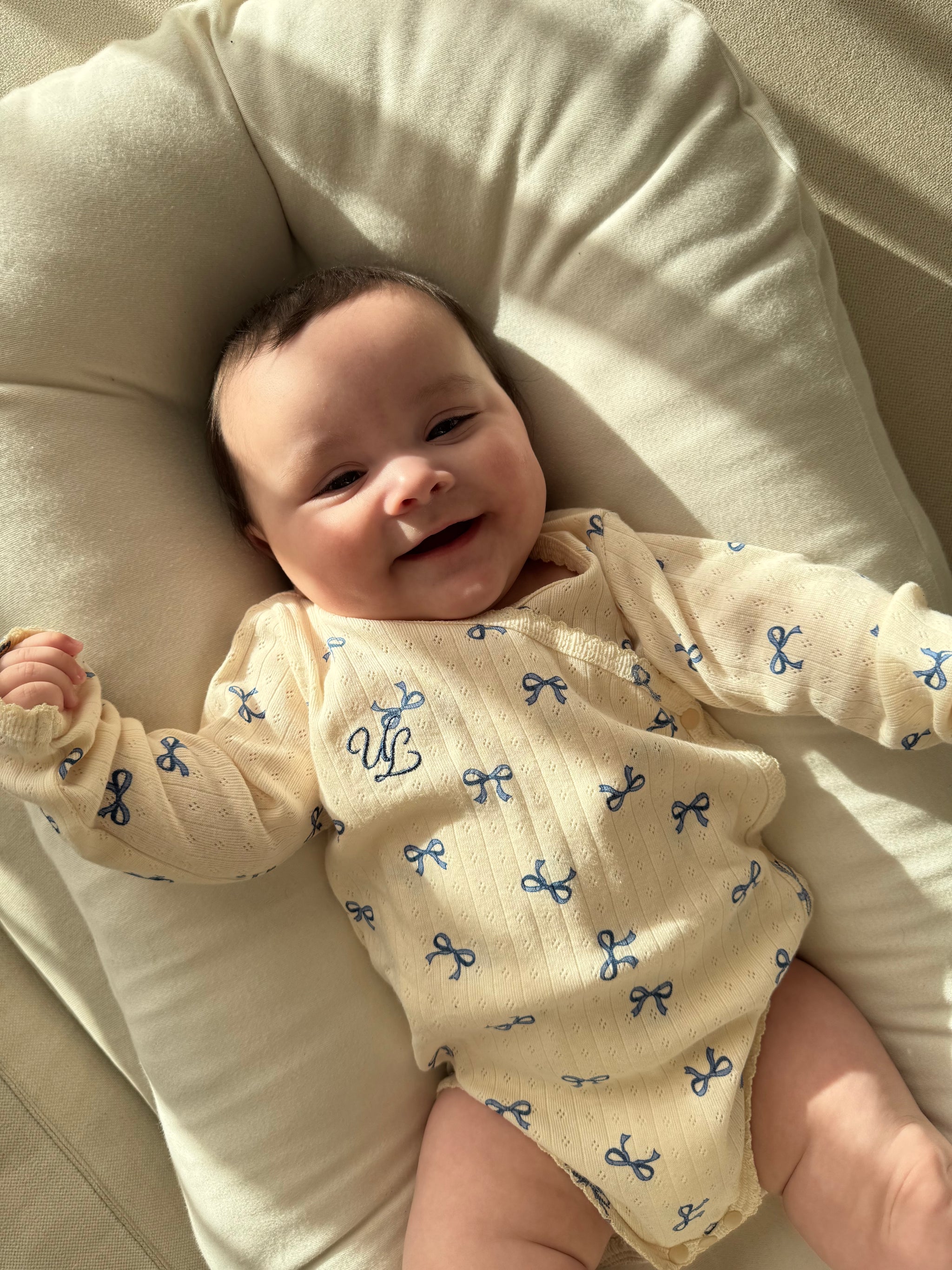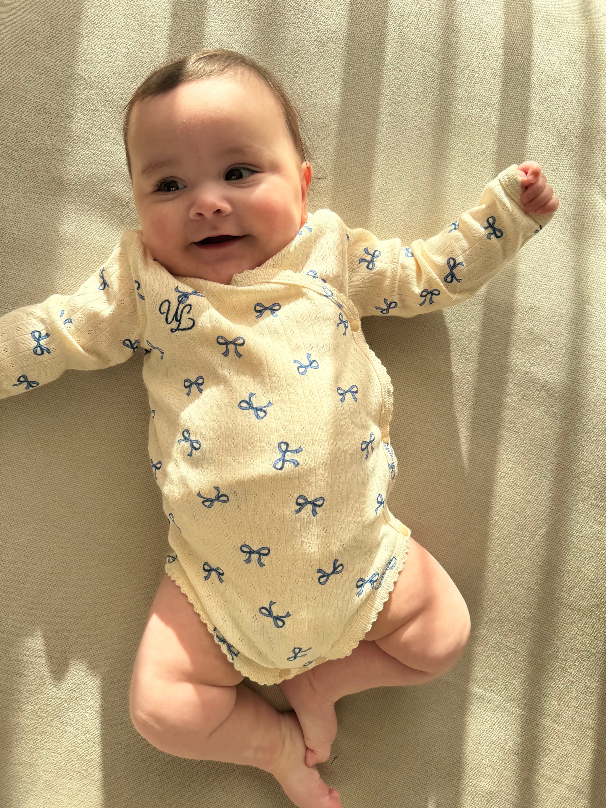 胸元にはさりげなく「UL」ロゴ刺繍を施した、当店限定デザインのオリジナルロンパース。